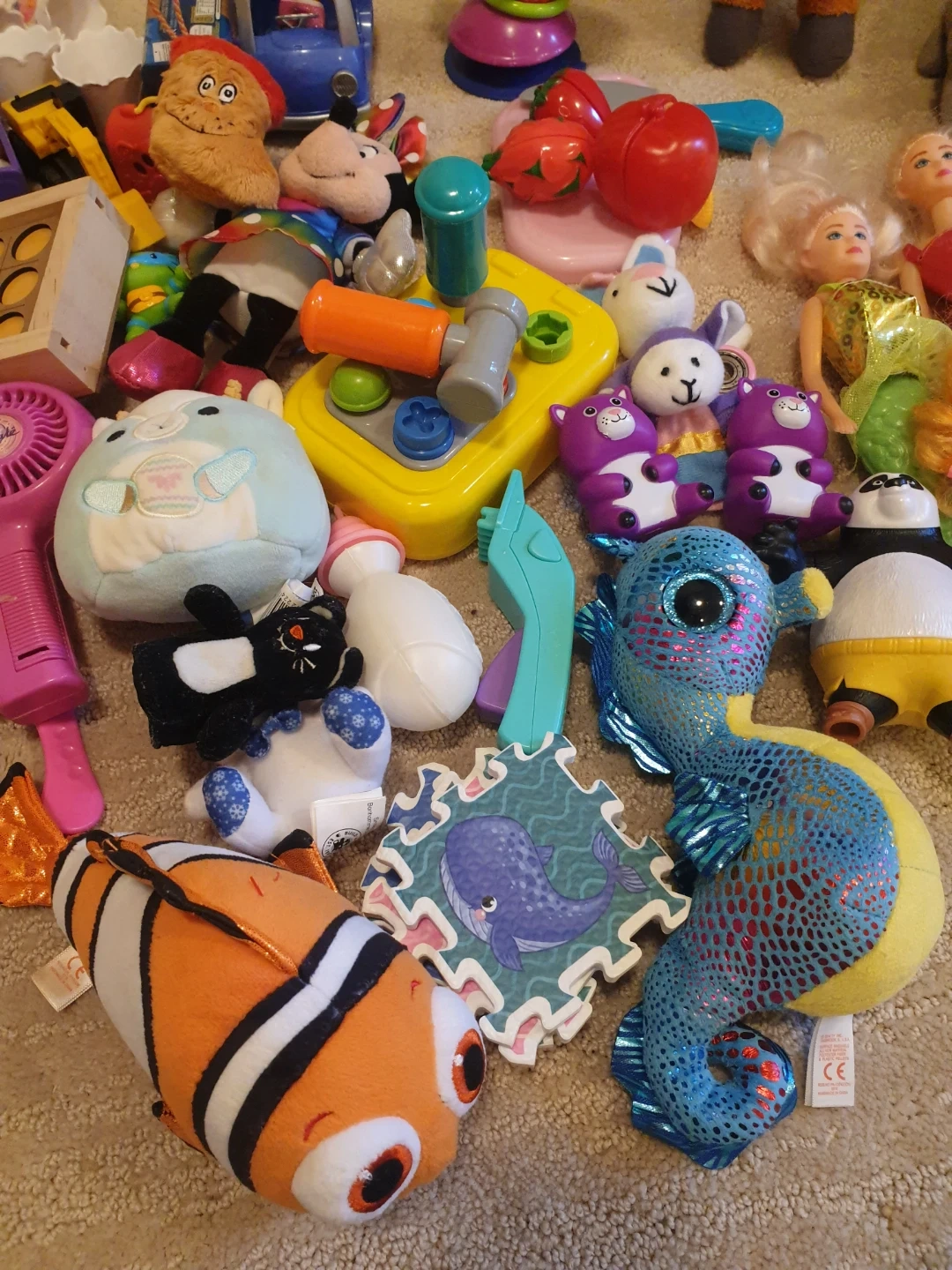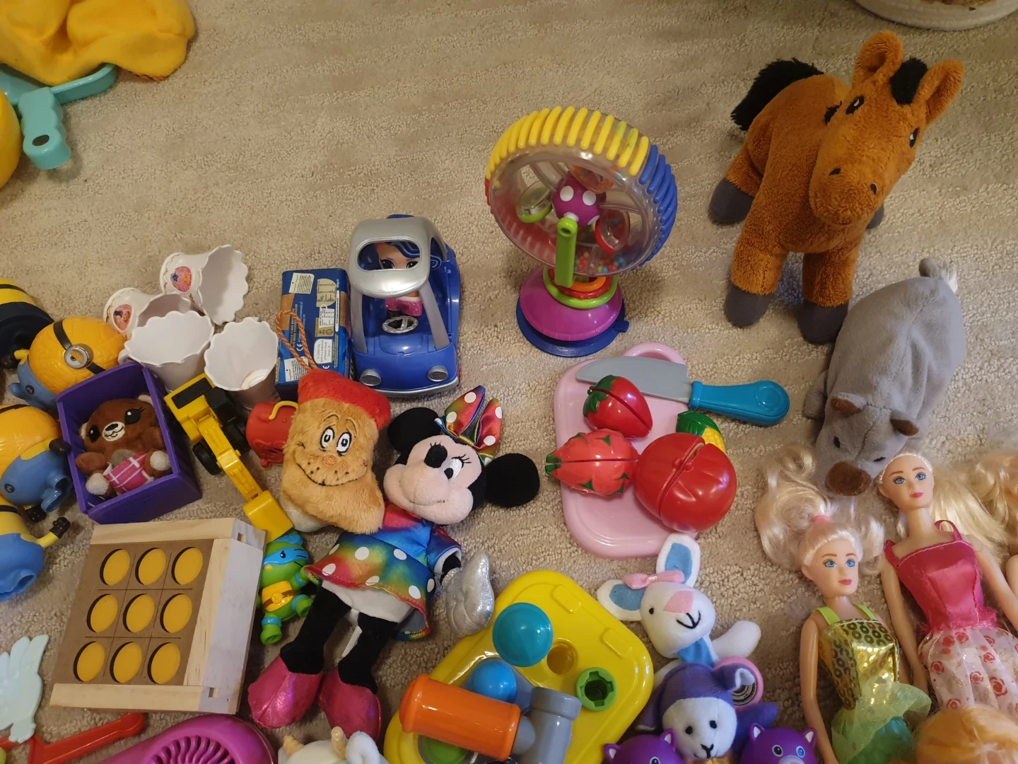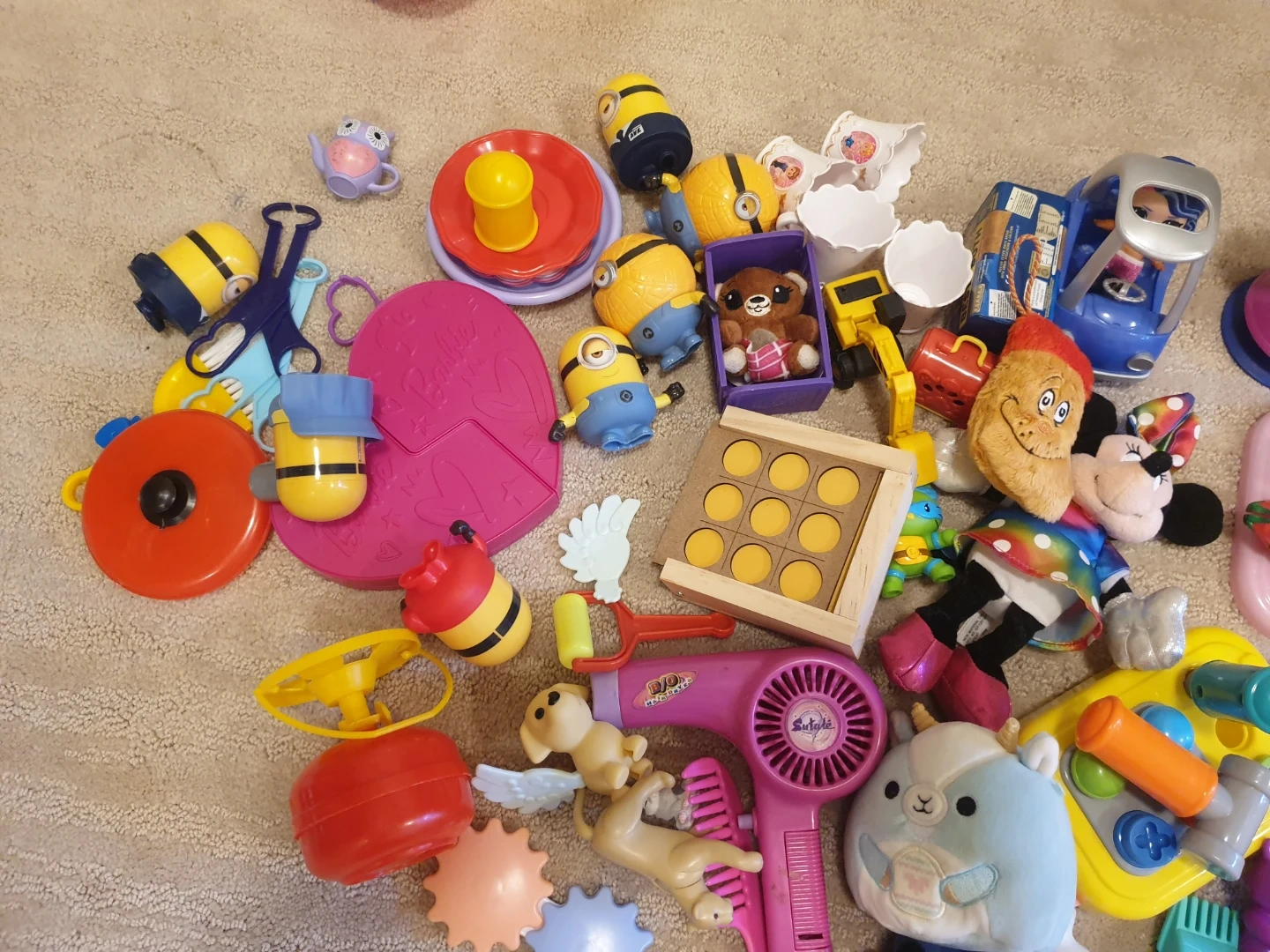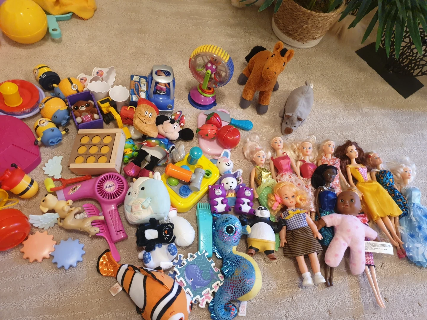 A collection of various dolls, including Barbie-style figures and other character toys. It also contains assorted play accessories like a toy hairdryer and kitchen items. These toys are great for imaginative play and can provide hours of entertainment.