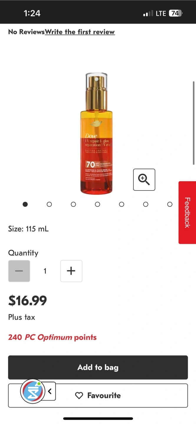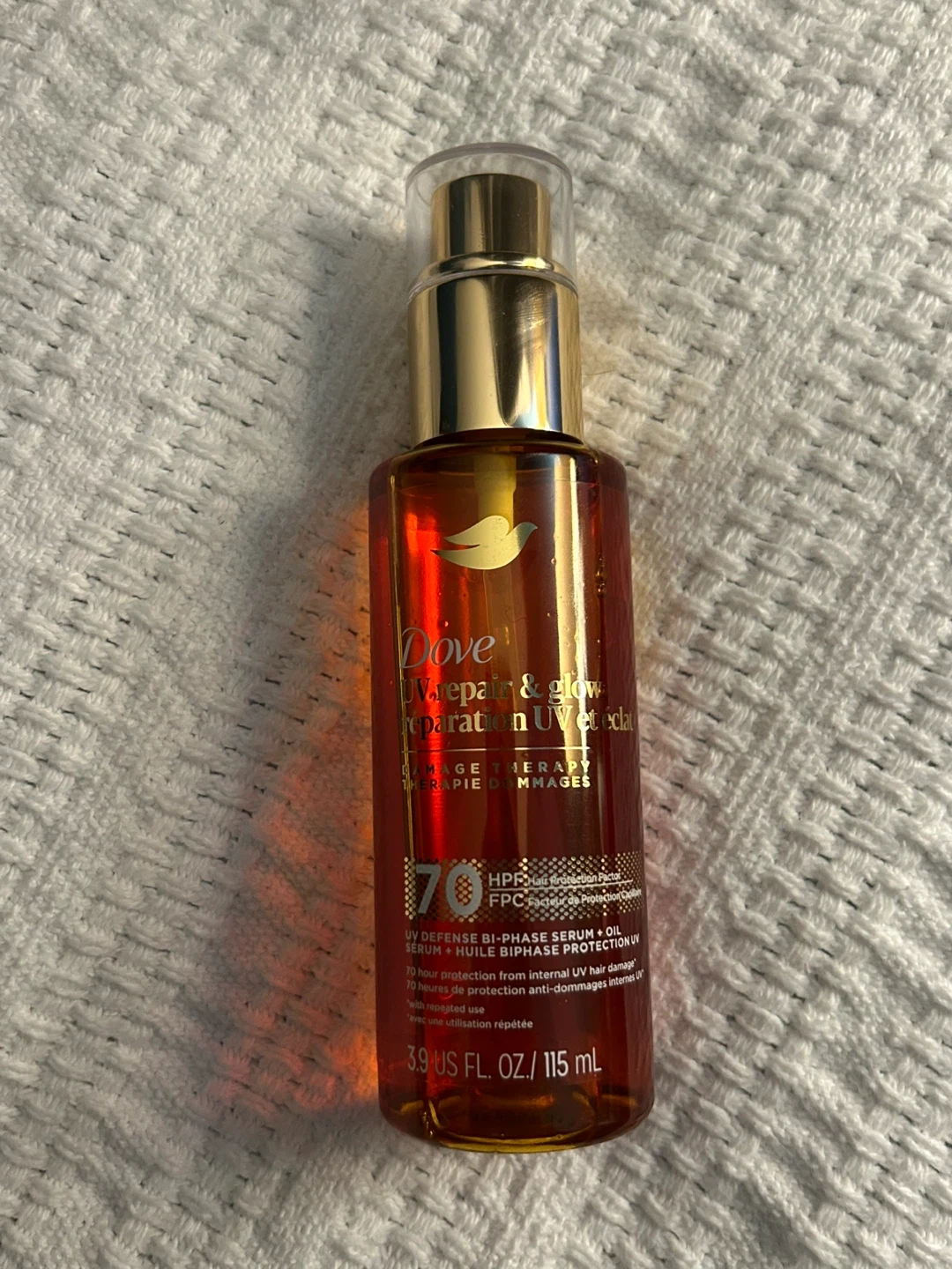 Dove UV Repair & Glow repairing oil. It offers 70-hour protection from internal UV hair damage. 115 mL bottle.