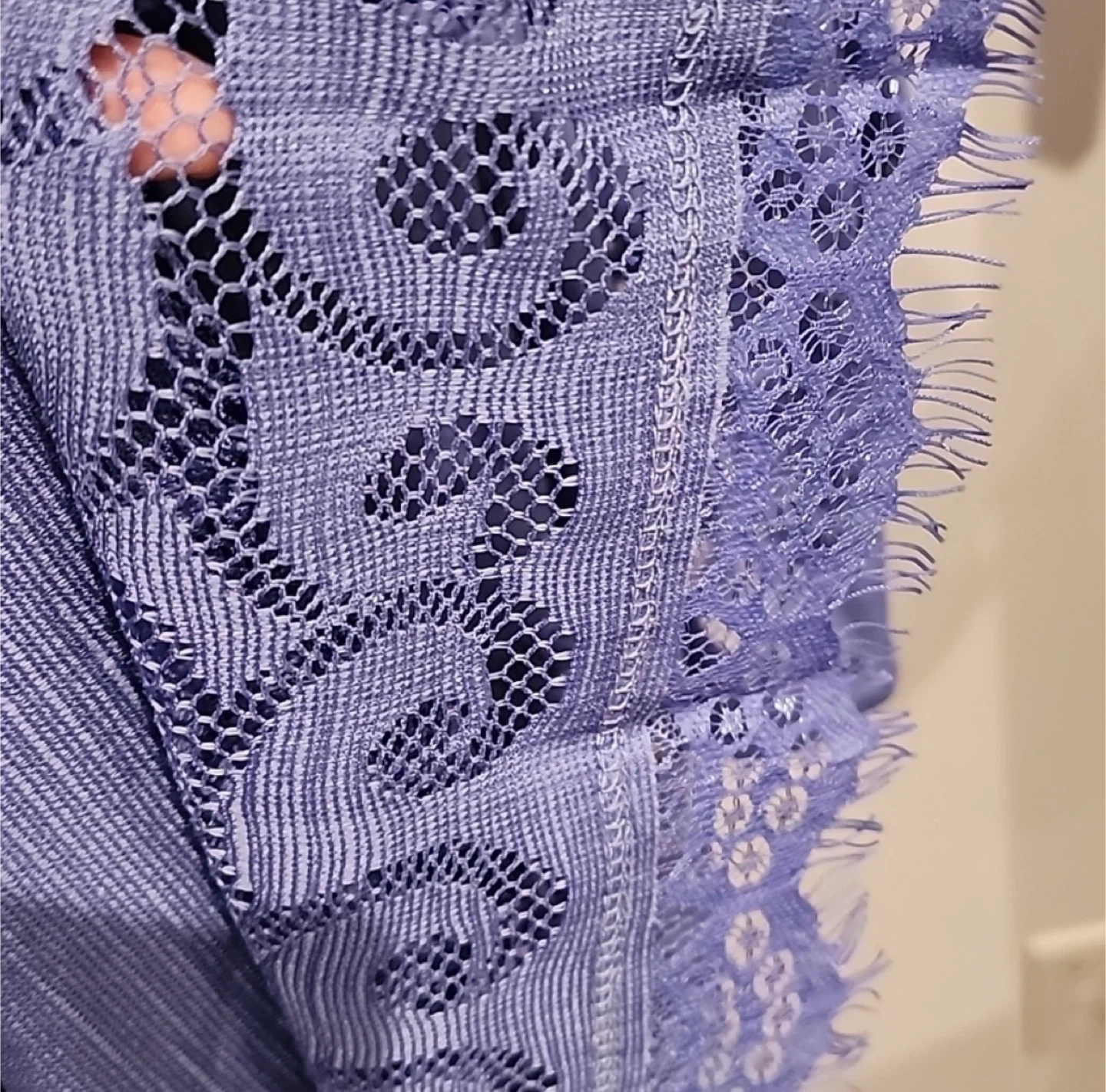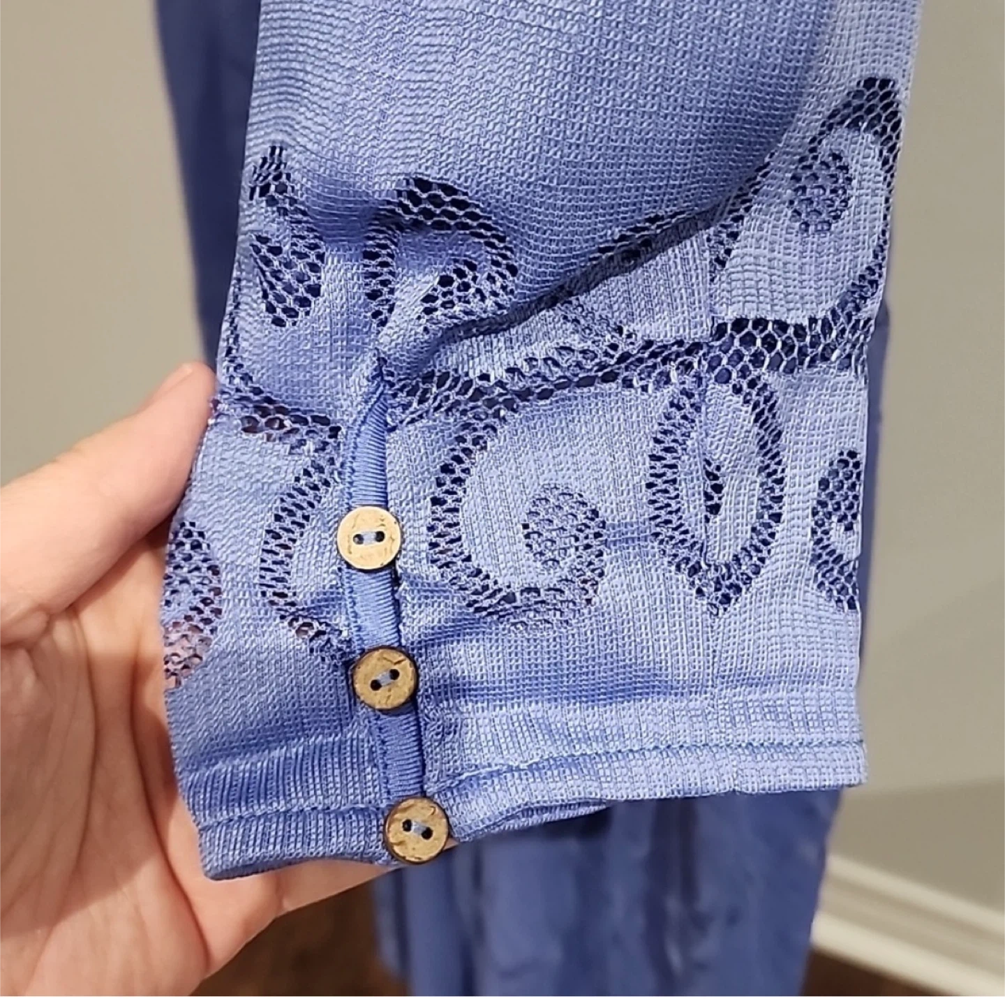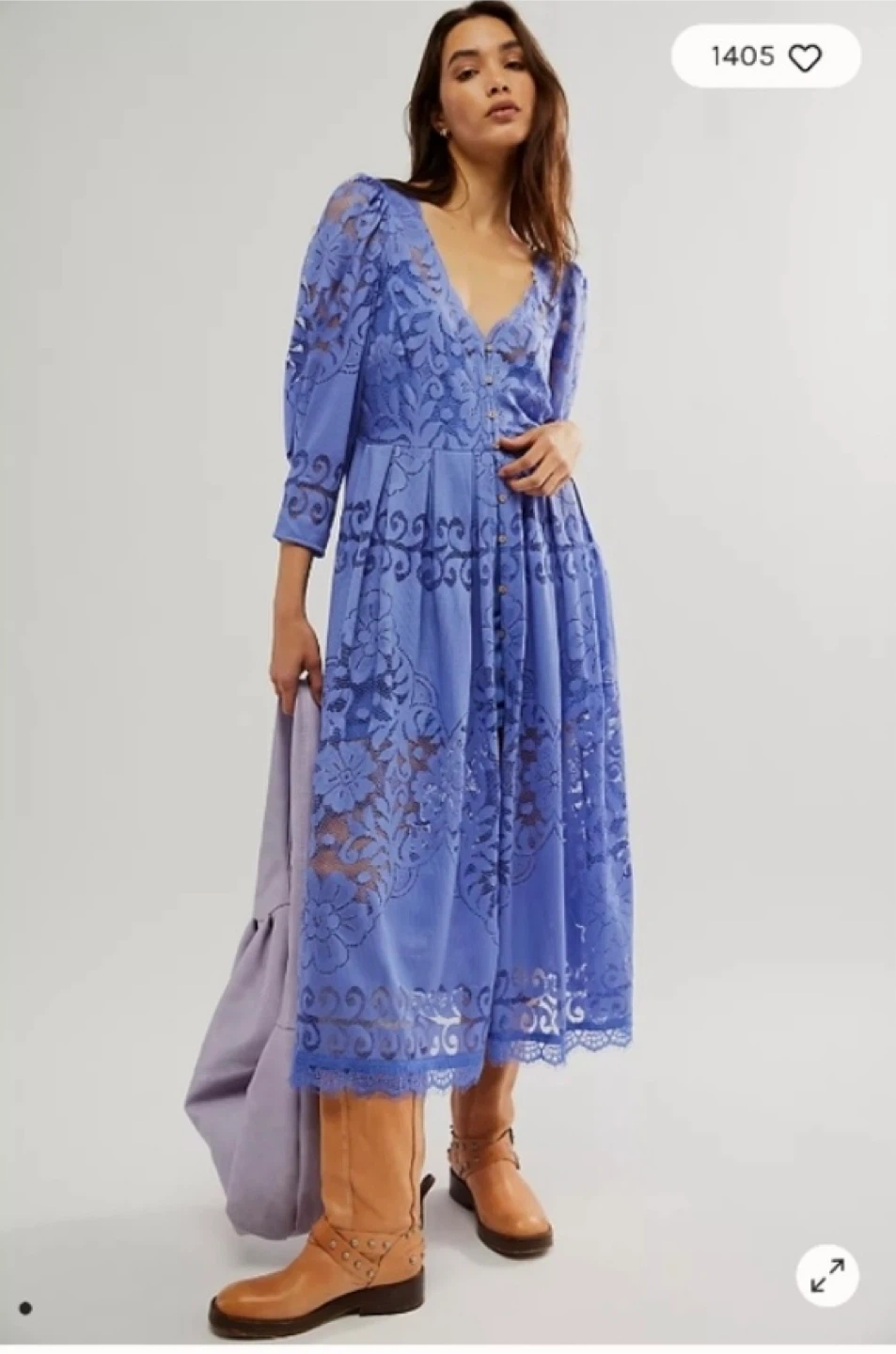 This is a Free People maxi dress. It's a beautiful periwinkle blue colour with intricate lace detailing throughout. The dress features a V-neckline, long puff sleeves with button cuffs, and a flowy skirt. It's perfect for a special occasion or a stylish daytime look!