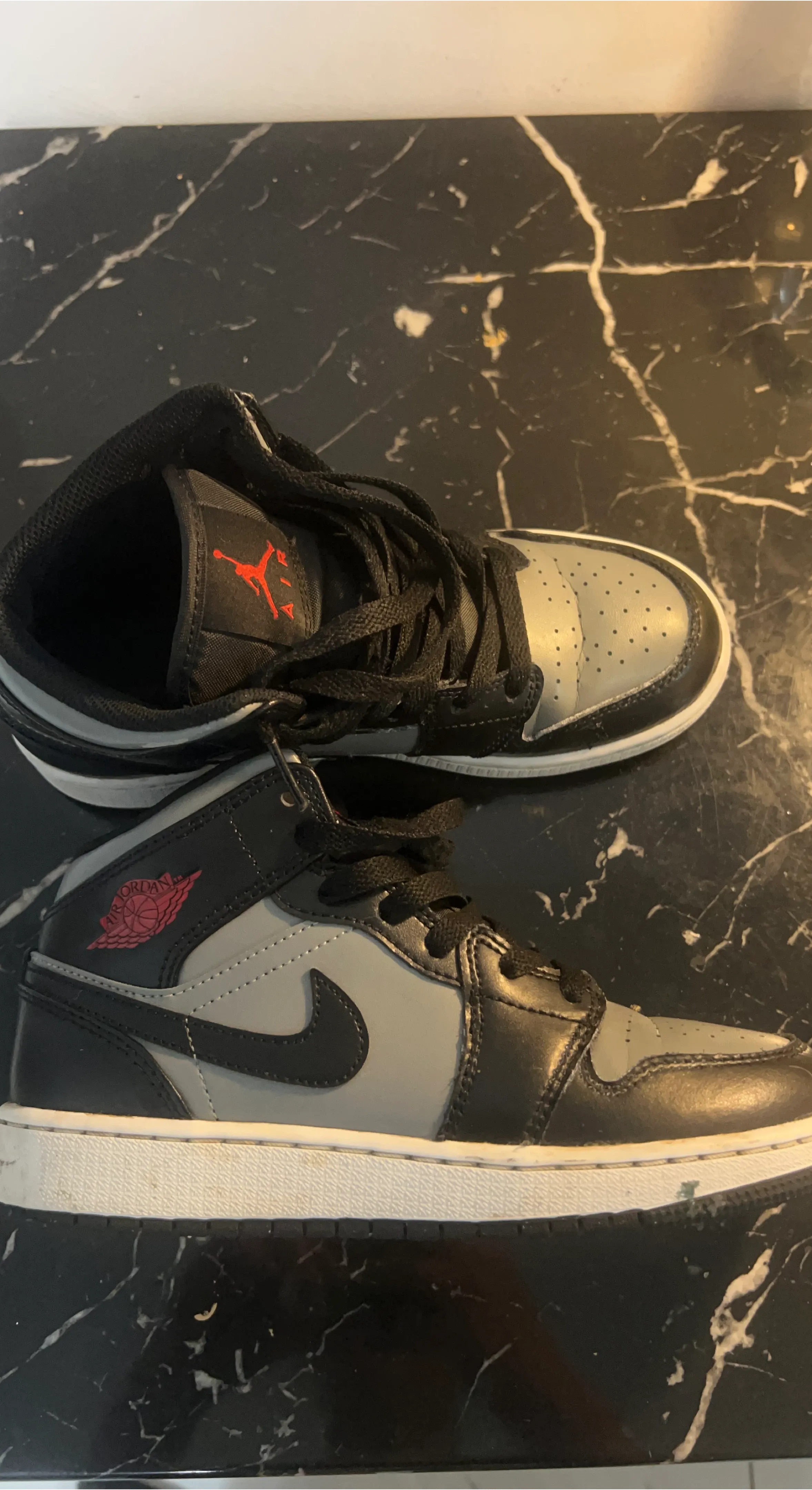 Air Jordan 1 Mid sneakers in black and grey. Leather and synthetic upper with rubber sole. Classic high-top silhouette. These are great for everyday wear! Size 3 Y