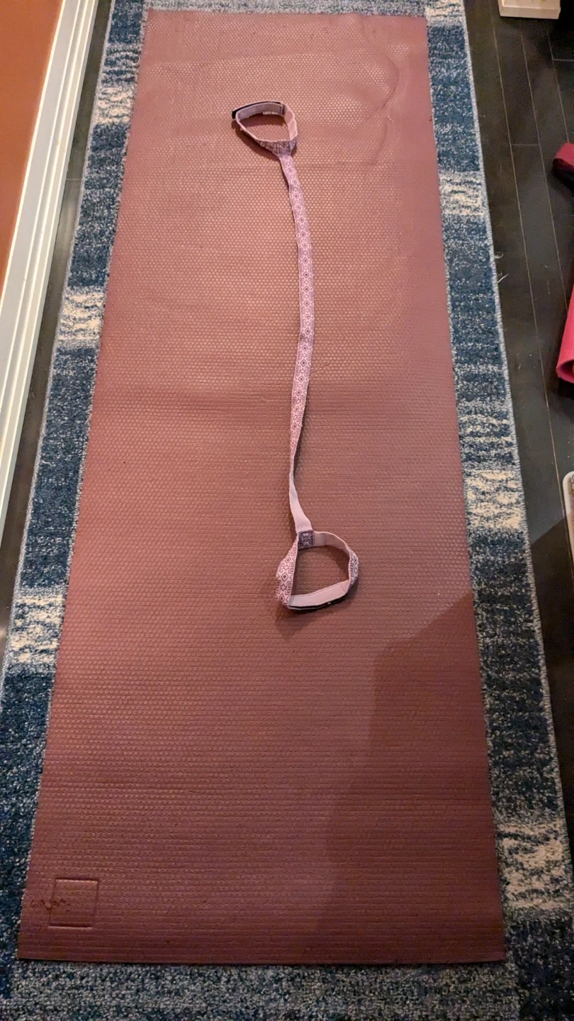 This is a Maji Sports yoga mat in a dusky rose colour. It comes with a patterned carrying strap. The mat's surface has a subtle woven texture.