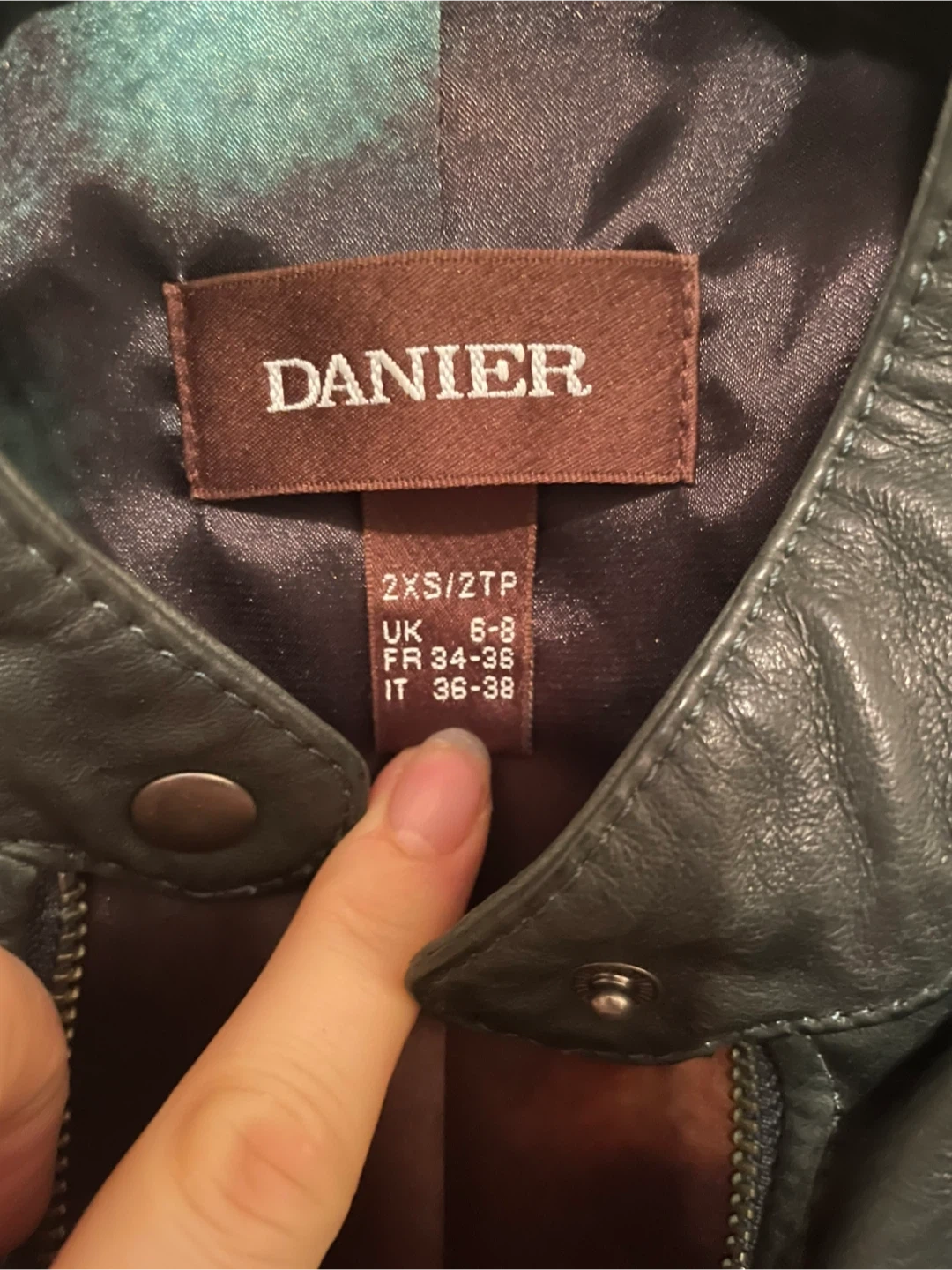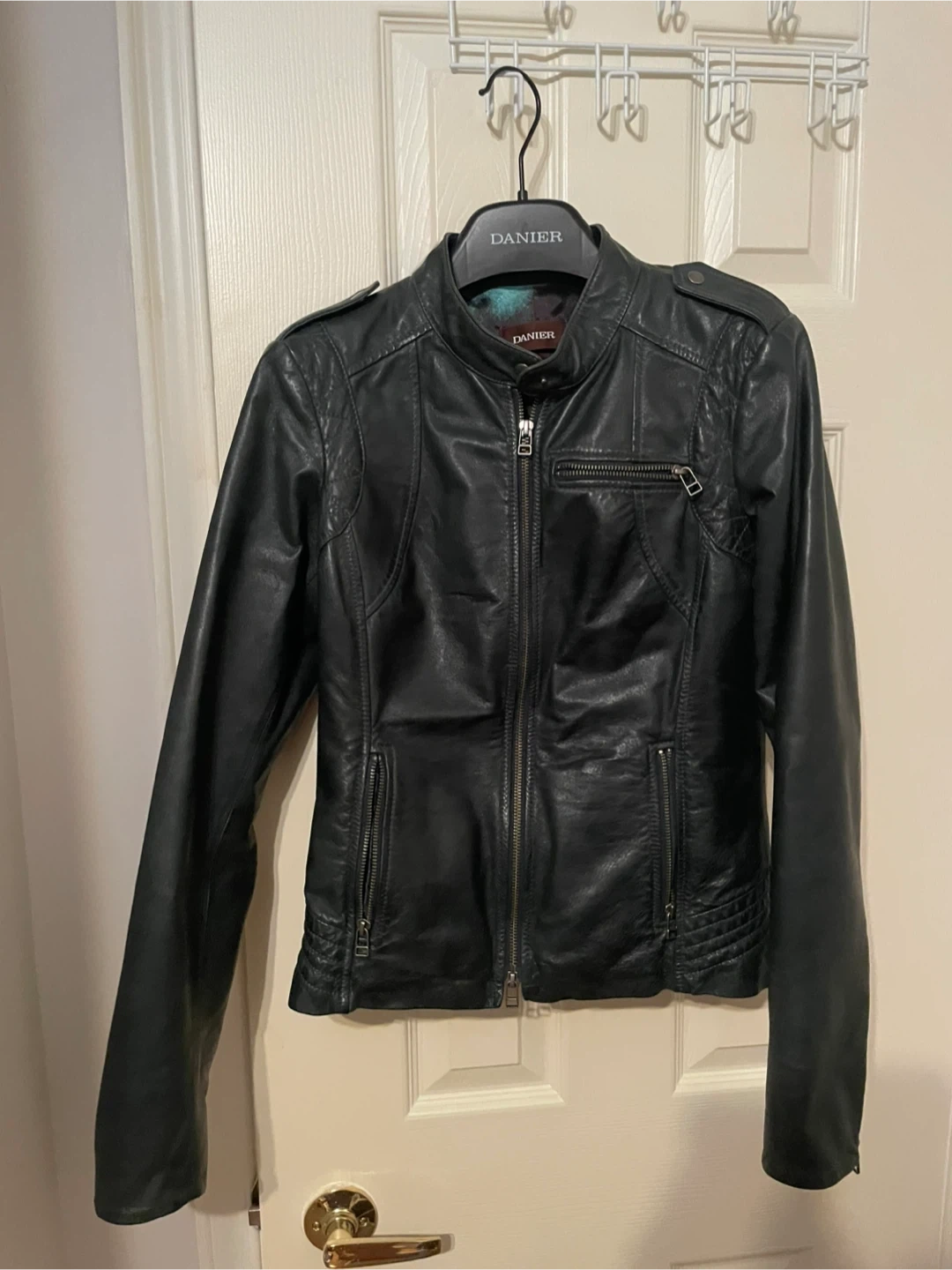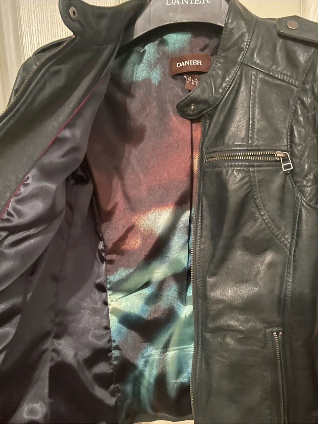 This is a very Dark green leather jacket . It features a stylish patterned lining. Multiple zip pockets and a zip-up front complete the look. Size is XS. Has only been worn a few times