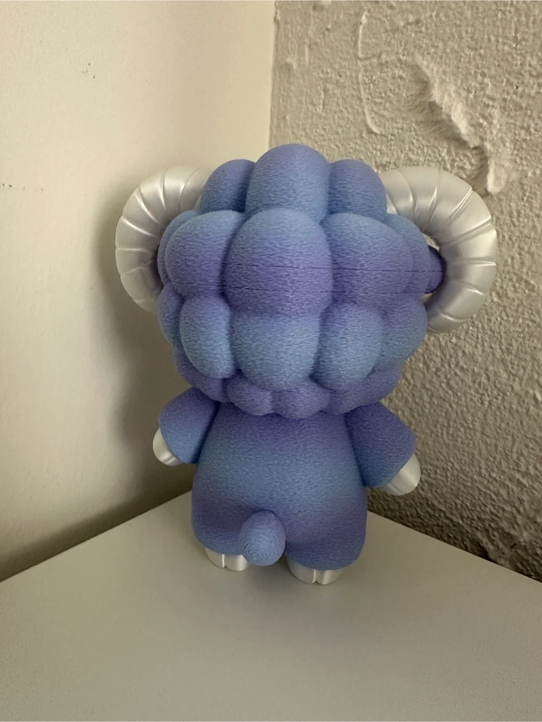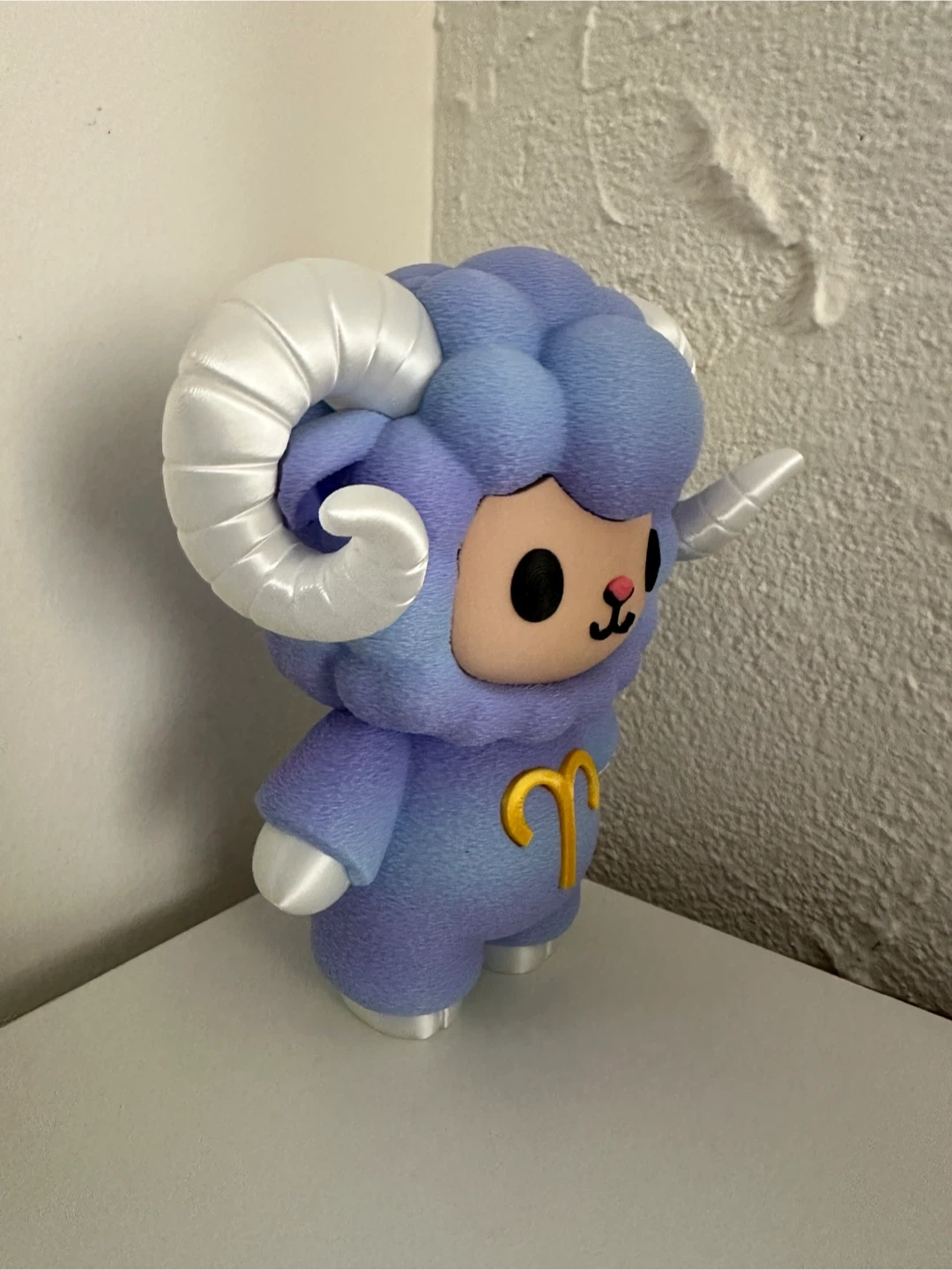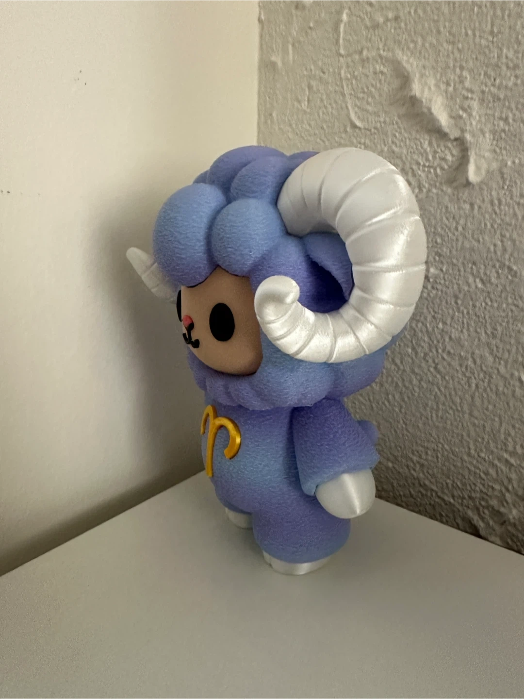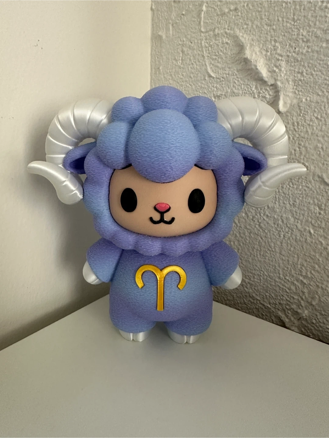 Cute Tokidoki collectible figure representing Aries. It's a stylized purple ram with large white horns. Features the Aries zodiac symbol on the chest.