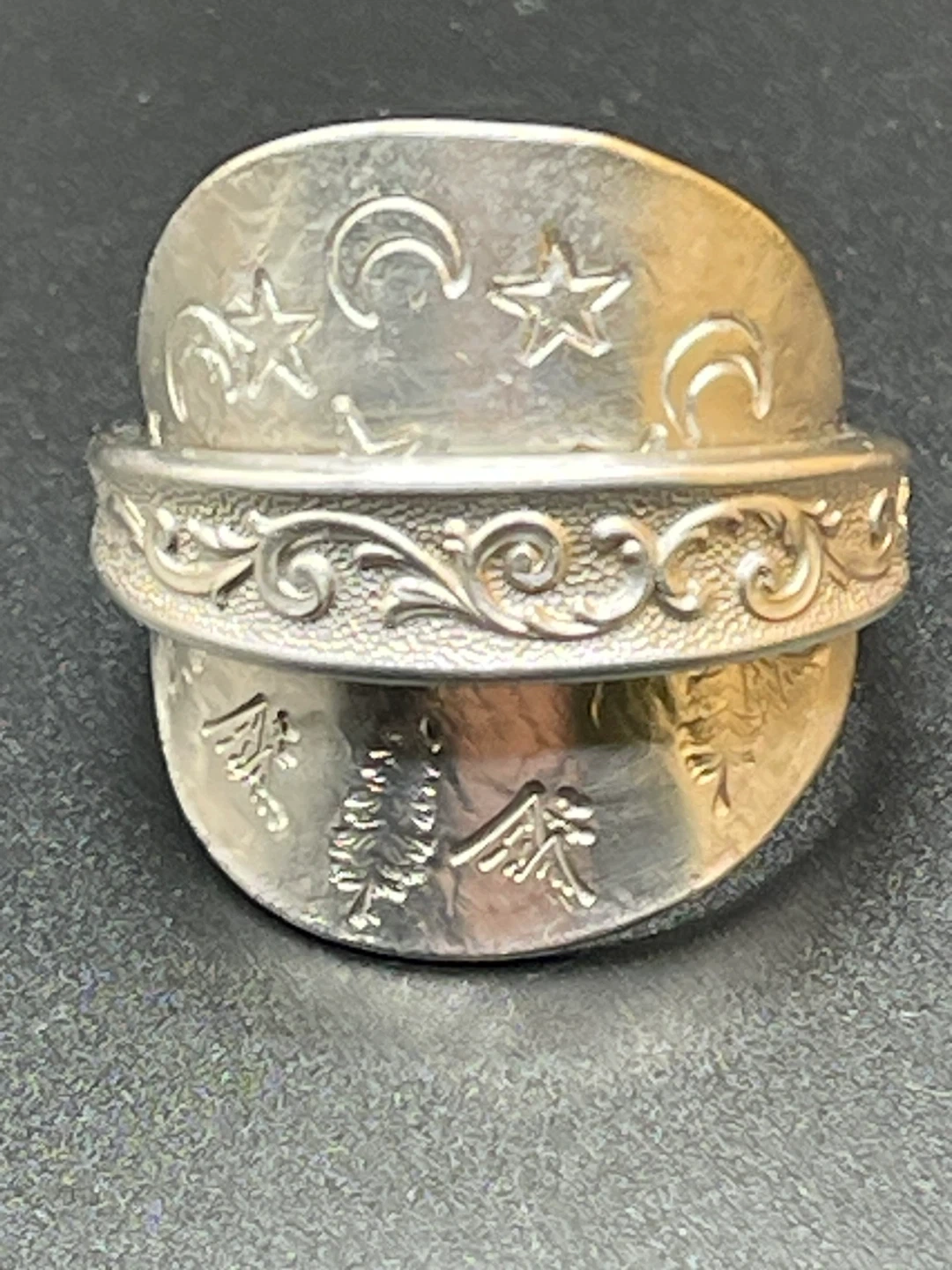 Handmade spoon ring featuring celestial moon and star designs, with a tree motif on the band. It's made from silverware, giving it a unique vintage charm. This adjustable ring is a neat conversation piece!
