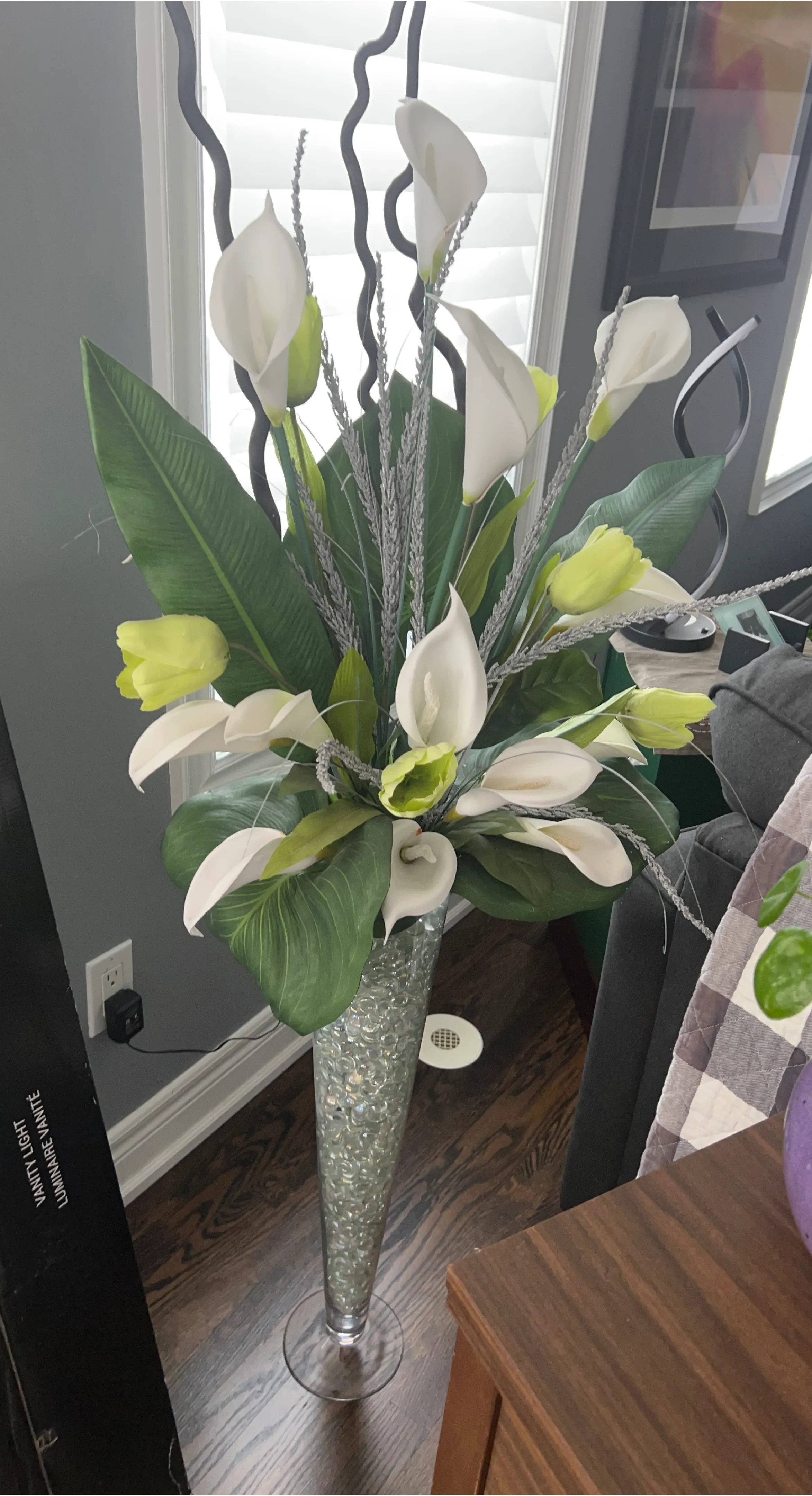 A beautiful arrangement featuring white calla lilies and yellow tulips, accented with greenery and decorative filler in a tall, clear glass vase. This faux floral display adds a touch of elegance to any space, requiring no maintenance. It's a lovely decorative piece for a home or office.