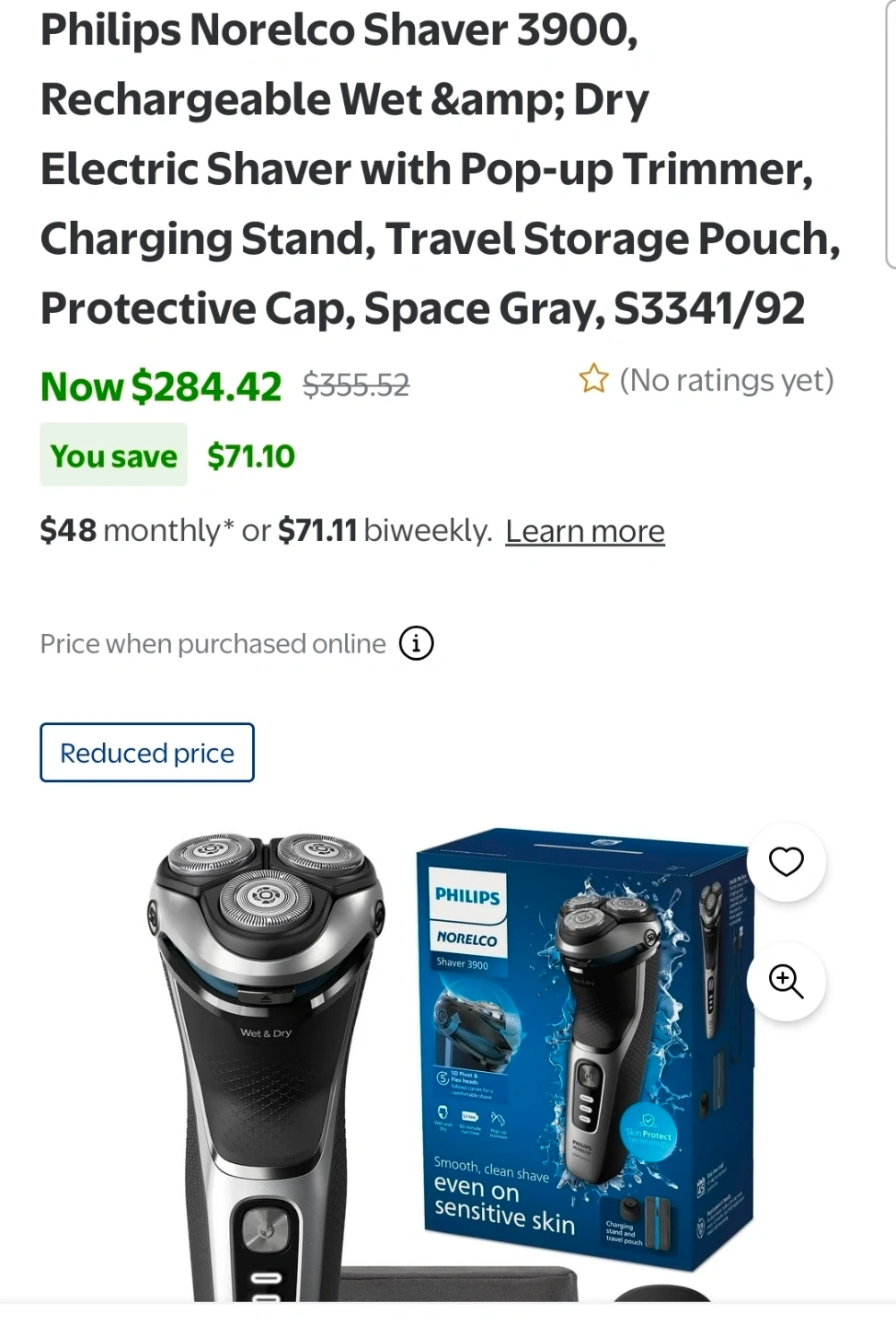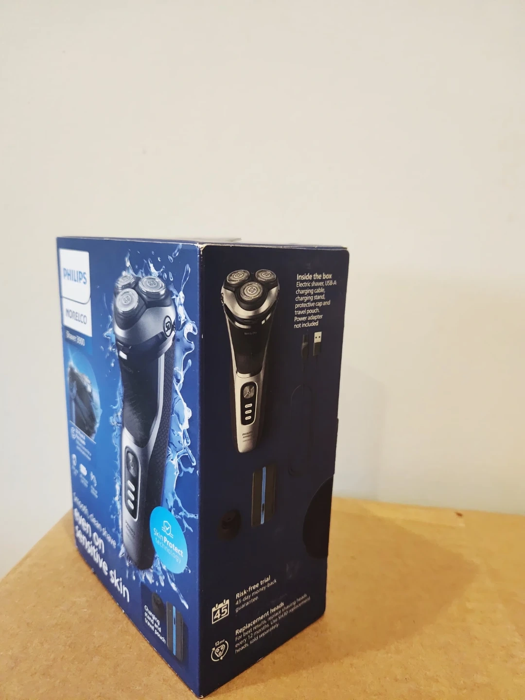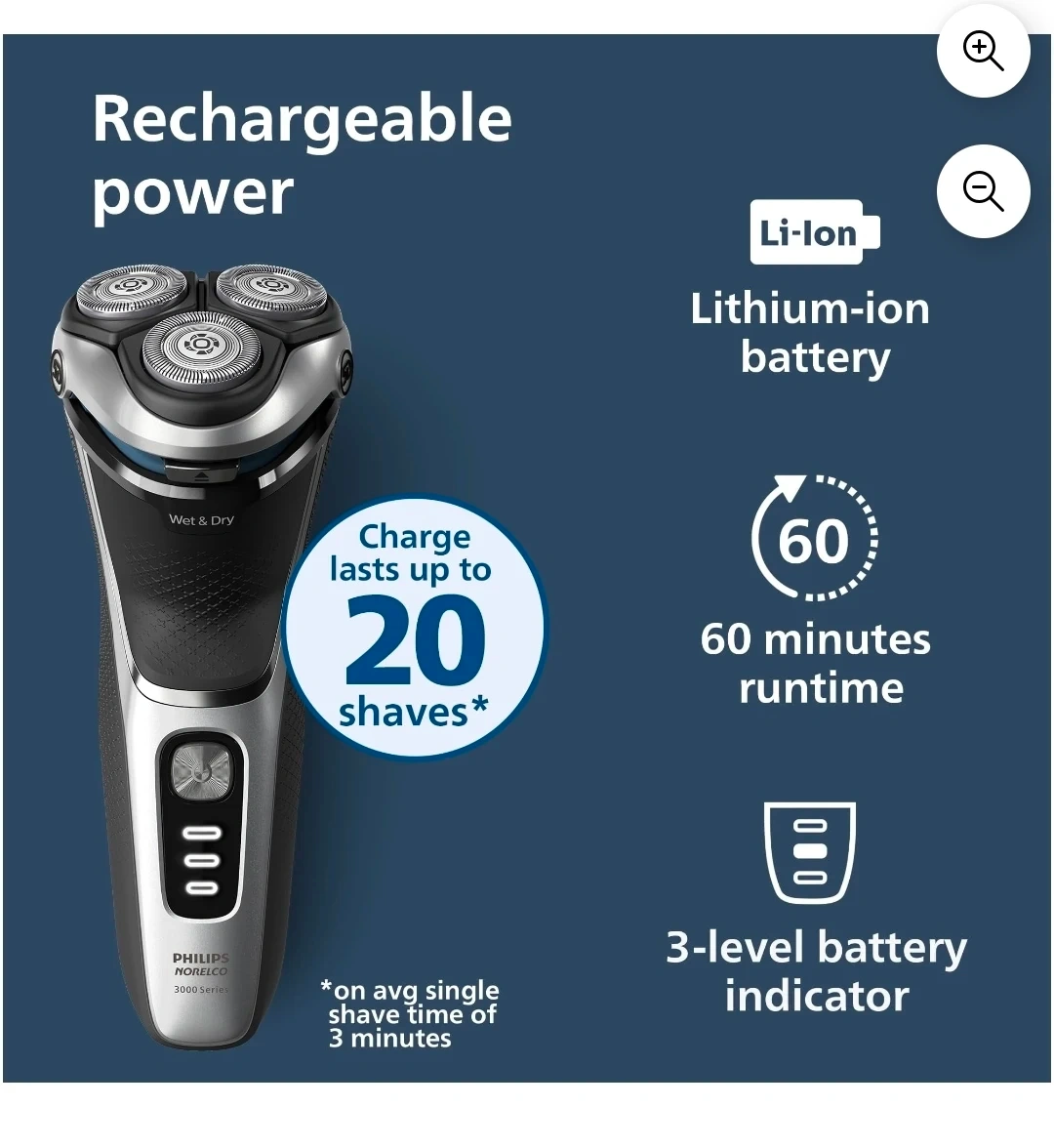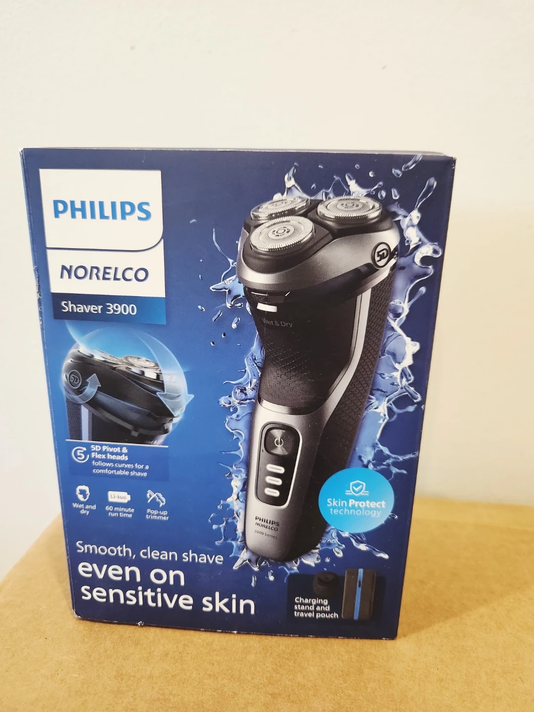 This is a Philips Norelco Shaver 3900, a rechargeable wet & dry electric shaver. It features a 60-minute runtime on a full charge. Includes charging stand and travel pouch.