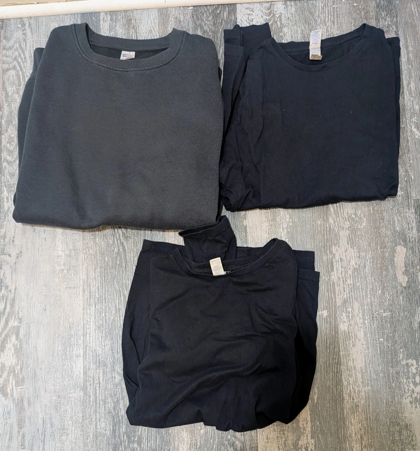 This bundle includes two black long sleeve t-shirt and one black crewneck sweatshirt. Both items are made of soft, comfortable material. They're perfect for everyday wear. Good condition. All for $5.
