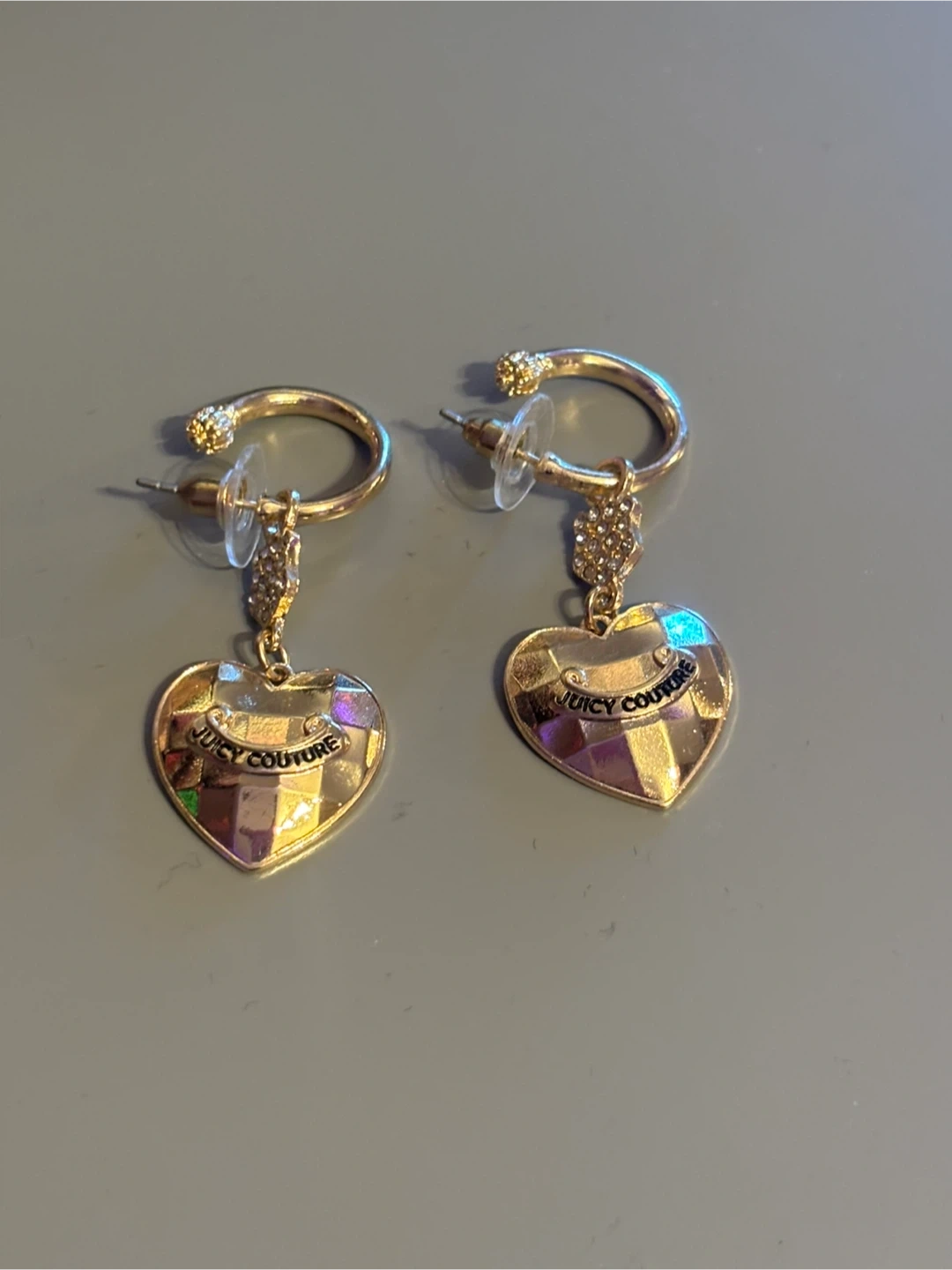 These Juicy Couture hoop earrings feature a gold-tone finish with heart-shaped charms. The charms are embellished with small crystals and showcase the Juicy Couture logo. They have a post-back closure with clear stoppers.
