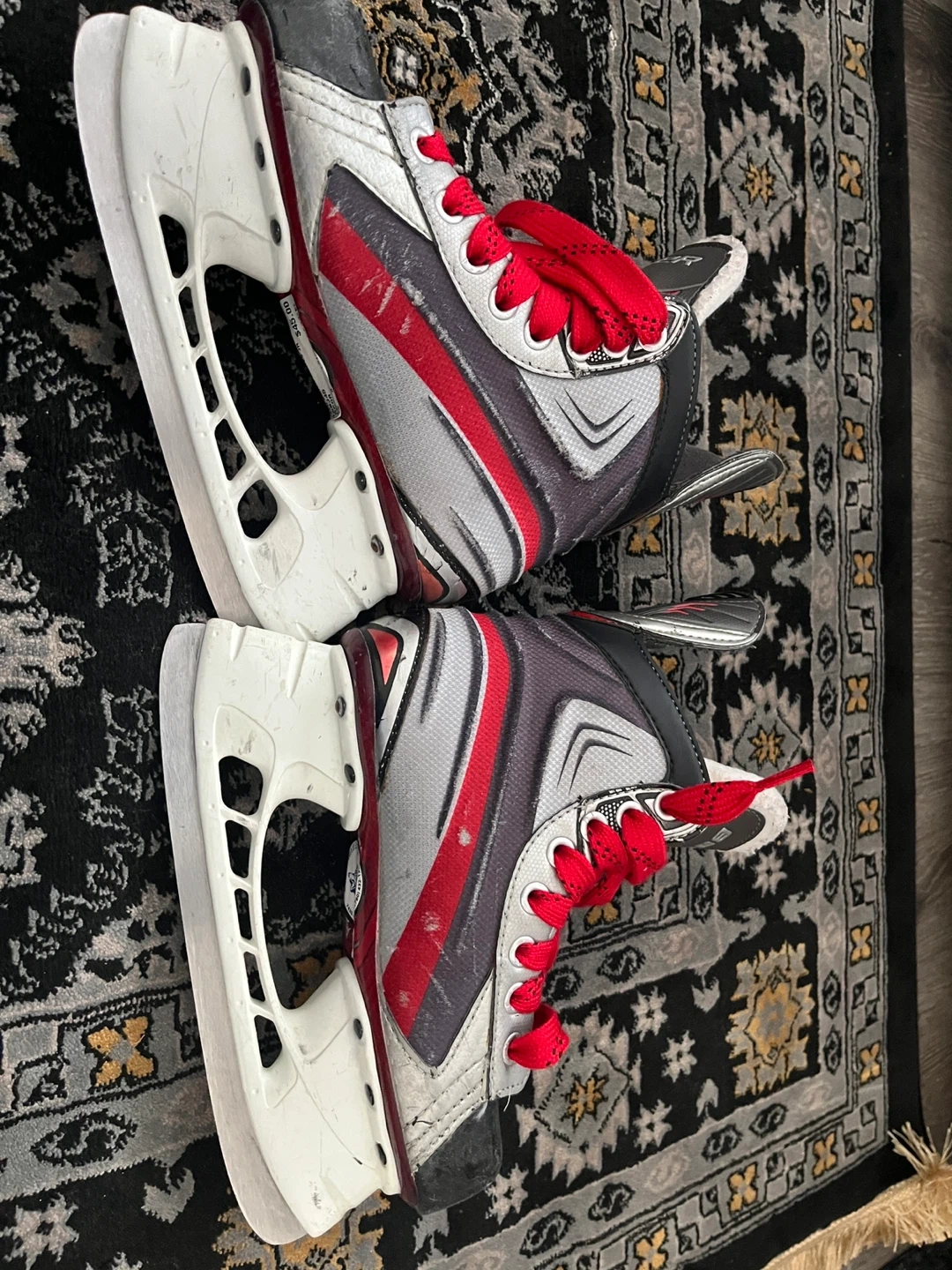 These are Bauer youth hockey skates. Size is US 2.5, UK 1.5, EUR 34. They feature red laces and a black, red, and grey design. Perfect for kids just starting out on the ice!