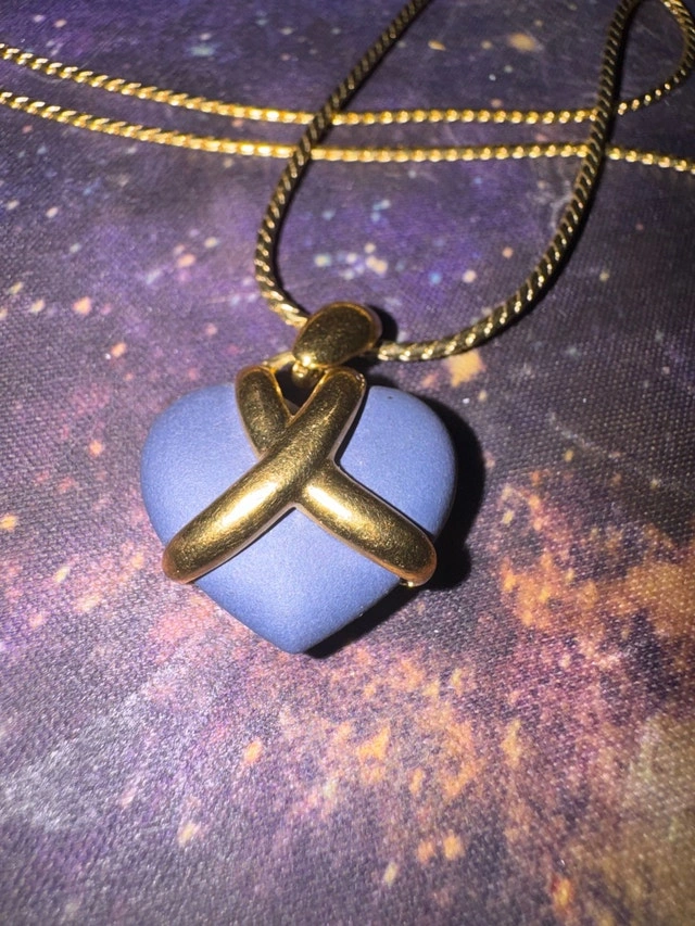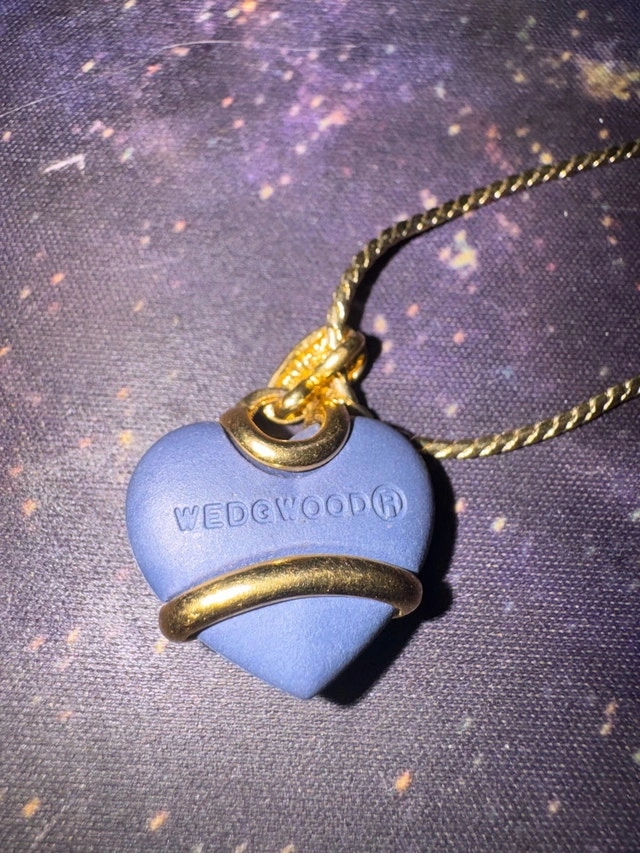 This is a used Wedgwood necklace featuring a blue heart pendant with gold accents, perfect for adding a touch of elegance to any outfit. It's in good condition and ready to be loved again! The necklace is in good condition, with minor signs of wear that add to its vintage charm. * Brand: Wedgwood * Pendant Colour: Blue and Gold * Style: Pendant I'm pricing it at $120 CAD, based on similar Wedgwood necklaces I've seen listed on Kijiji. If the ad's still up, it's still available, so no need to ask! Happy treasure hunting!