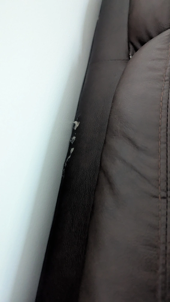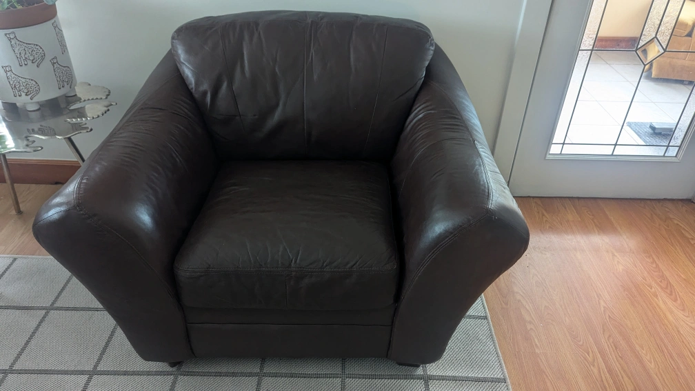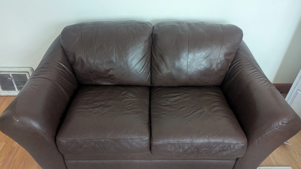 Selling a brown leather loveseat and armchair set. It has some wear and tear, as shown in the pictures. Perfect for a living room or den!