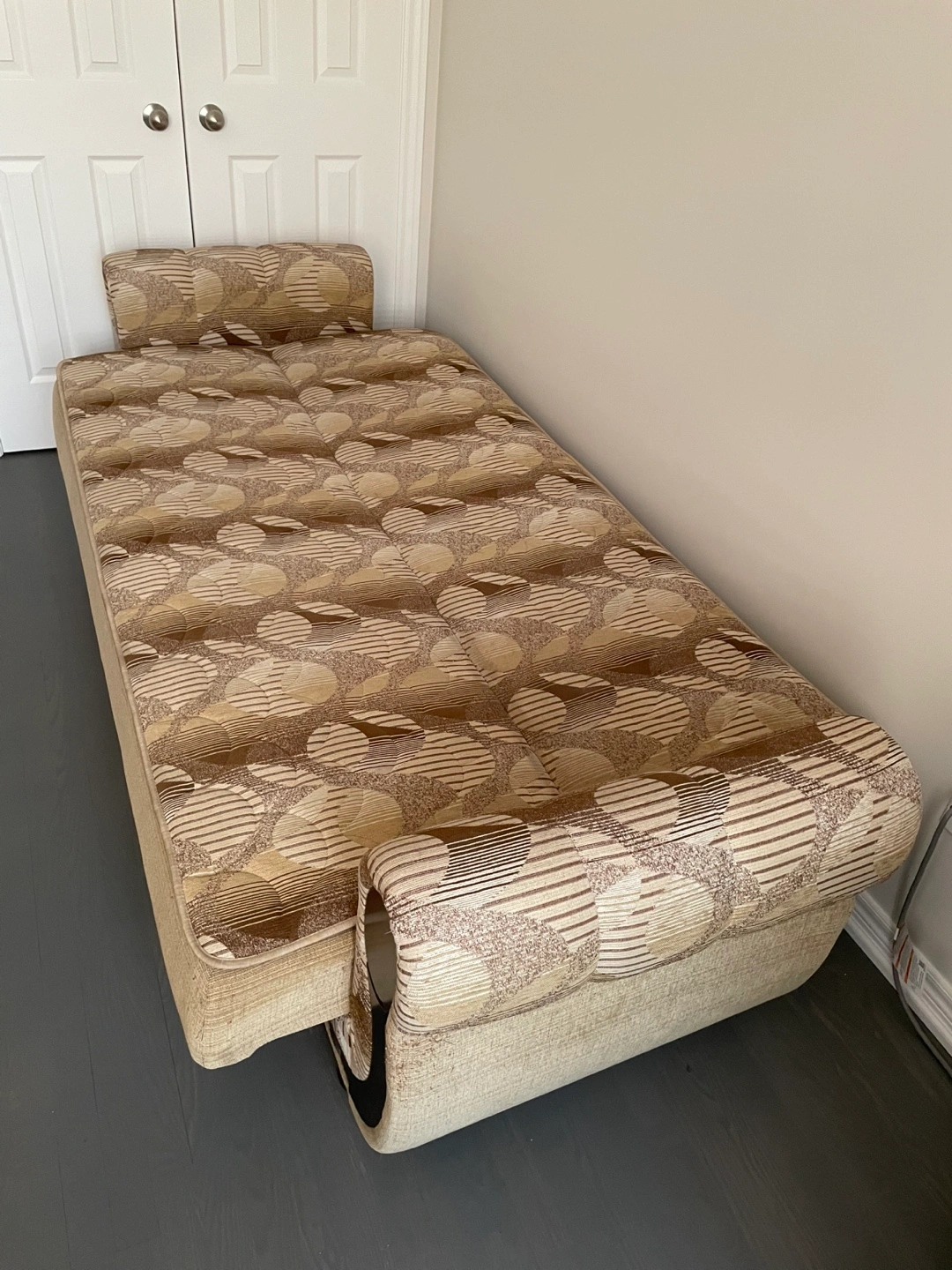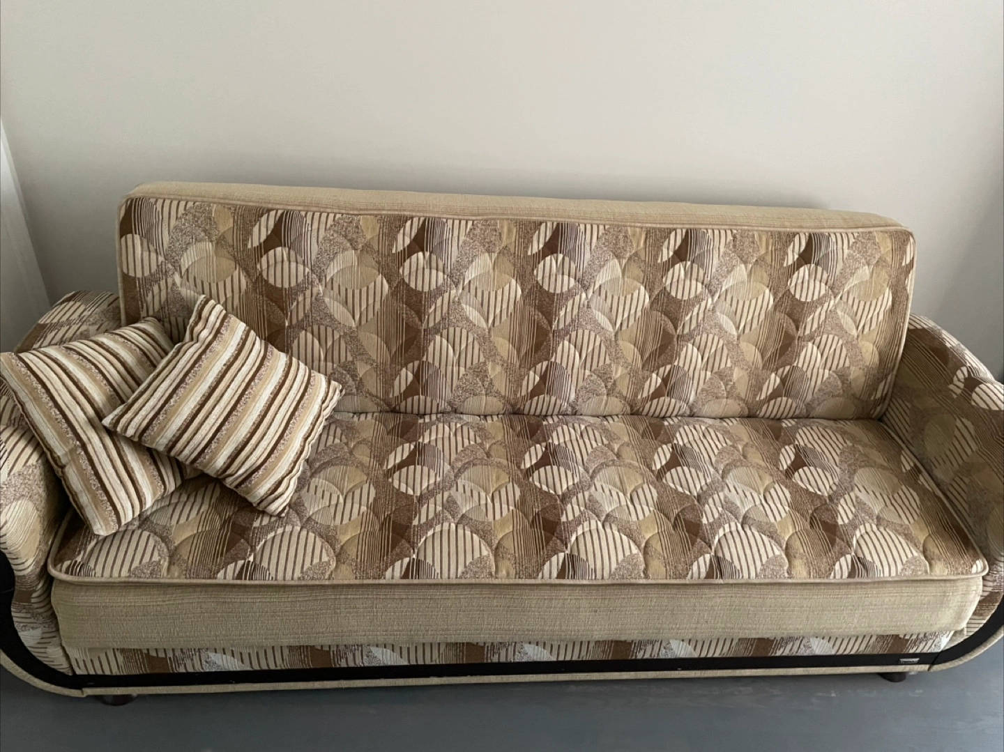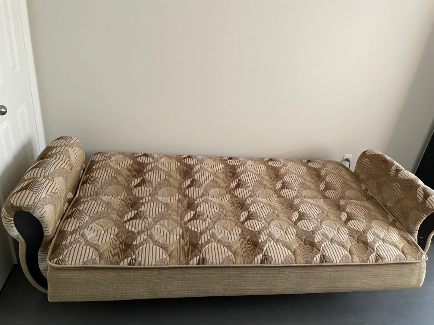 A vintage convertible sofa bed. Features neutral beige fabric. Patterned cushions and backrest. Convertible design, can be used as a bed. Can comfortably fit two people, offering a cozy space to enjoy a good book.