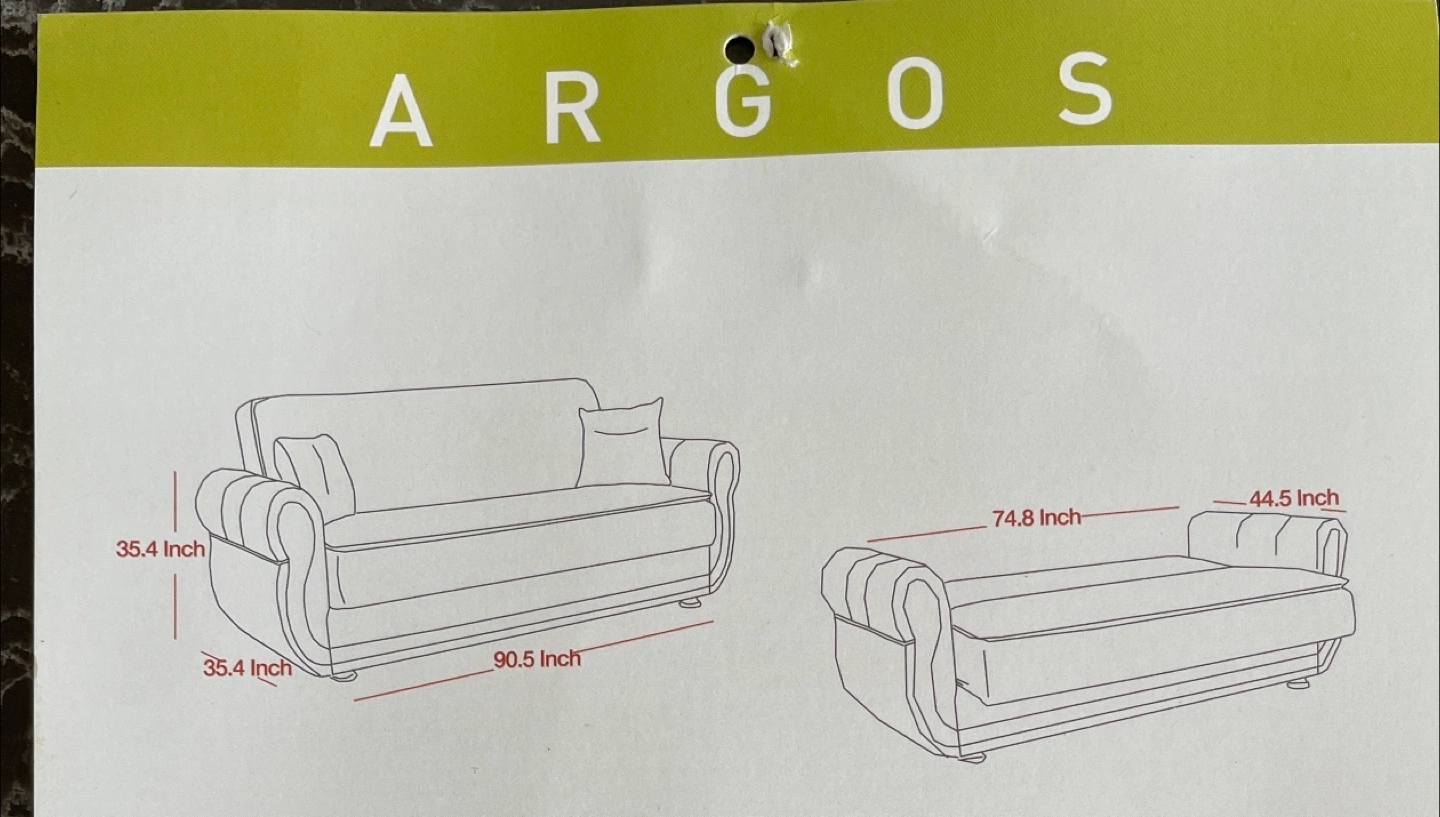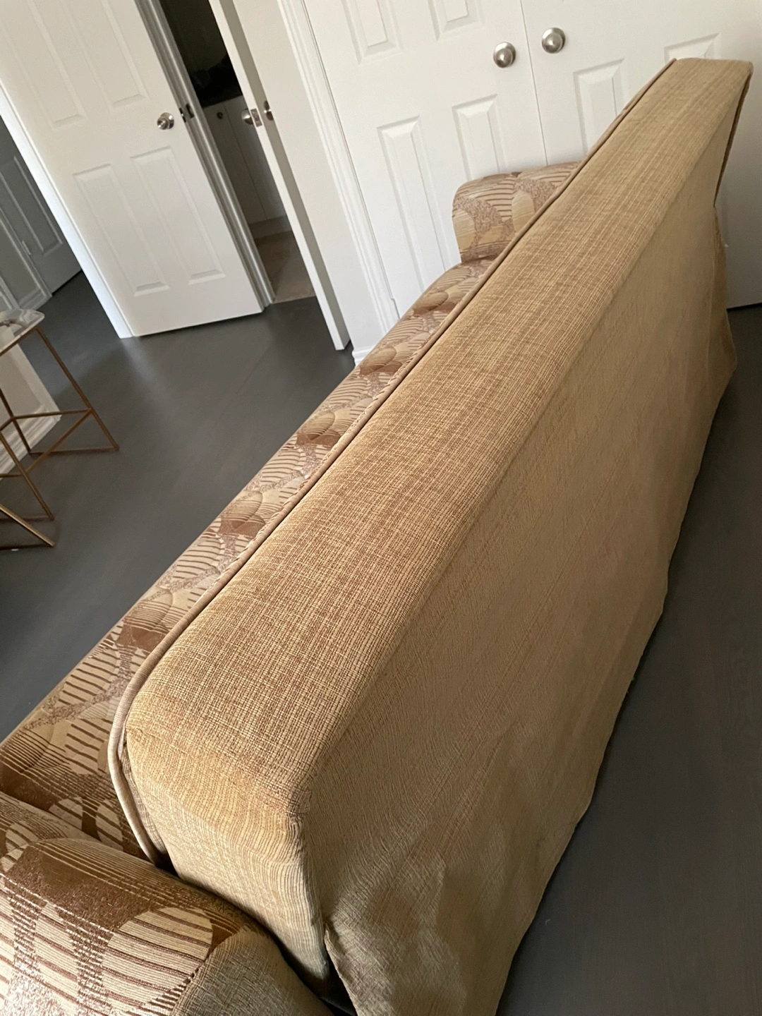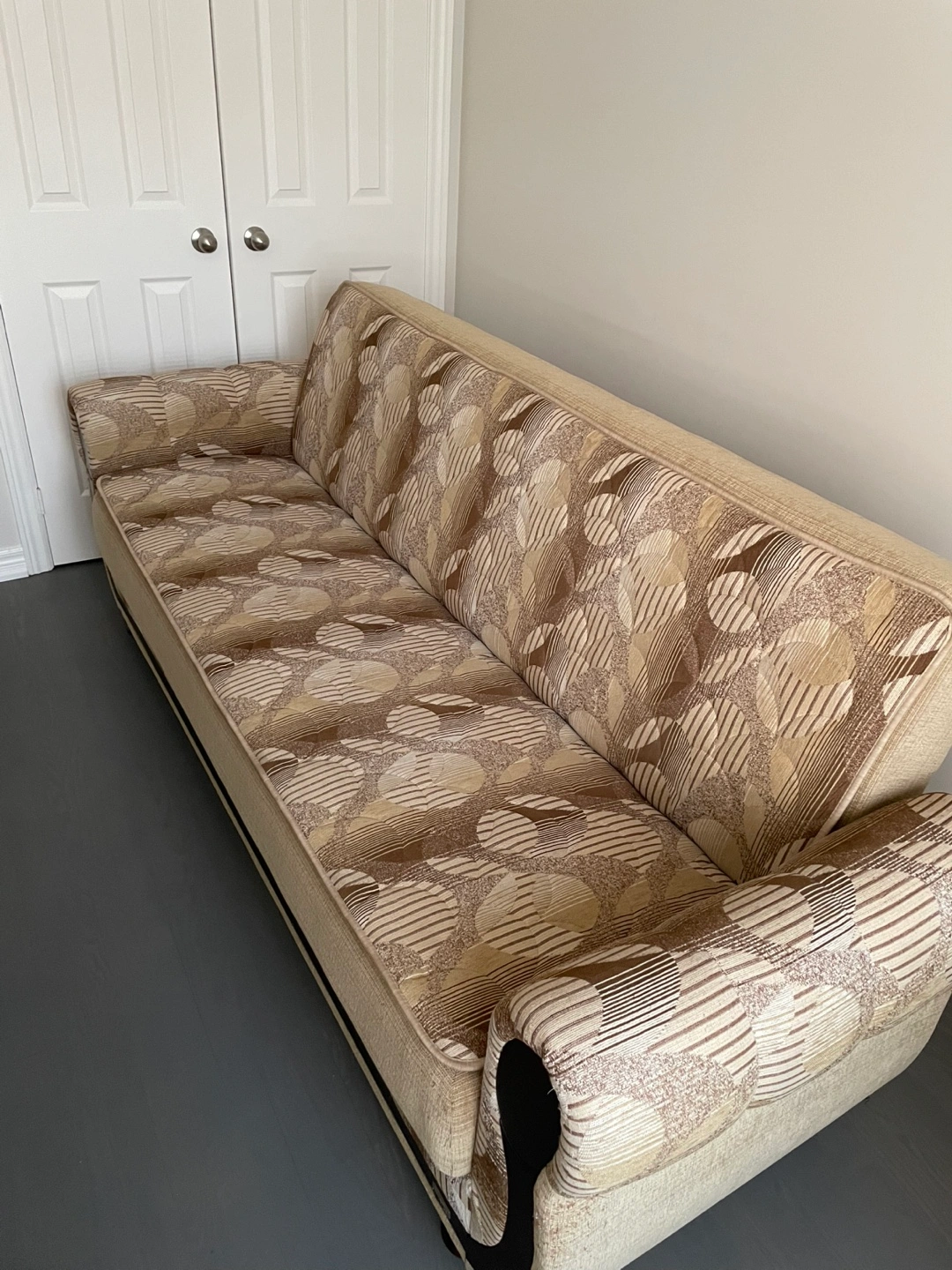 A vintage convertible sofa bed. Features neutral beige fabric. Patterned cushions and backrest. Convertible design, can be used as a bed. Can comfortably fit two people, offering a cozy space to enjoy a good book.