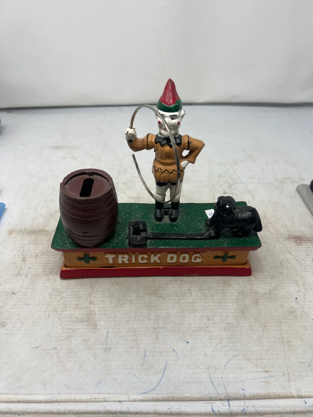 This is a cast iron "Trick Dog" automaton coin bank. It features a clown holding a hoop and a dog. When a coin is placed in the slot, the dog appears to jump through the hoop.
