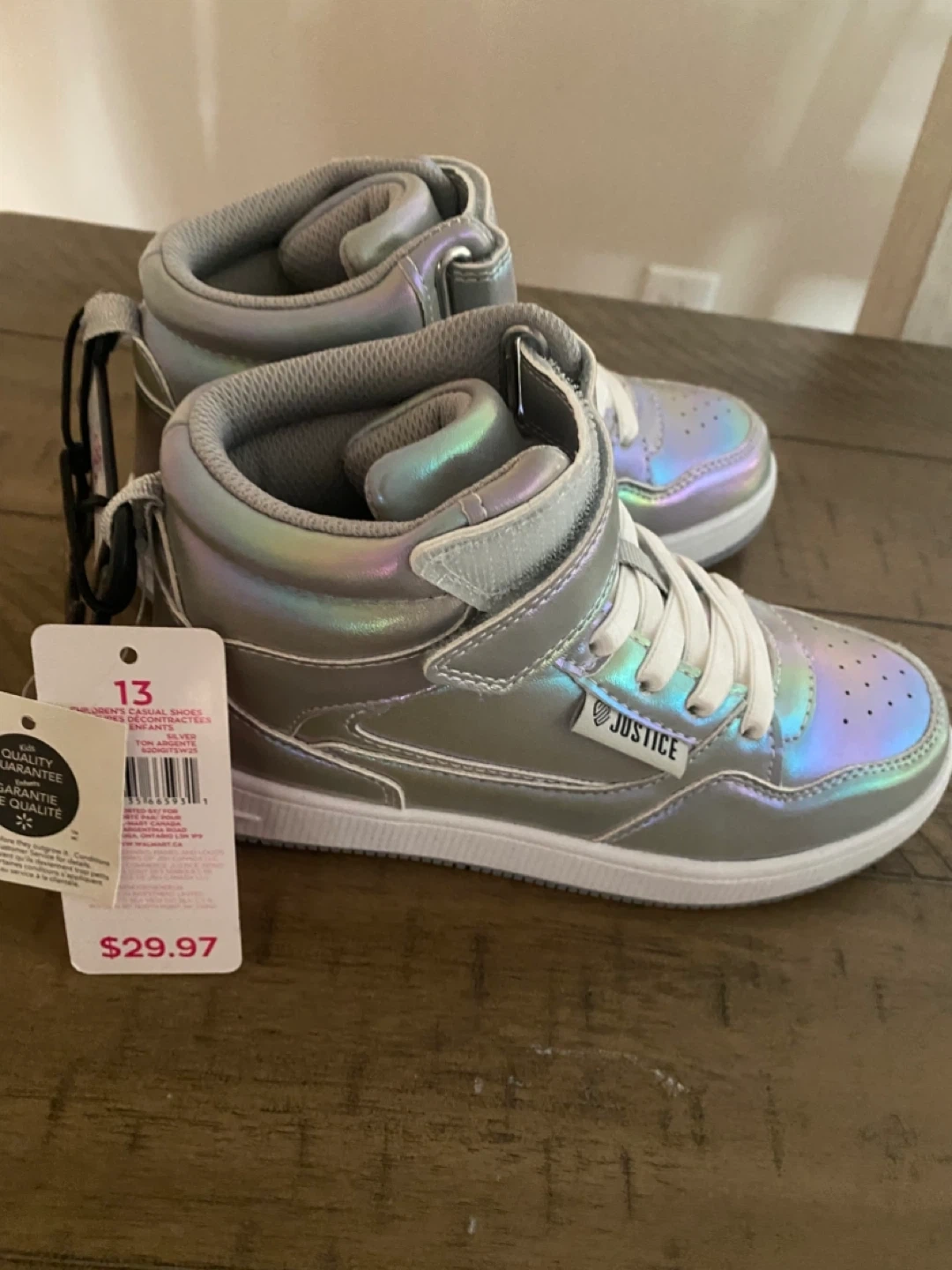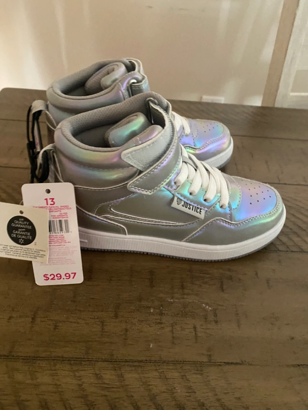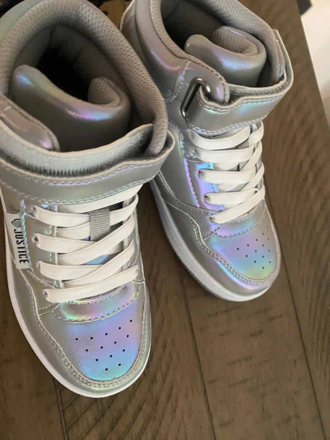 These Justice high-top sneakers come in a shimmery silver colour. They feature white laces and a velcro strap for closure. Perfect for everyday wear!