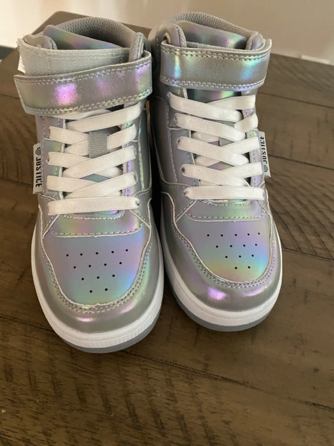 These Justice high-top sneakers come in a shimmery silver colour. They feature white laces and a velcro strap for closure. Perfect for everyday wear!