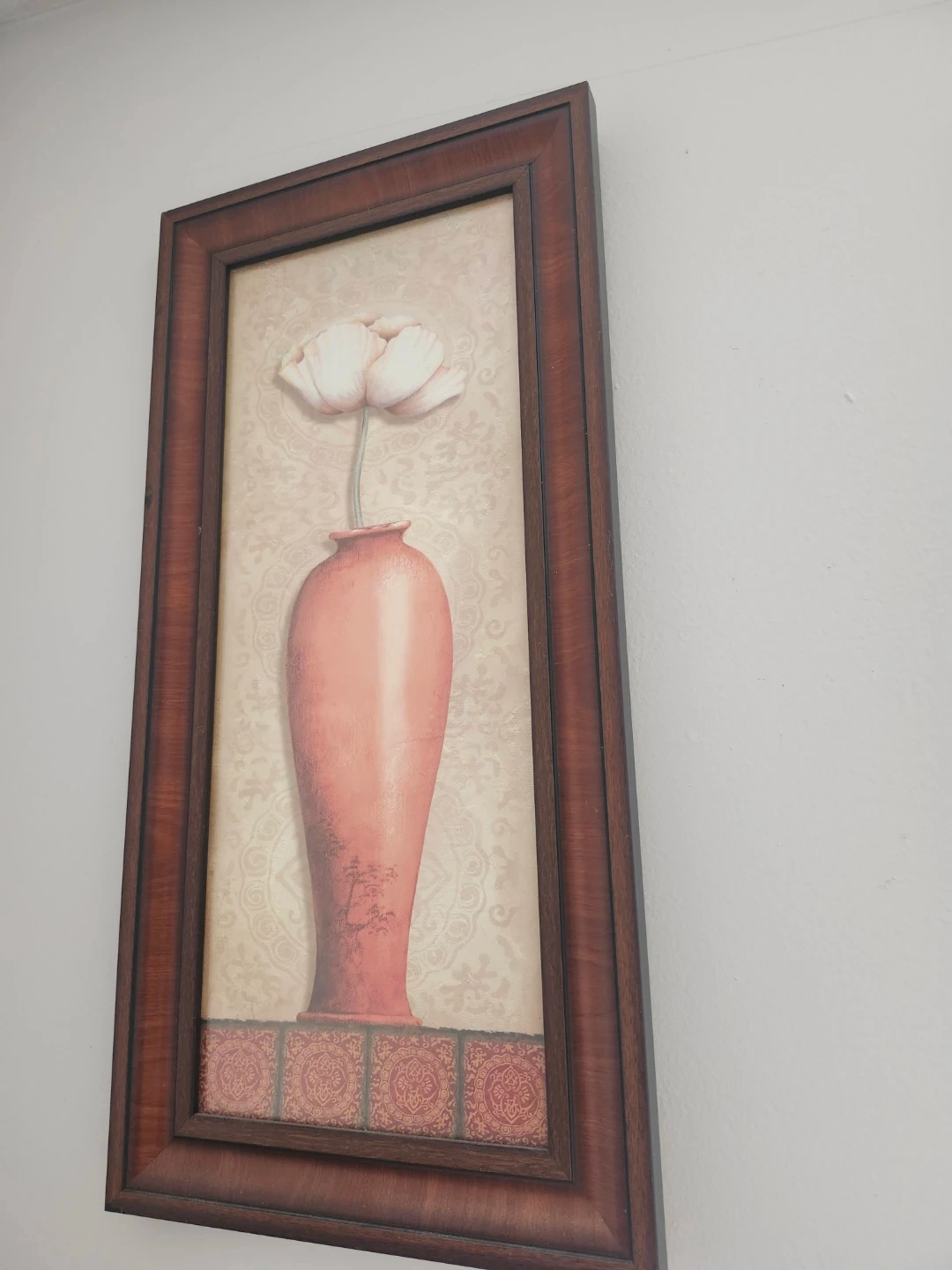 This is a framed piece of wall art featuring a delicate pink flower in a coral-coloured vase. The background has a subtle damask pattern. The frame is a dark wood finish. It's a lovely decorative accent for any room!