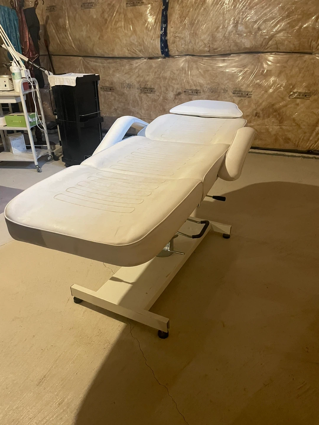 This is a white adjustable massage table or facial bed. It's upholstered in a smooth, easy-to-clean material. The back and leg rests are adjustable for comfort. This bed is great for massage therapists, estheticians, or home use.