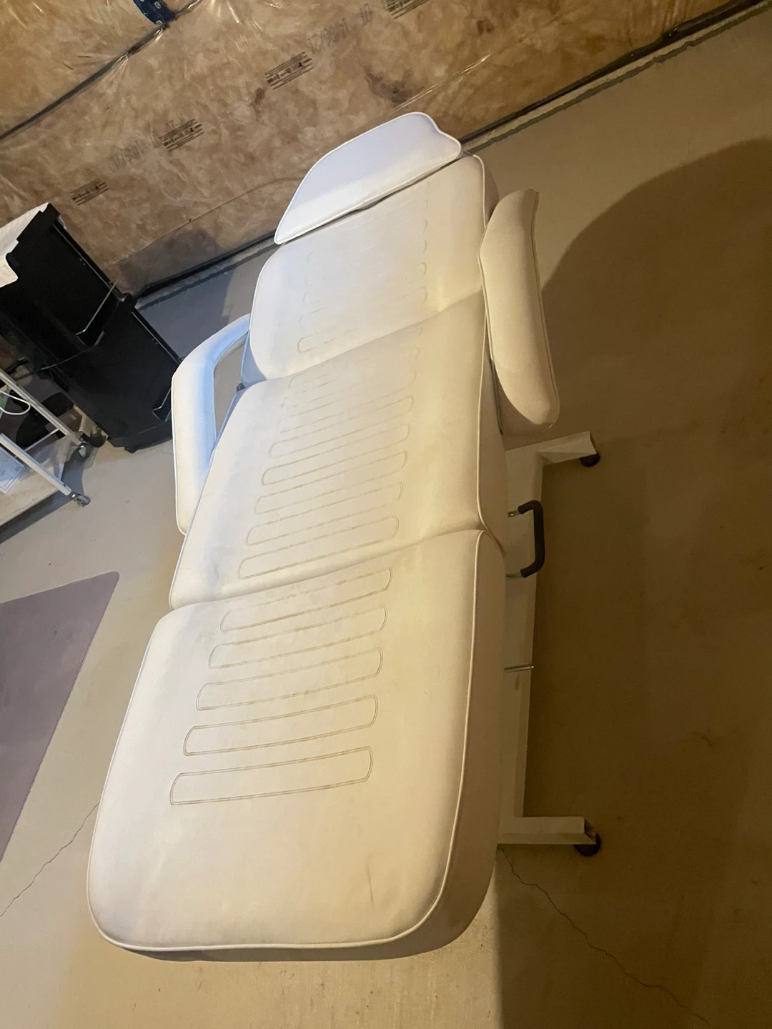 This is a white adjustable massage table or facial bed. It's upholstered in a smooth, easy-to-clean material. The back and leg rests are adjustable for comfort. This bed is great for massage therapists, estheticians, or home use.