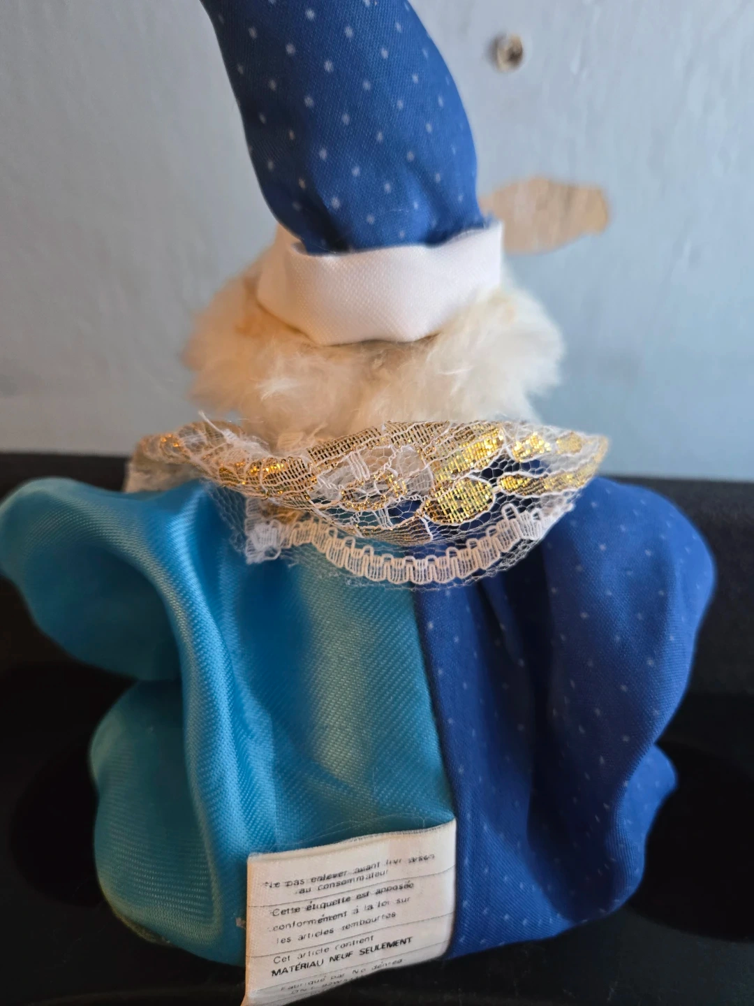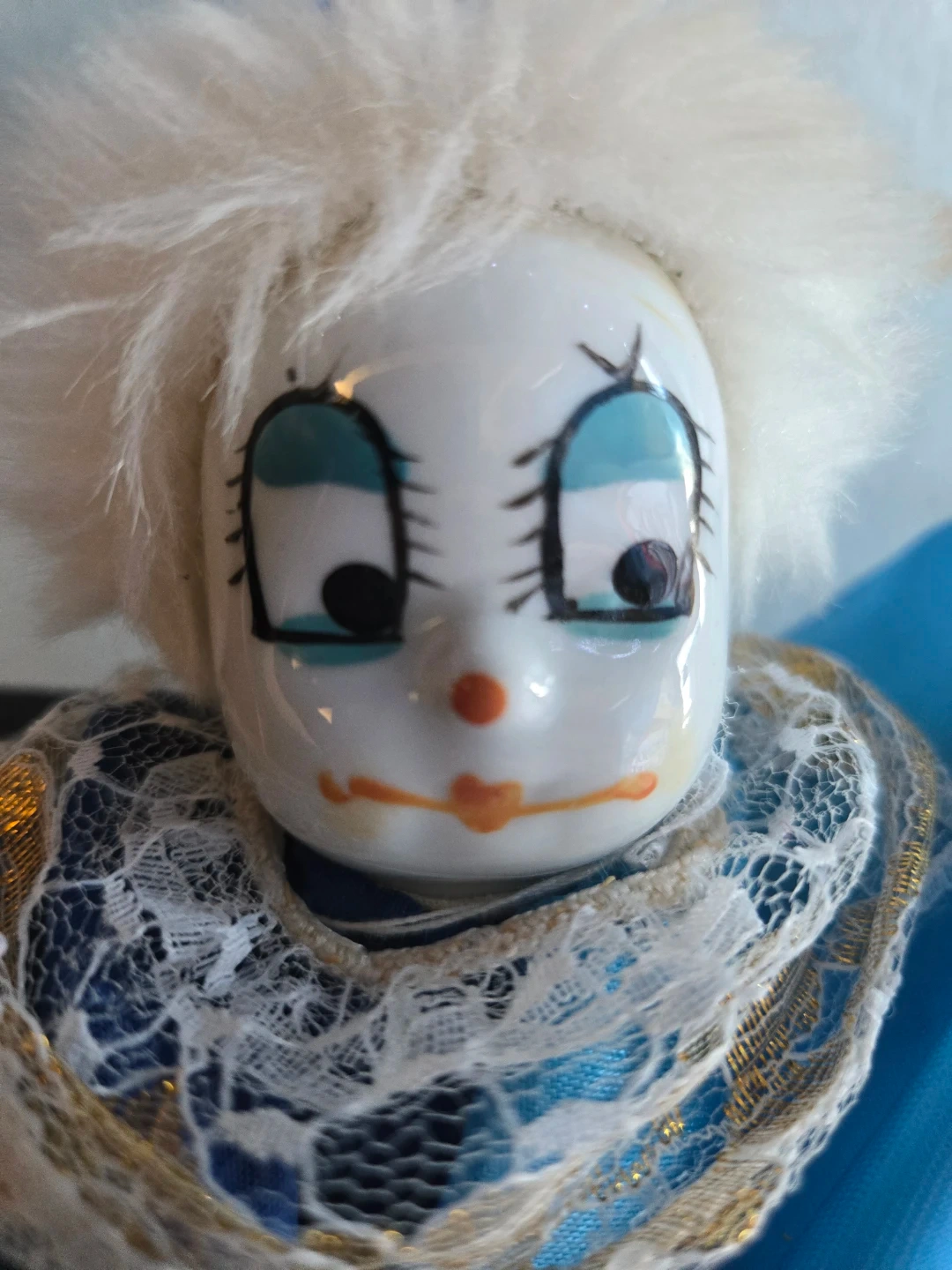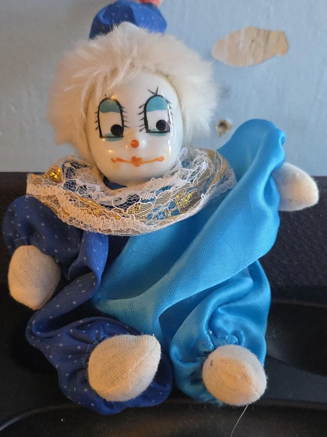This charming clown doll features a delicate ceramic face with painted features and fluffy white hair. It's dressed in a colourful blue polka dot outfit with a satin cape and lace collar. A fun decorative piece for any collection!