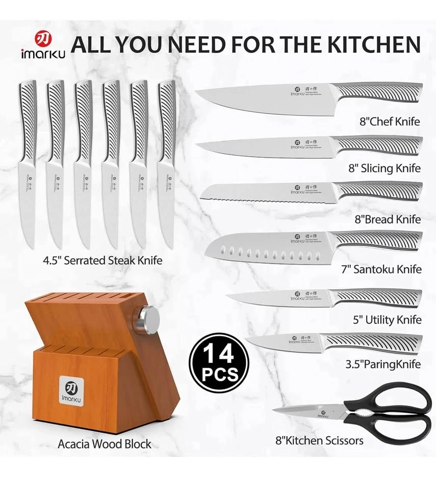 New in box. This is a premium 14-piece kitchen knife set by imarku. The ultra-sharp knives are made from high-quality German high carbon steel, hand-sharpened to an 18° angle per side. They maintain a perfect balance between sharpness and resilience. The knife block is made of sturdy, durable solid wood with a beautiful grain and ventilation at the bottom. Each blade is precisely heat-treated for strength and function, with a Rockwell hardness of 56 ± 2 HRC. The full tang ergonomic handles offer a comfortable and flexible grip, with increased weight for better balance. The handle design includes special ridges for aesthetics and improved grip. The set includes an 8" chef knife, 7" Santoku knife, 8" bread knife, 8" slicing knife, 3.5" paring knife, 5" utility knife, six 4.5" serrated steak knives, kitchen shears, and the knife block. Designed in California, imarku focuses on high-quality knives to enhance your cooking experience. Feel free to message if you have any questions!