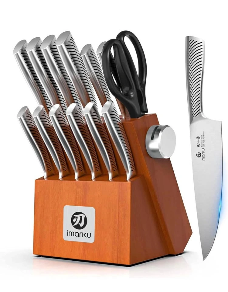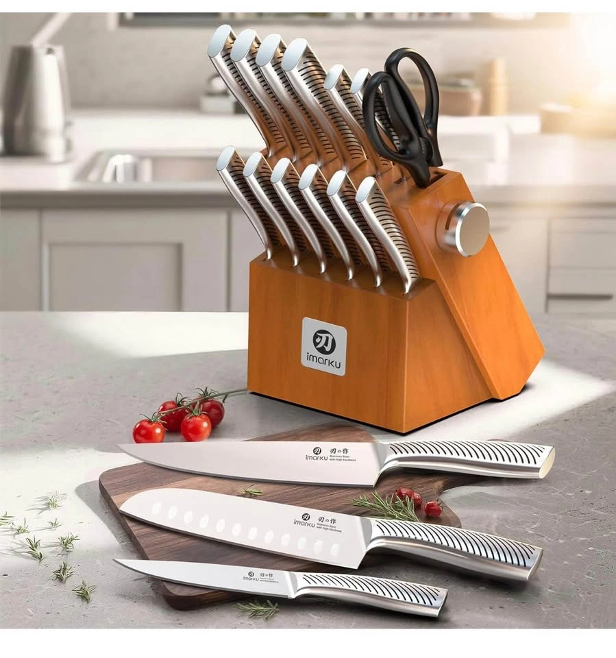 New in box. This is a premium 14-piece kitchen knife set by imarku. The ultra-sharp knives are made from high-quality German high carbon steel, hand-sharpened to an 18° angle per side. They maintain a perfect balance between sharpness and resilience. The knife block is made of sturdy, durable solid wood with a beautiful grain and ventilation at the bottom. Each blade is precisely heat-treated for strength and function, with a Rockwell hardness of 56 ± 2 HRC. The full tang ergonomic handles offer a comfortable and flexible grip, with increased weight for better balance. The handle design includes special ridges for aesthetics and improved grip. The set includes an 8" chef knife, 7" Santoku knife, 8" bread knife, 8" slicing knife, 3.5" paring knife, 5" utility knife, six 4.5" serrated steak knives, kitchen shears, and the knife block. Designed in California, imarku focuses on high-quality knives to enhance your cooking experience. Feel free to message if you have any questions!