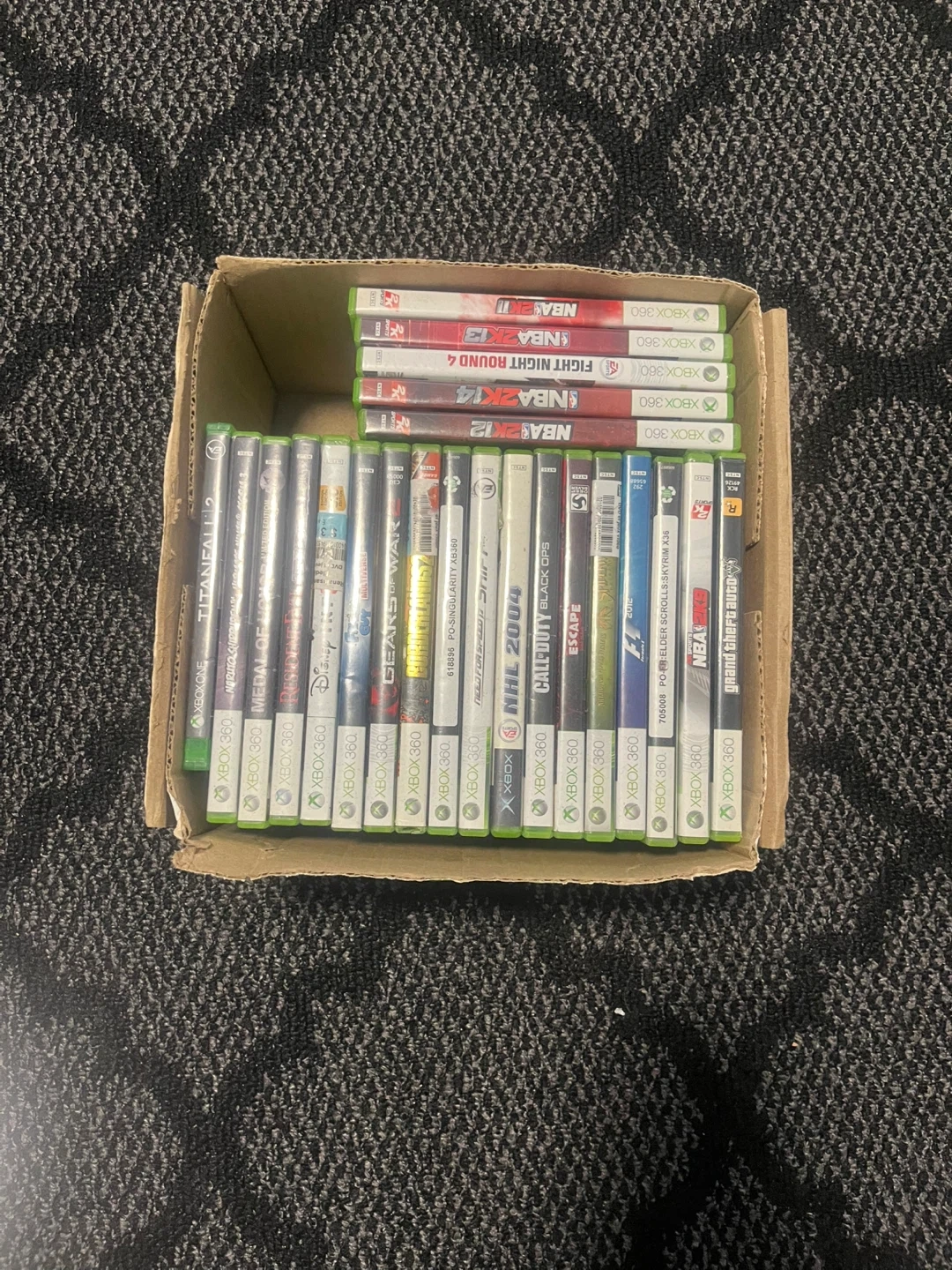 Bundle of Xbox 360 games. Includes NBA 2K11, 2K12, 2K13, 2K14, Fight Night Round 4, NHL 2004, Call of Duty: Black Ops, Gears of War, Titanfall 2, and more. Also includes The Elder Scrolls V: Skyrim and Grand Theft Auto V for Xbox One.