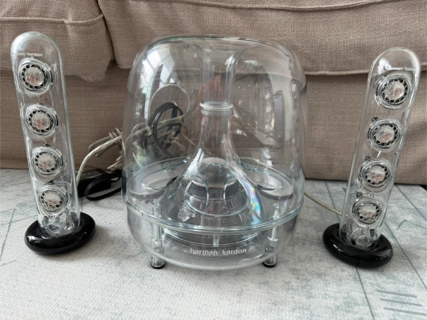 Harman Kardon SoundSticks III speaker system. Includes the subwoofer and two satellite speakers. Also comes with a Bluetooth transmitter and receiver for wireless connectivity. Power adapter included.