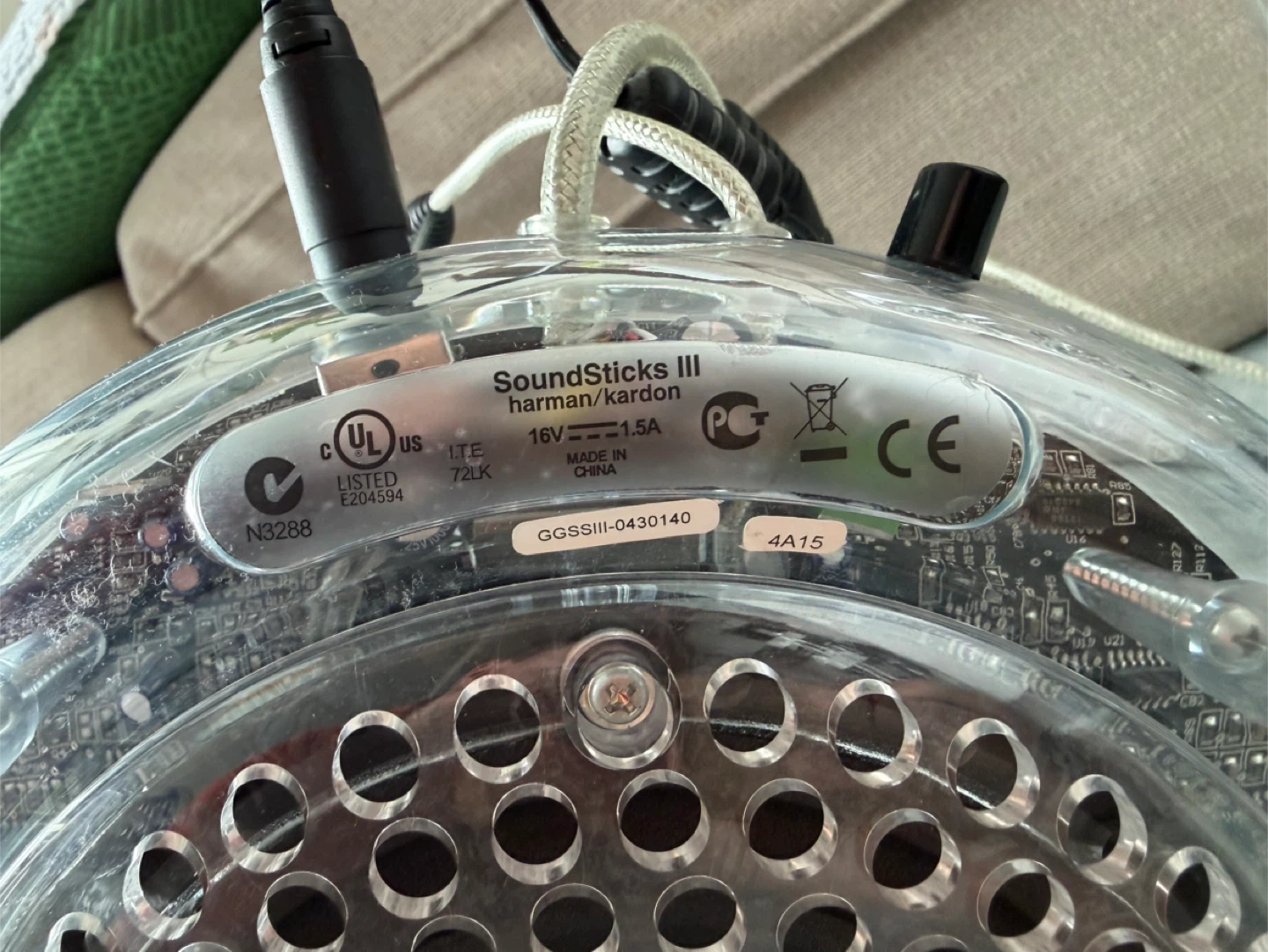 Harman Kardon SoundSticks III speaker system. Includes the subwoofer and two satellite speakers. Also comes with a Bluetooth transmitter and receiver for wireless connectivity. Power adapter included.