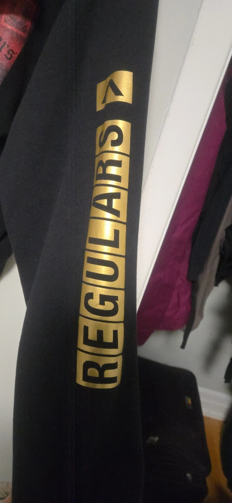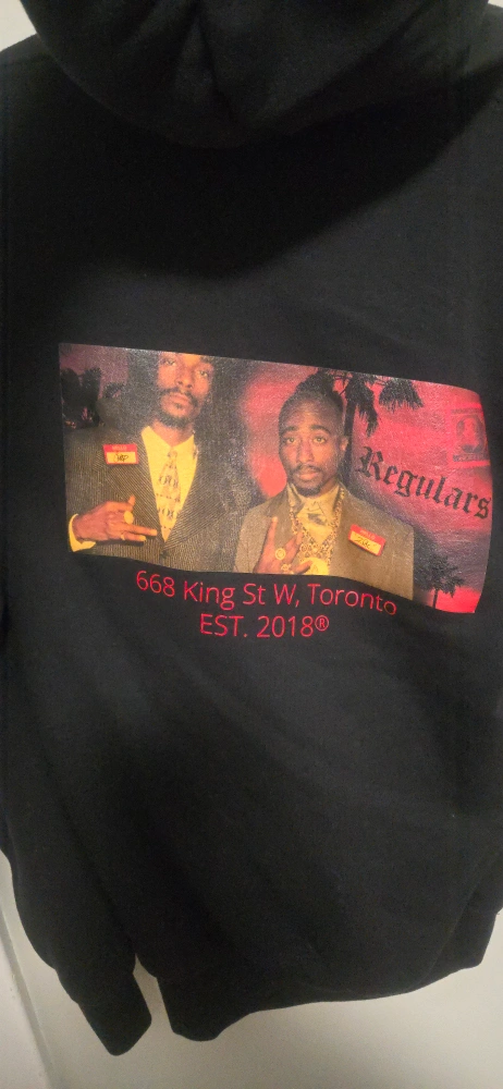 Black hoodie featuring Tupac and another individual on the back. Gold Regulars logo on sleeve. Size small. The Authentic T-Shirt Co. tag.