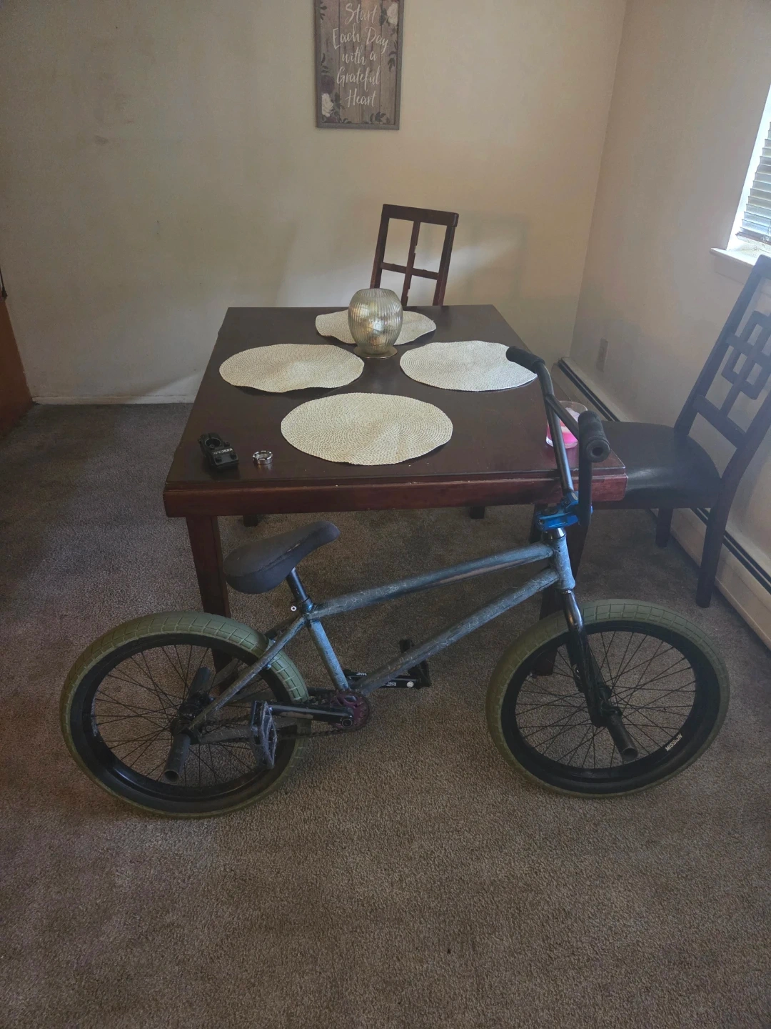 This is a BMX bike with a teal and blue camouflage frame. It has light green tires and black rims. It features a padded seat and black handlebars. This bike is great for tricks and stunts!