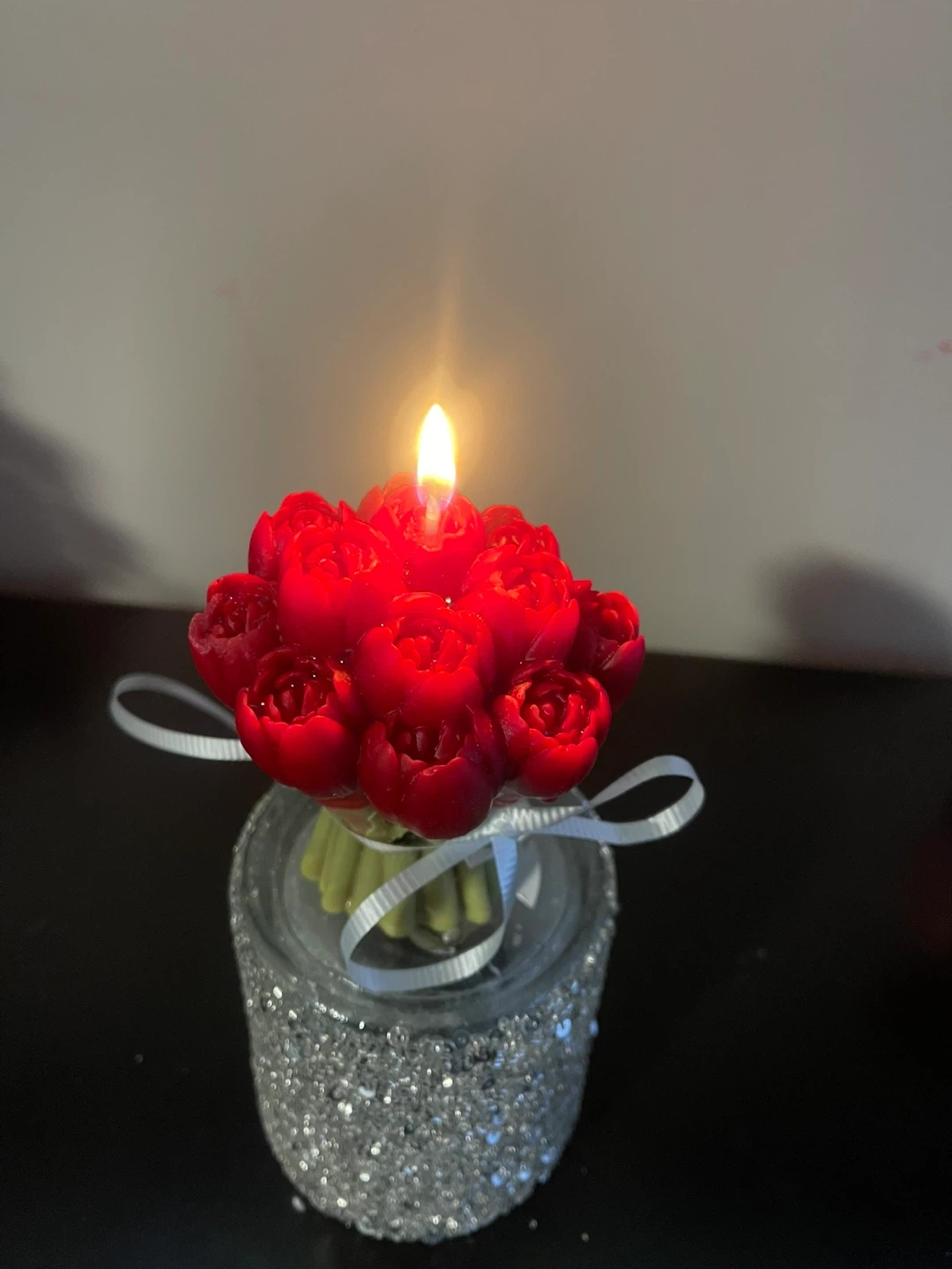 This beautiful candle is shaped like a bouquet of red tulips. It's perfect for adding a decorative touch to any room! Delivery included