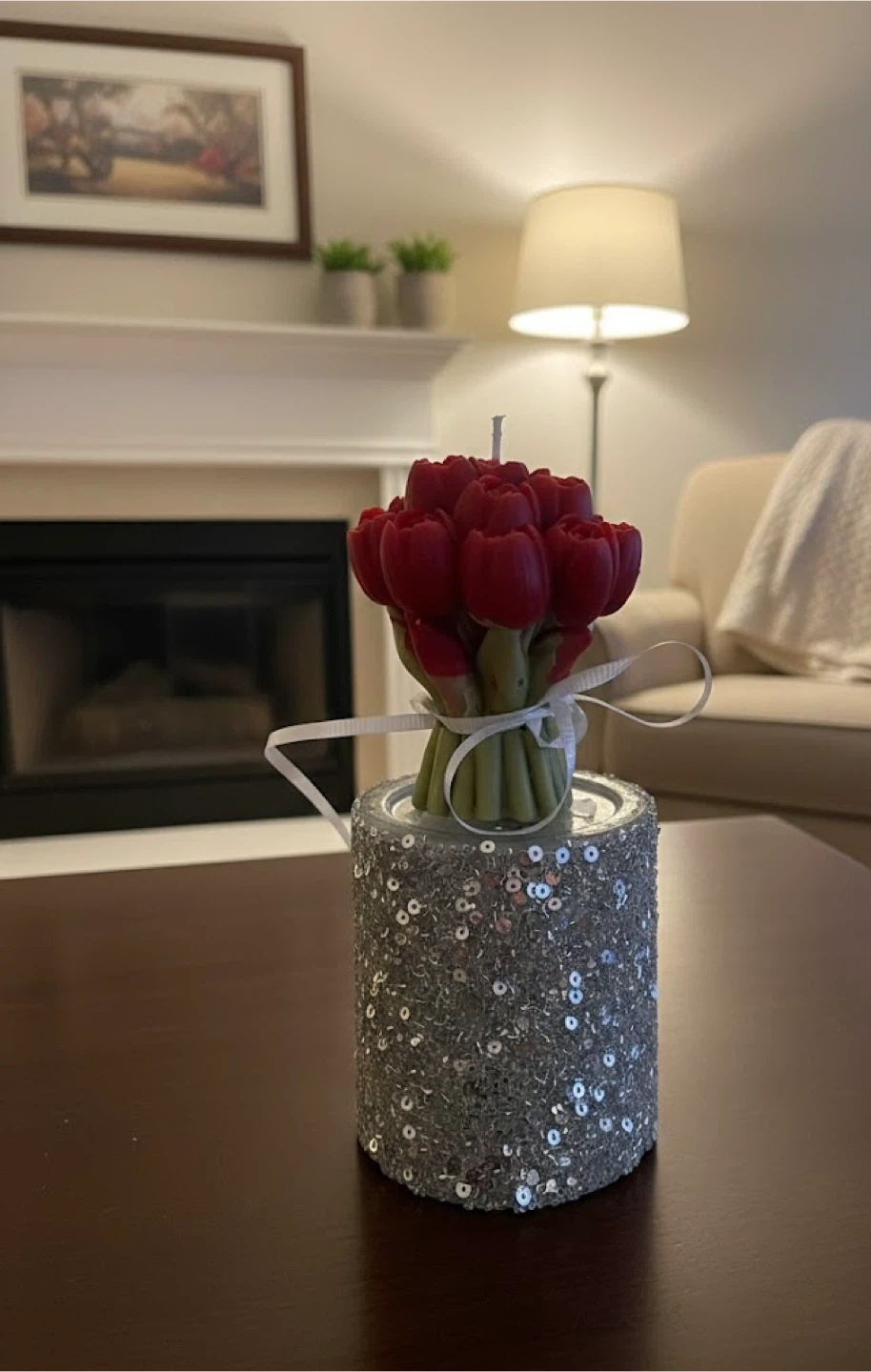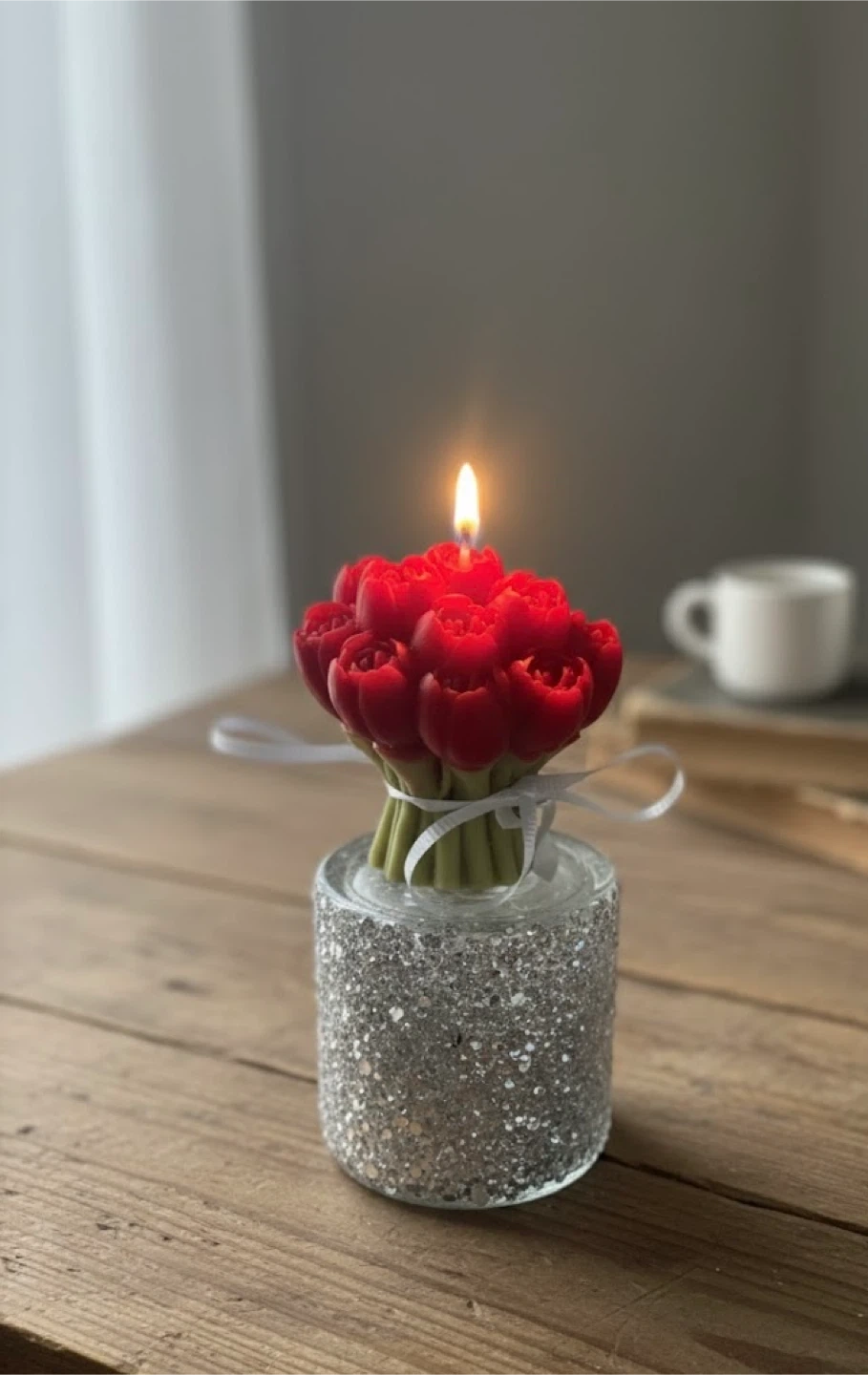 This beautiful candle is shaped like a bouquet of red tulips. It's perfect for adding a decorative touch to any room! Delivery included