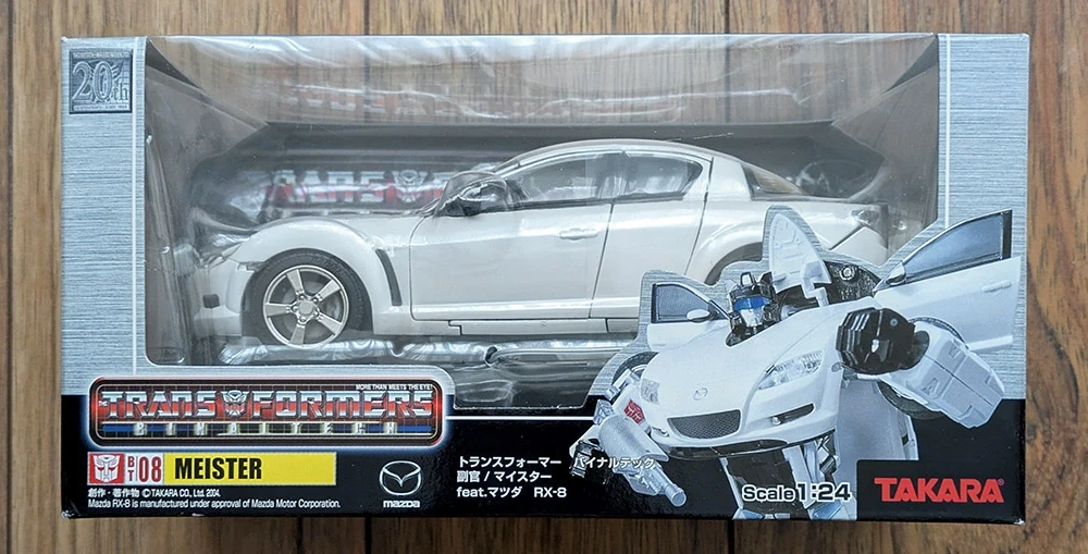 "Meister", BT-08, from the Transformers Binaltech line, brand new, factory sealed. Modelled after a white Mazda RX-8 in 1:24 scale.