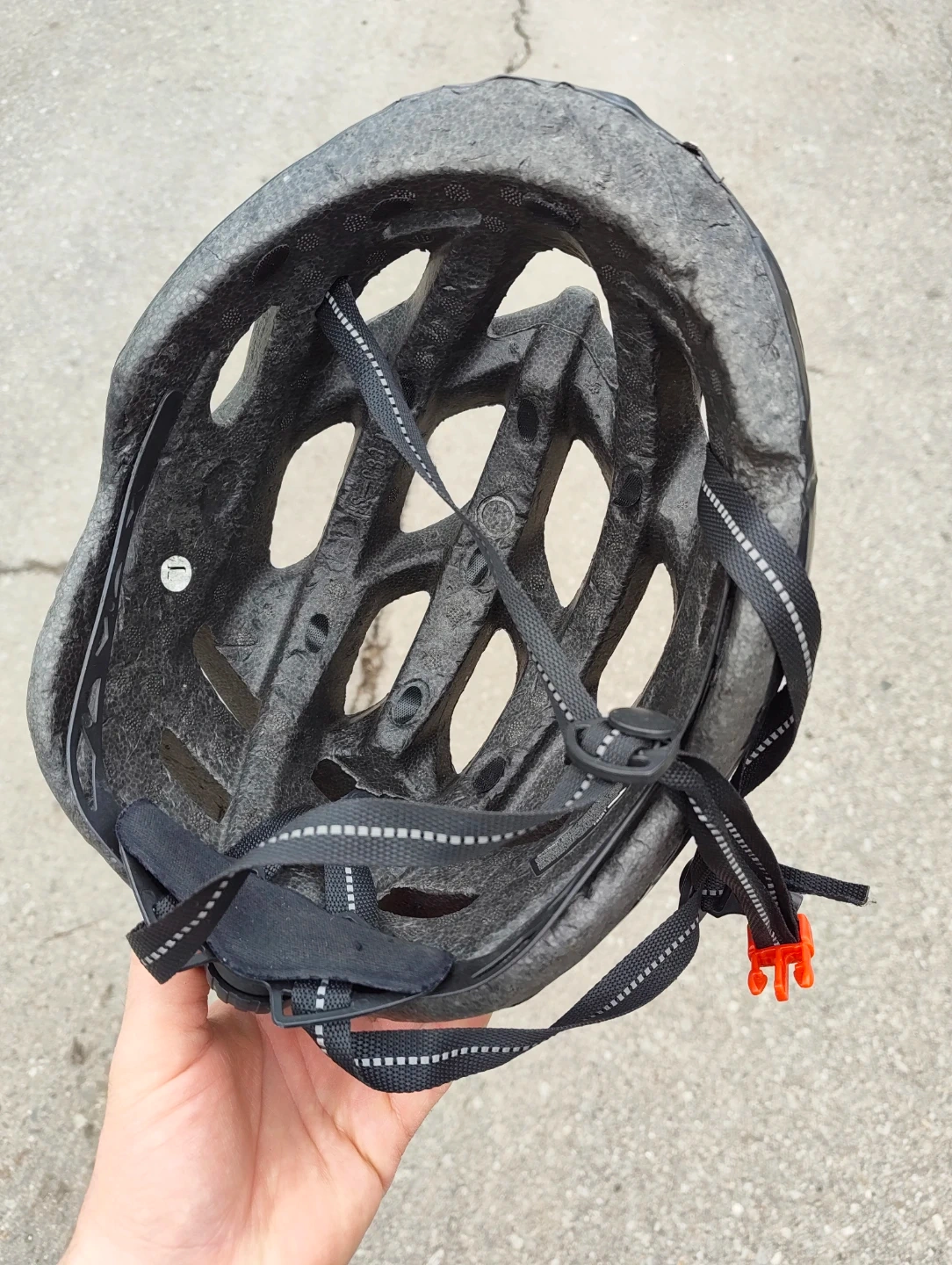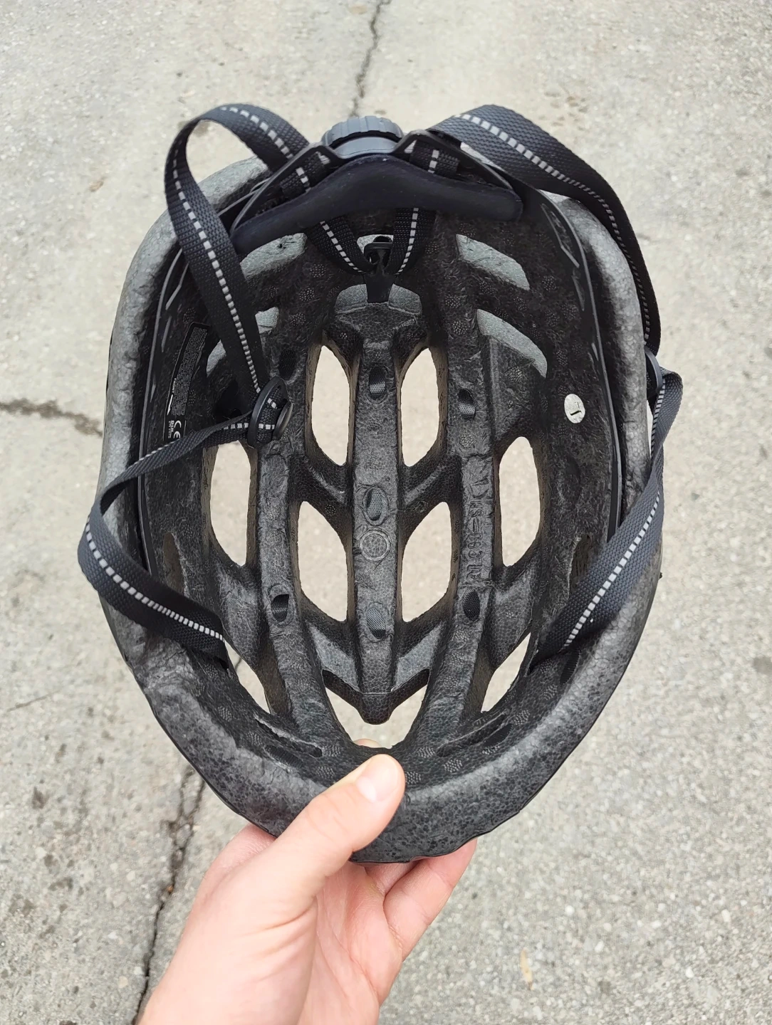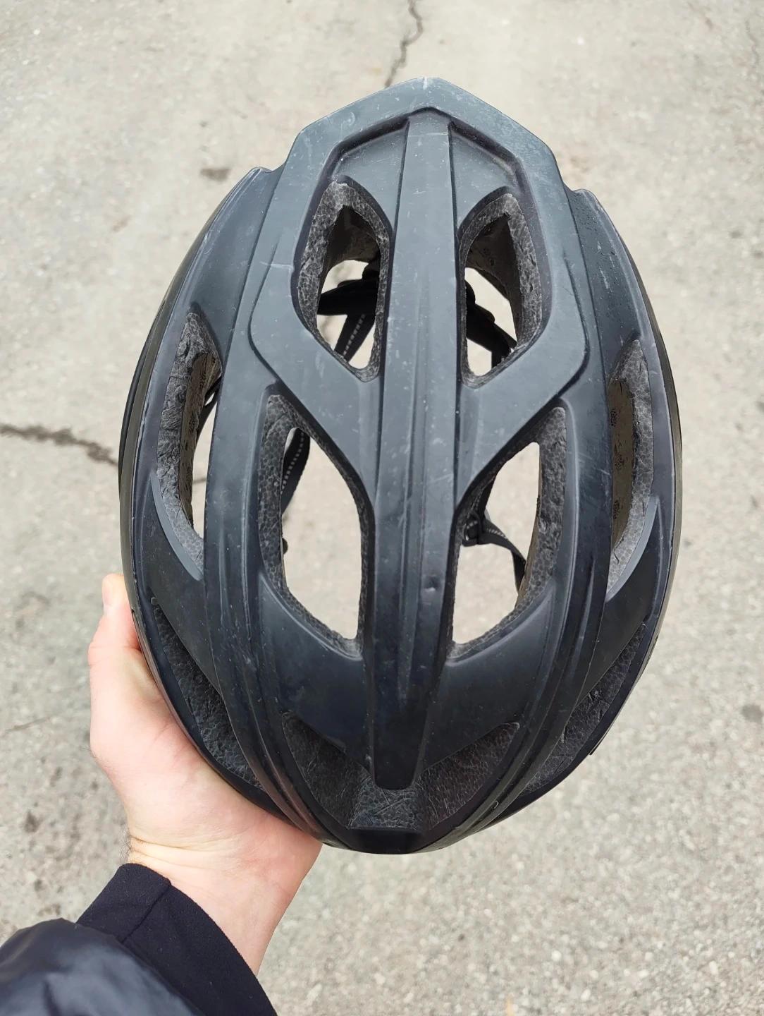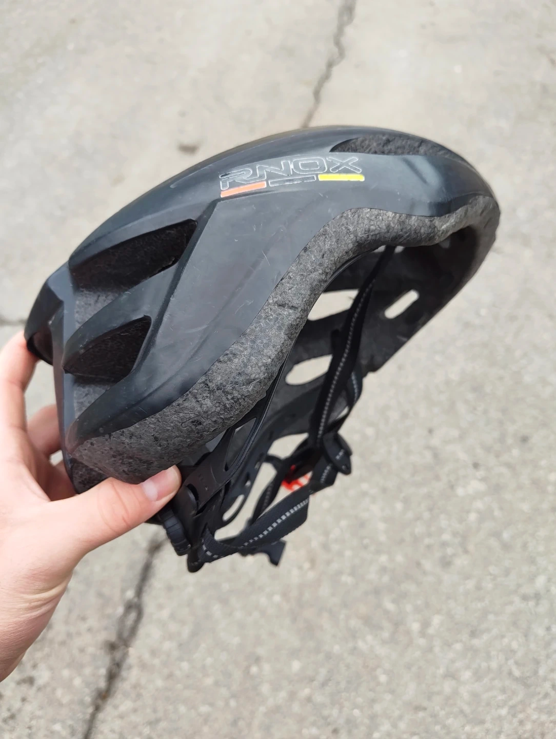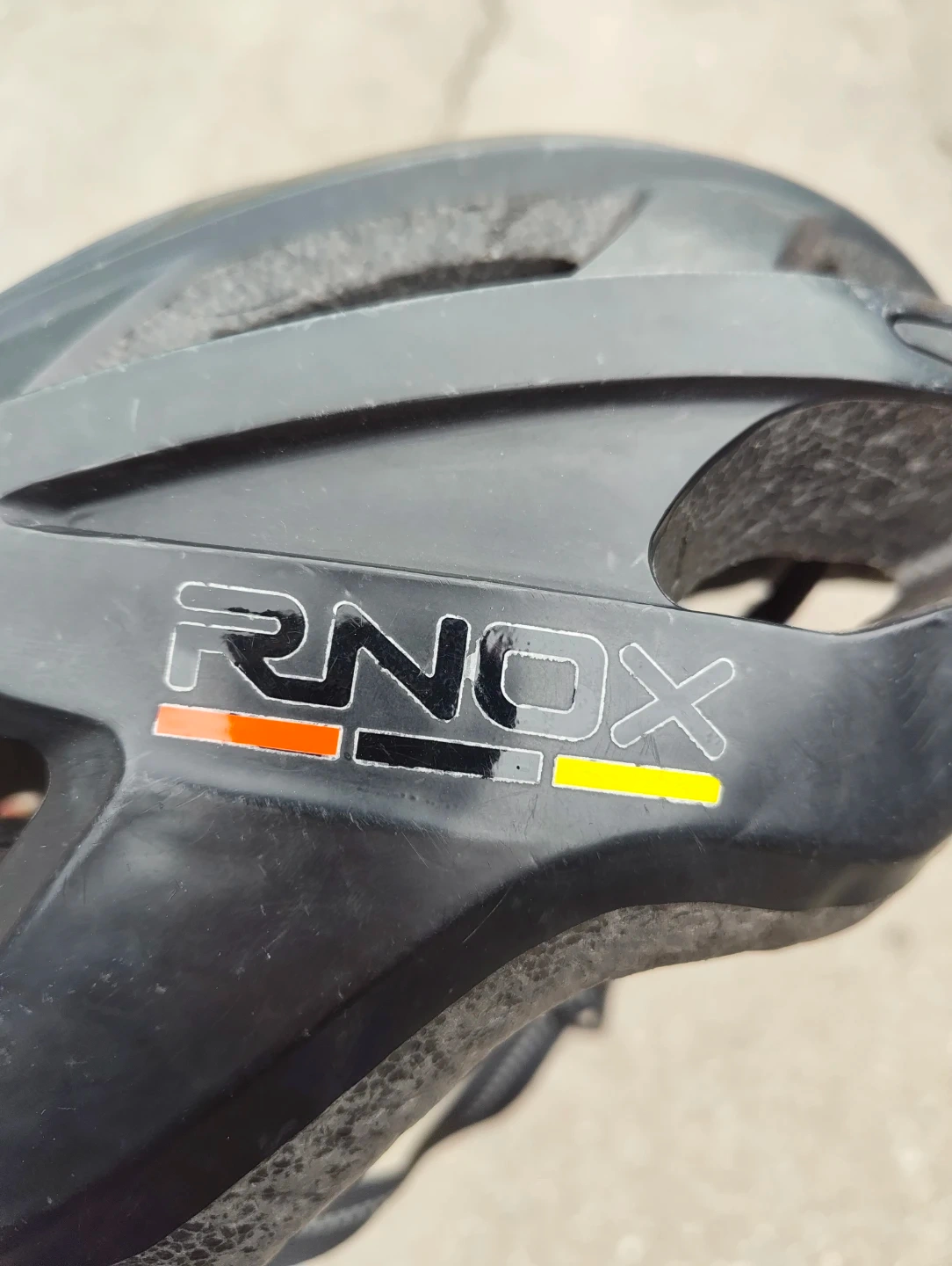 This RNOX helmet is black and includes adjustable straps for a secure fit. It's designed with vents for airflow. A size indicator is visible inside the helmet.