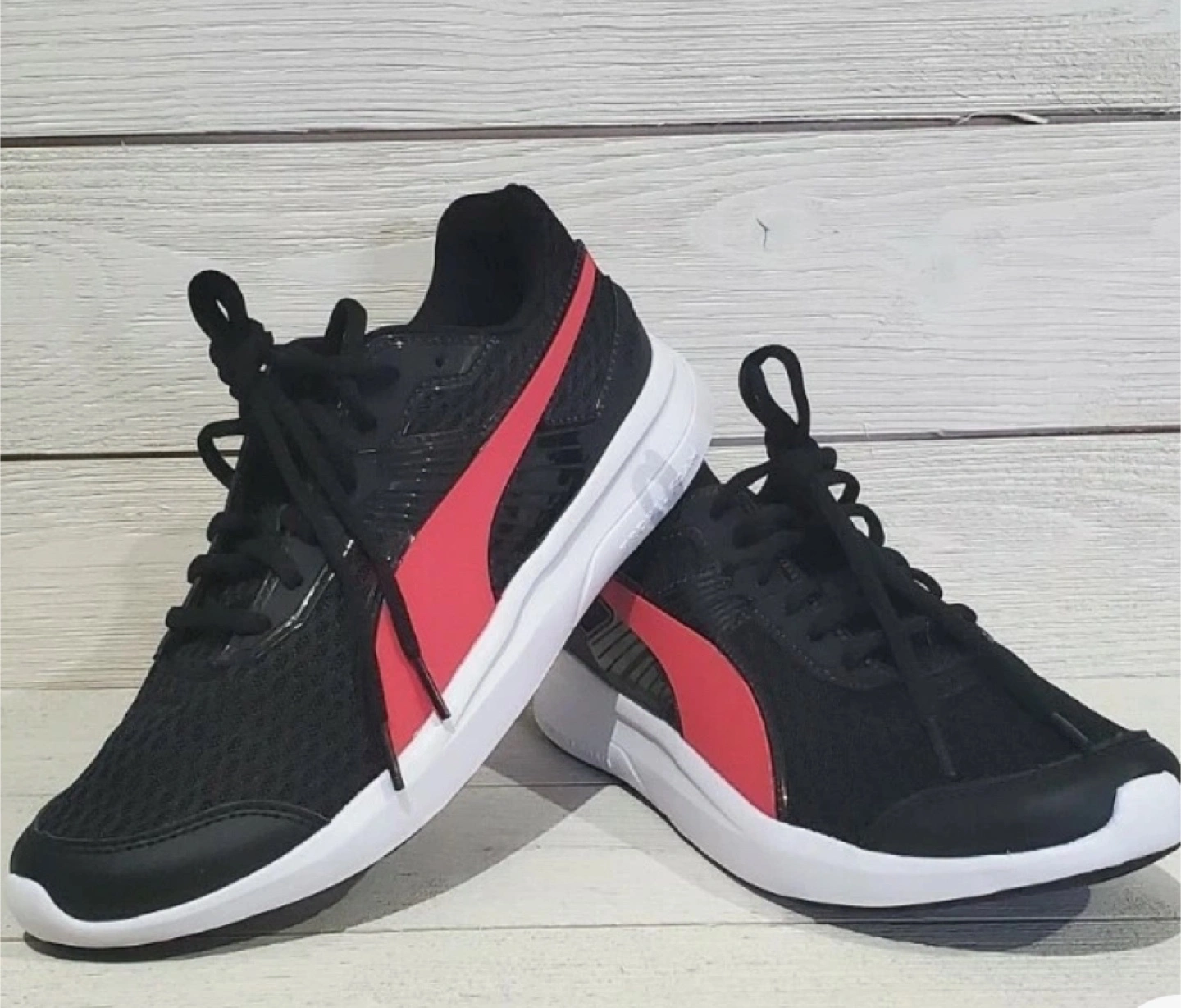 These are a pair of Puma running shoes, perfect for hitting the pavement or just running errands around town! They feature a sleek black design with a vibrant red Puma stripe on the side and a comfortable white sole.