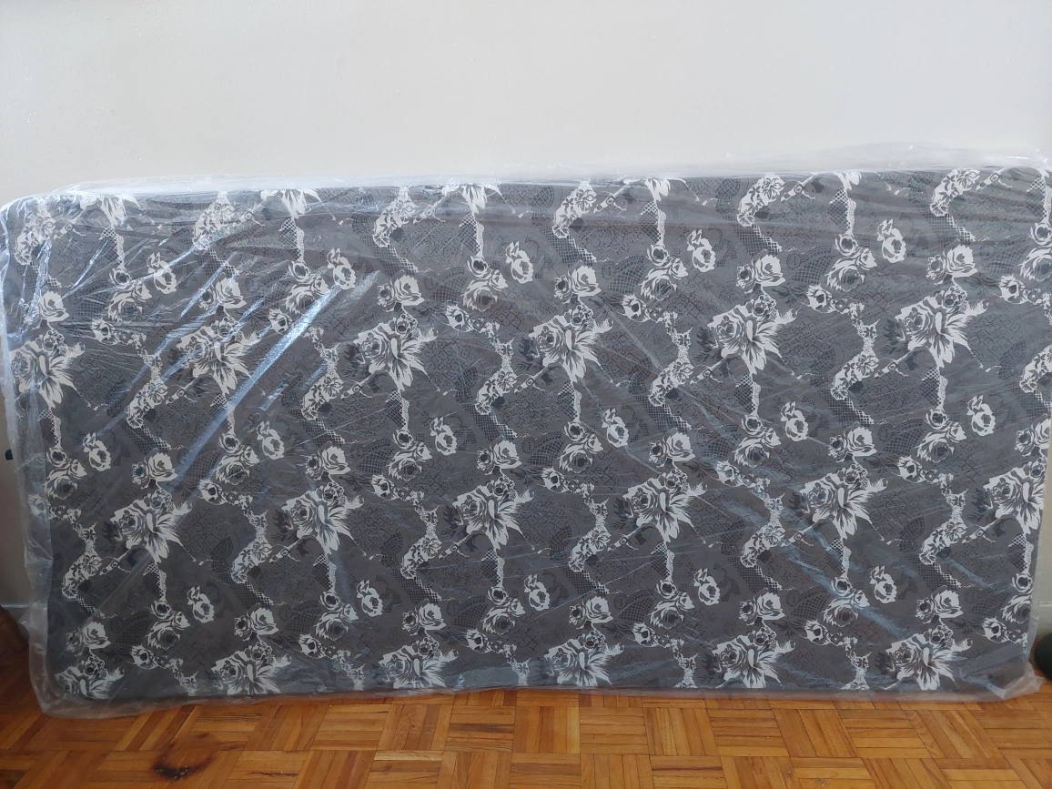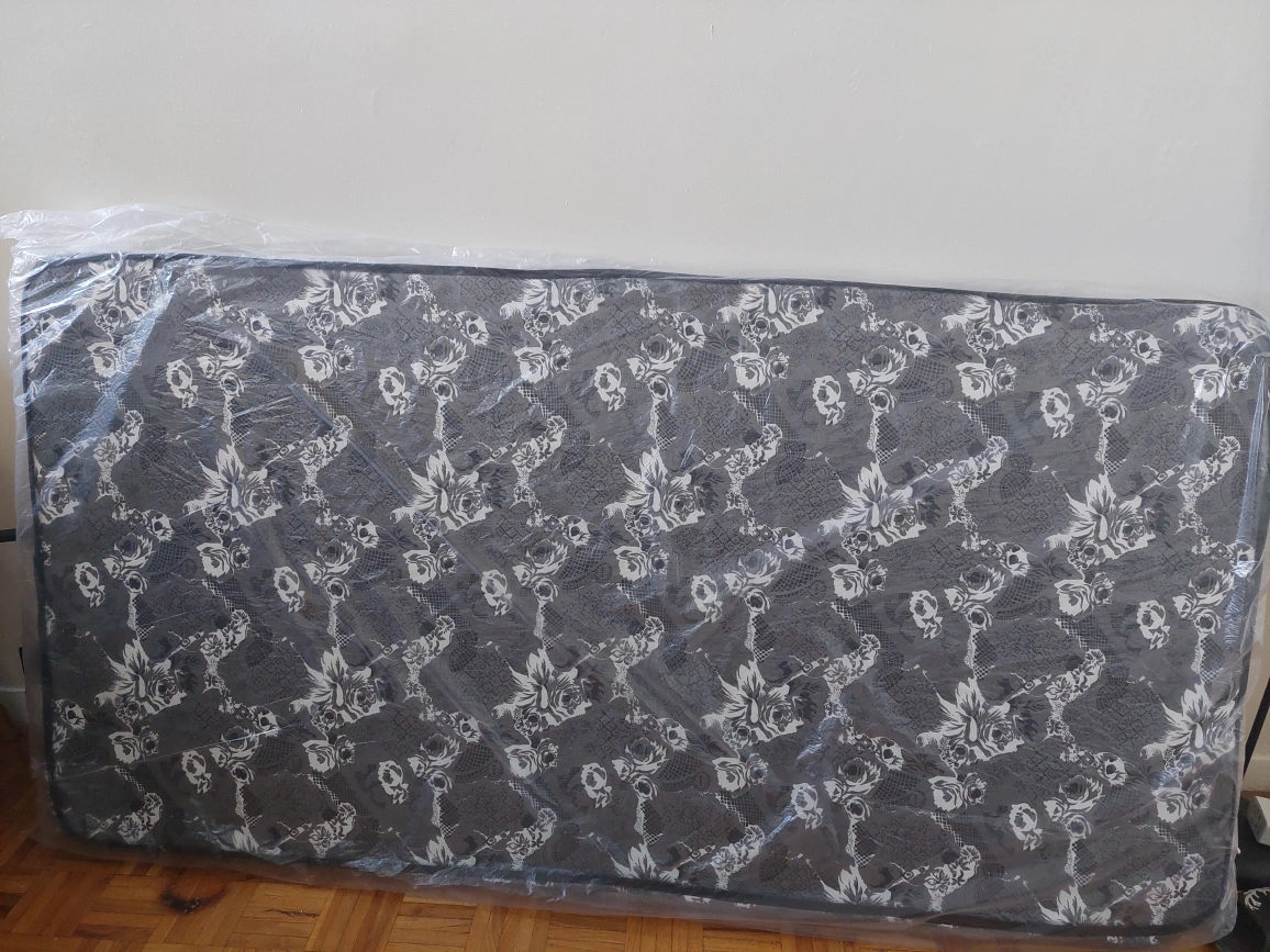 New single mattress with a floral print. It is wrapped in plastic and has never been used. The mattress is made of polyurethane foam and has a cotton and polyester cover. It is brand new and has never been opened. The mattress is made in Canada and is a high quality mattress for a great price. This is a great deal for someone looking for a new mattress
