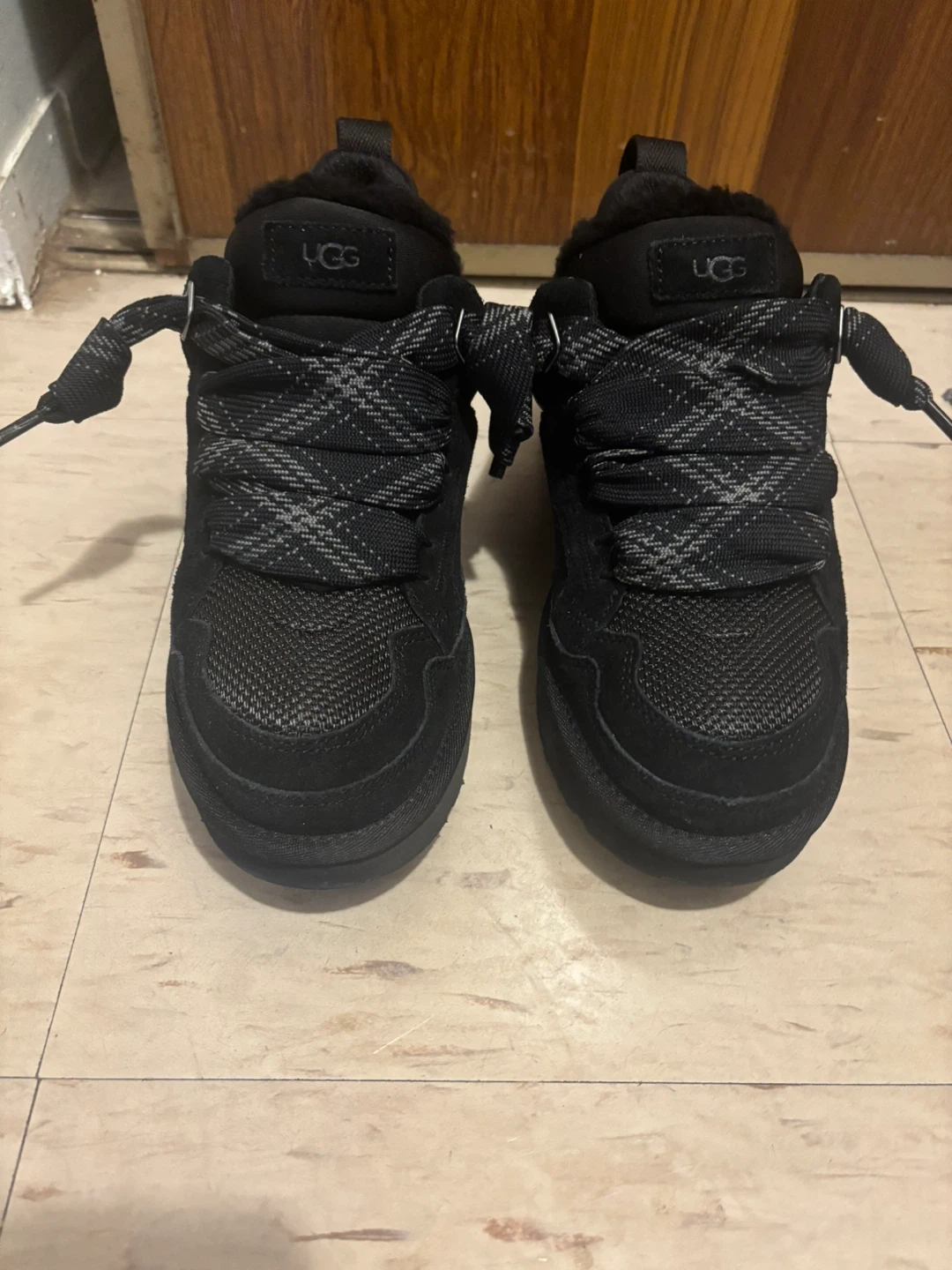 These black UGG sneakers feature a stylish lace-up design with a textured fabric and suede upper. They have a comfortable and warm fur lining. Perfect for casual wear and keeping your feet cozy! Worn once