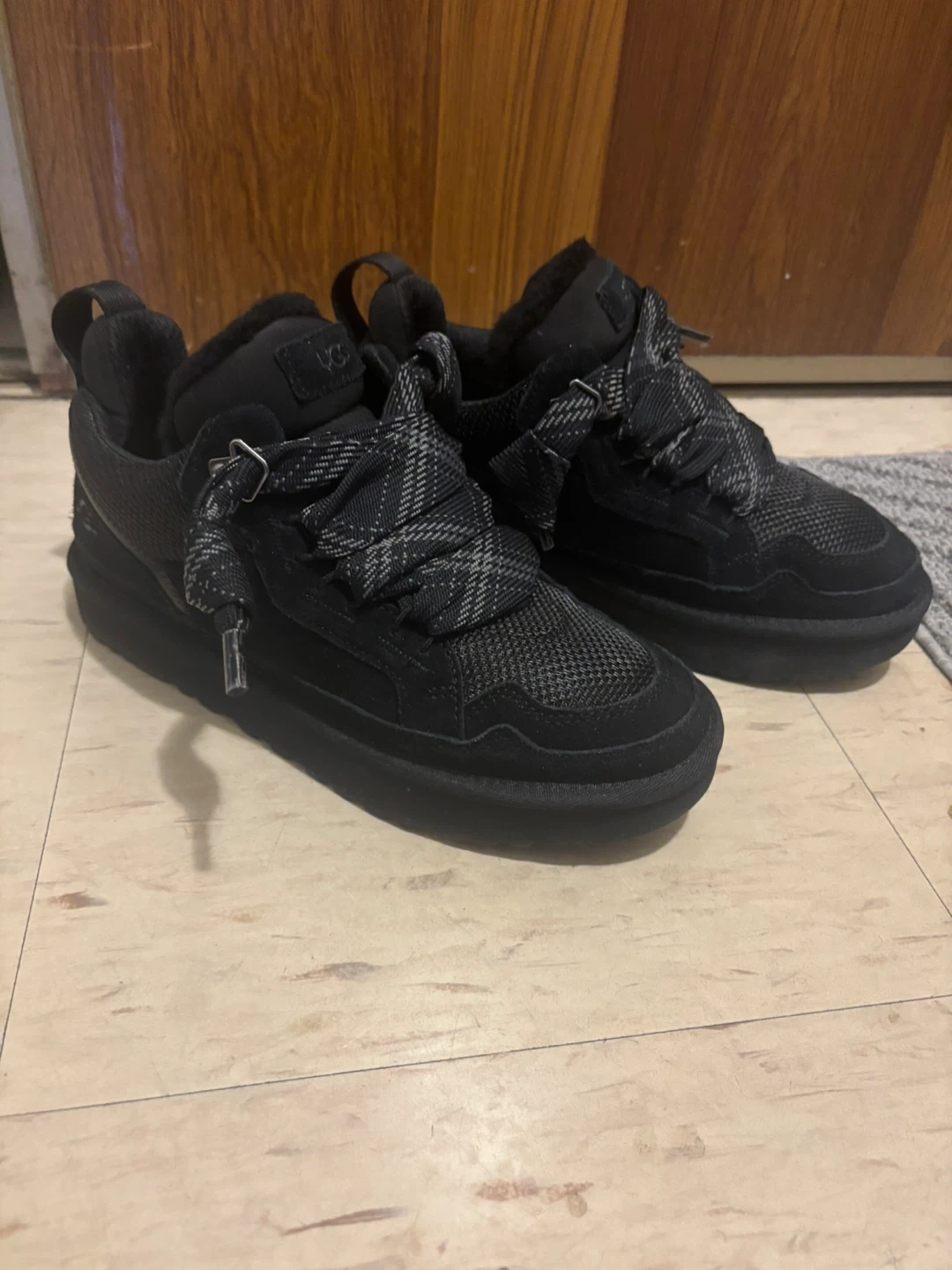 These black UGG sneakers feature a stylish lace-up design with a textured fabric and suede upper. They have a comfortable and warm fur lining. Perfect for casual wear and keeping your feet cozy! Worn once