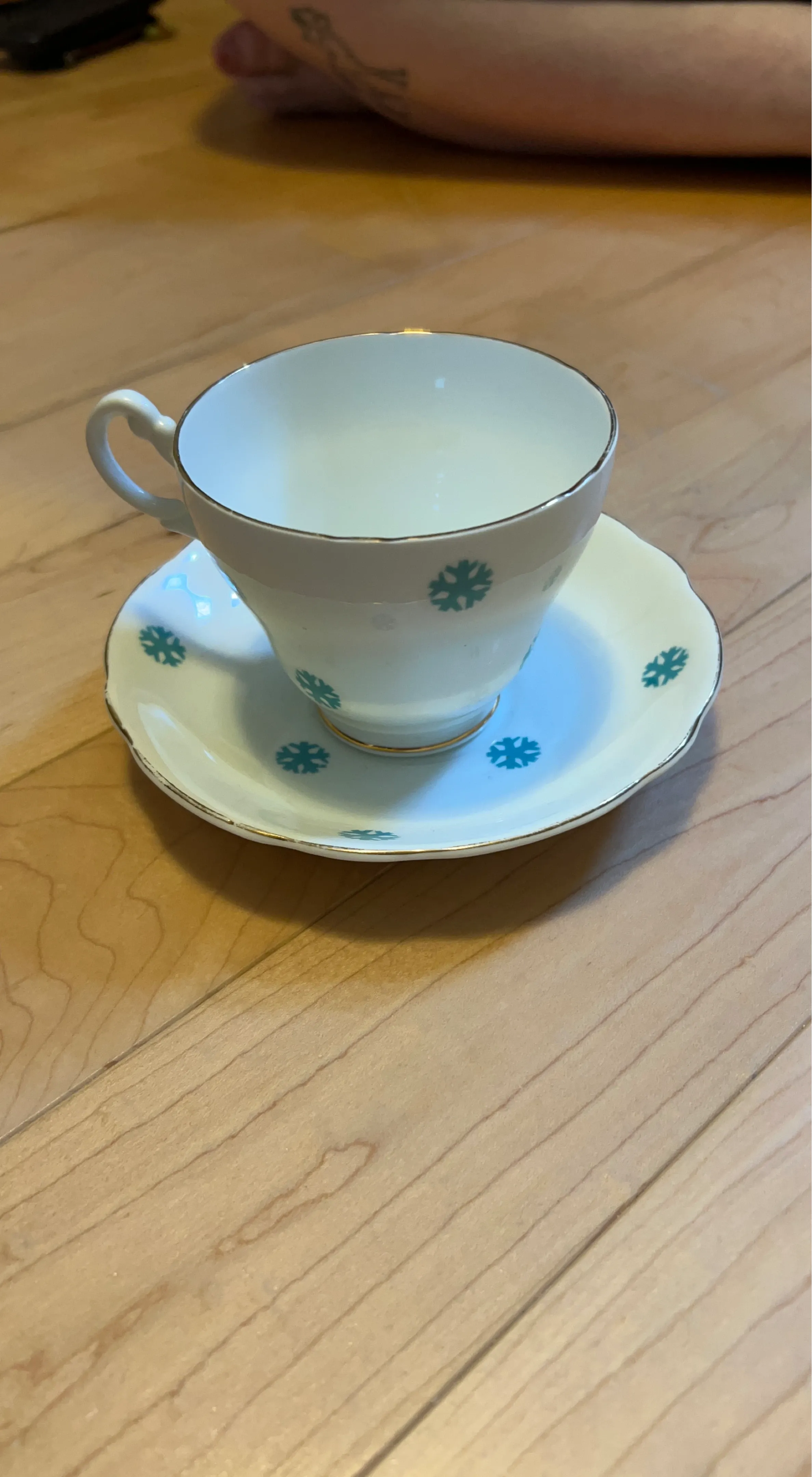 White Teacup and Saucer Set with Blue Snowflake Design