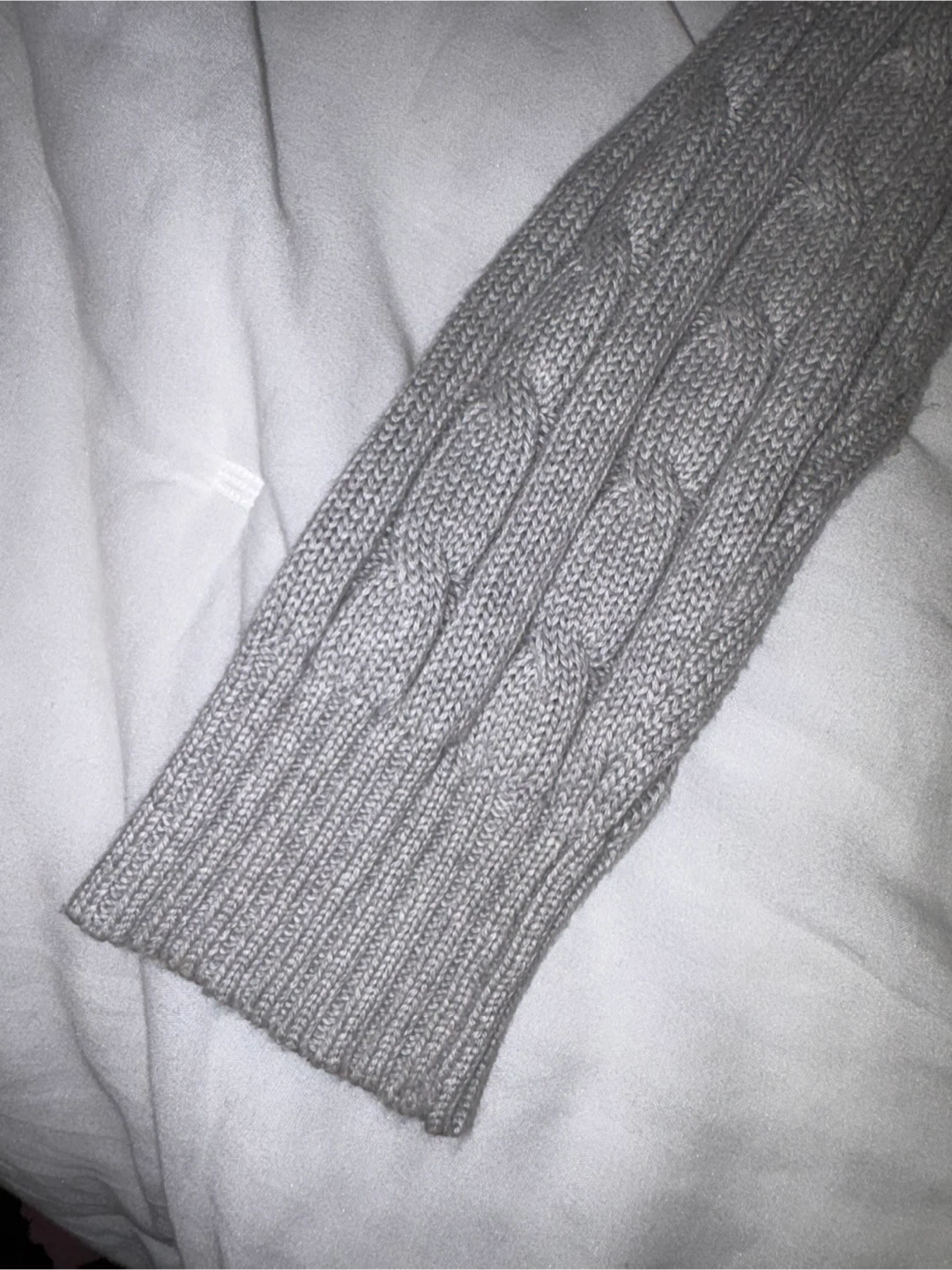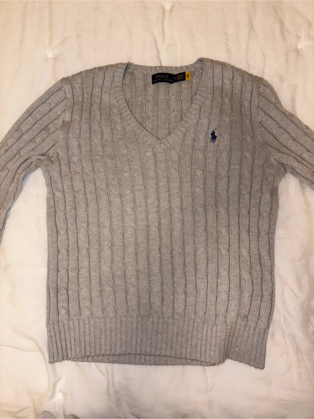 This is a Polo Ralph Lauren cable knit V-neck sweater in a size medium. It's a light grey colour with the signature pony logo embroidered on the chest. I wore it less than five times. Good condition!