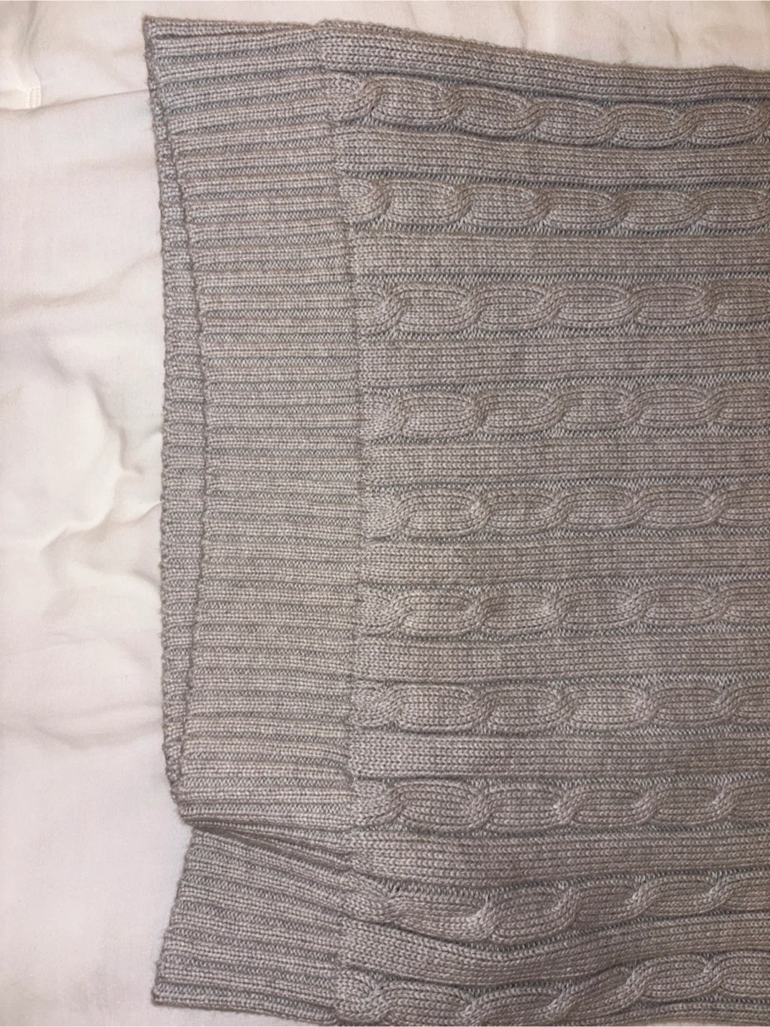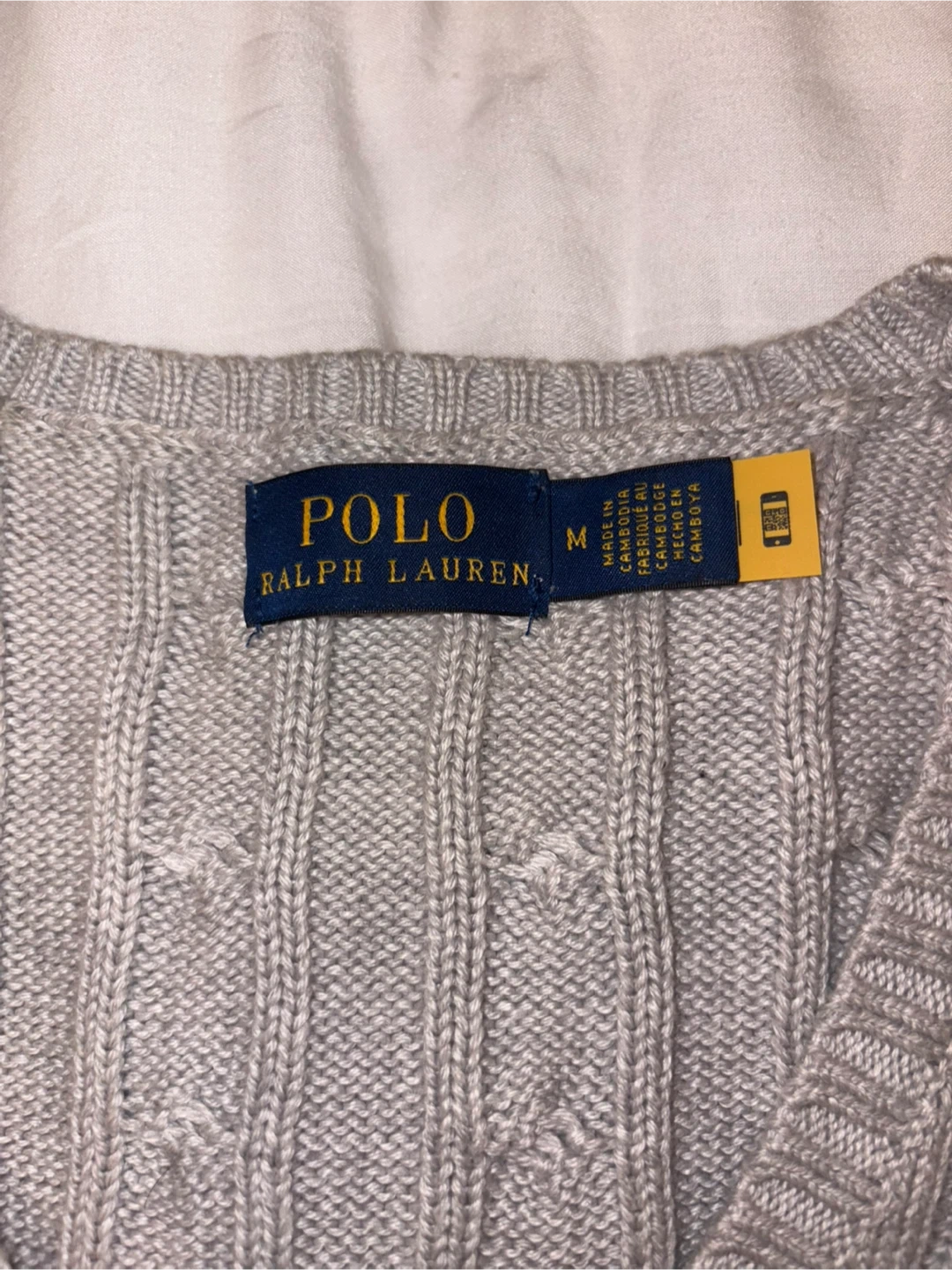 This is a Polo Ralph Lauren cable knit V-neck sweater in a size medium. It's a light grey colour with the signature pony logo embroidered on the chest. I wore it less than five times. Good condition!