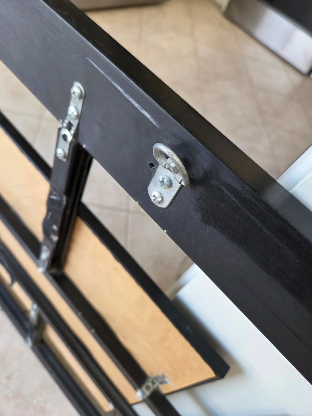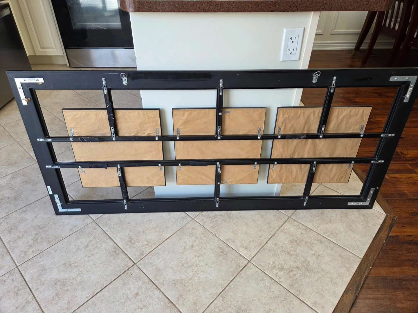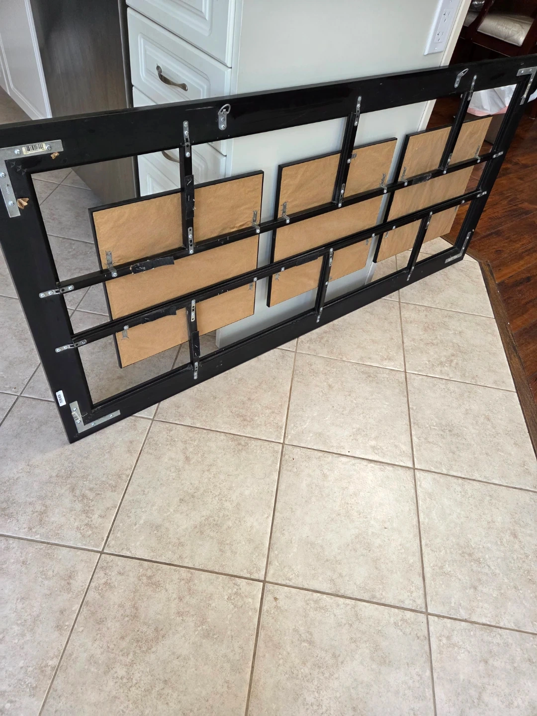 This is a black wall framed mirror with three square panels. It's designed with an interesting geometric pattern. The frame has a black finish.