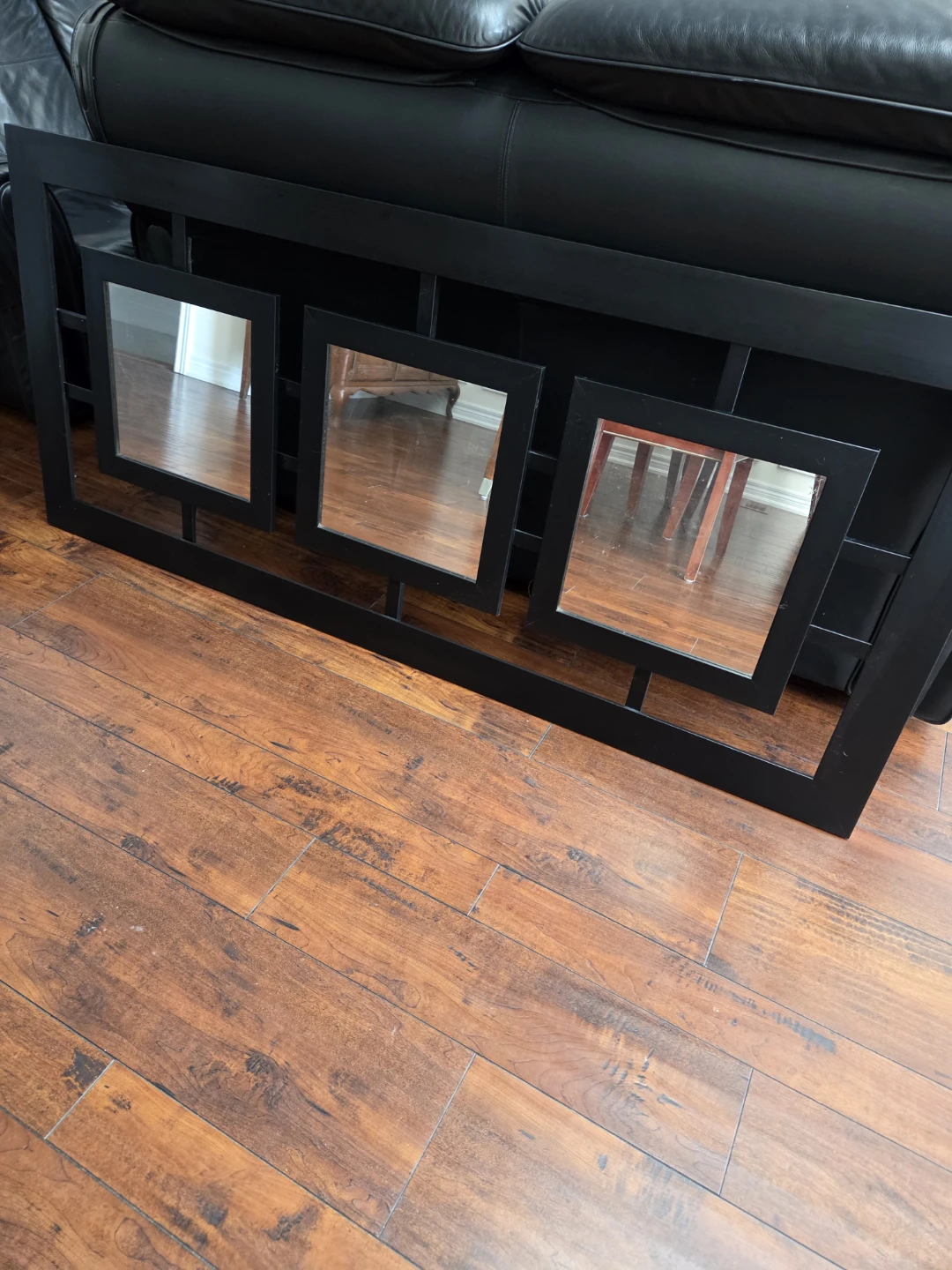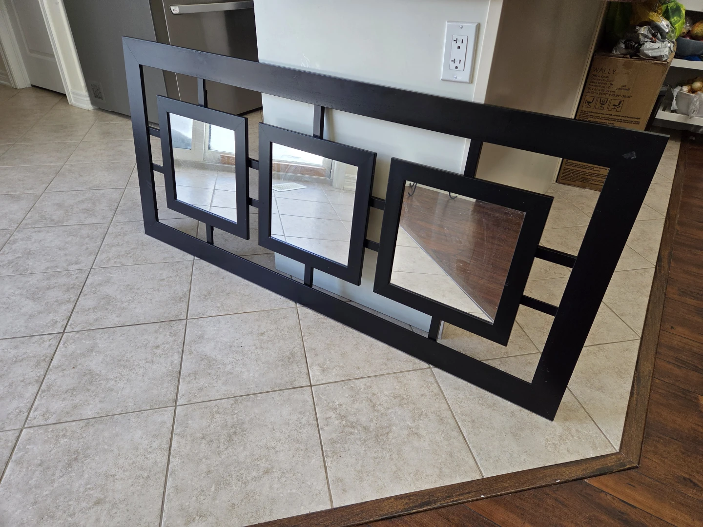 This is a black wall framed mirror with three square panels. It's designed with an interesting geometric pattern. The frame has a black finish.