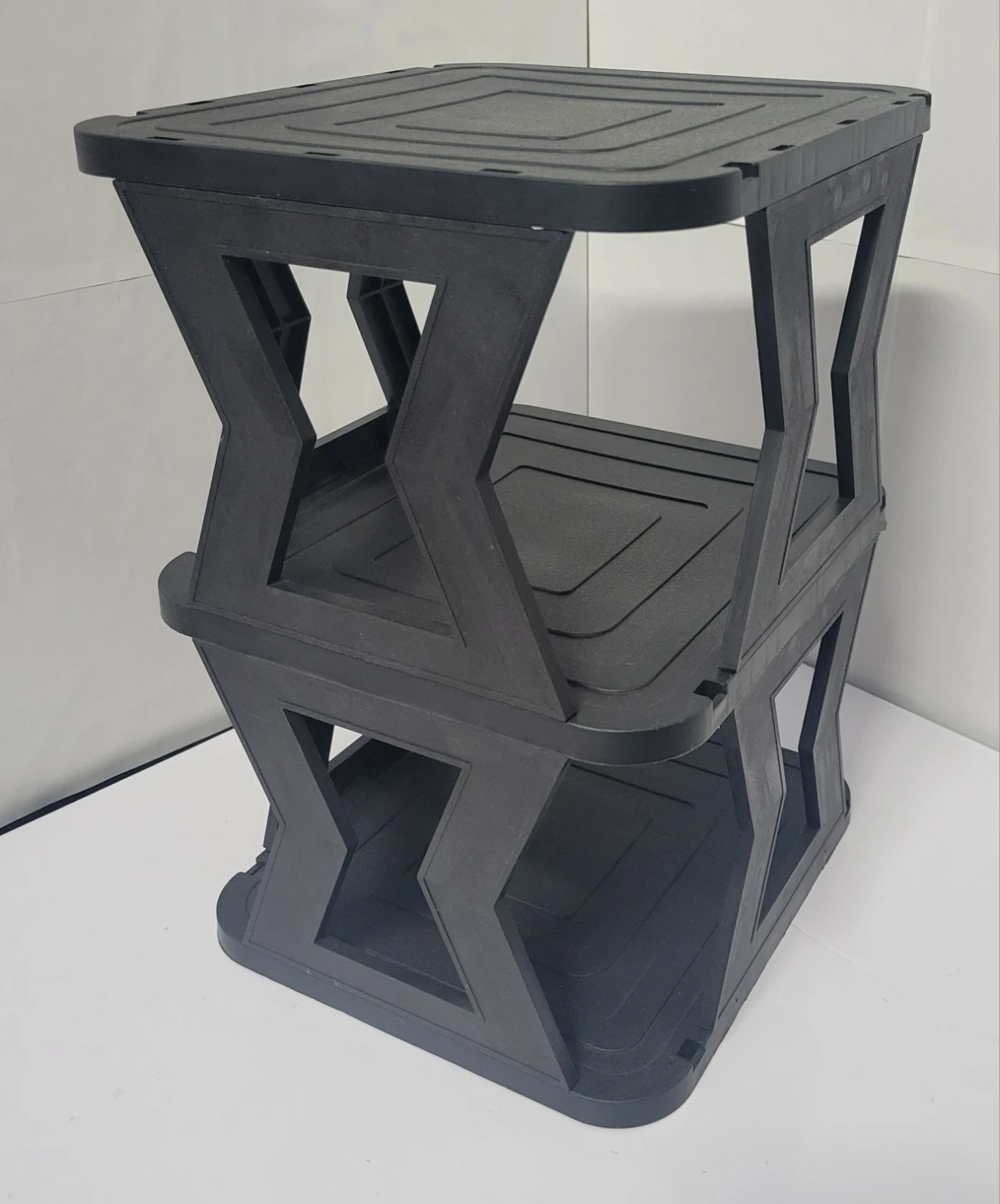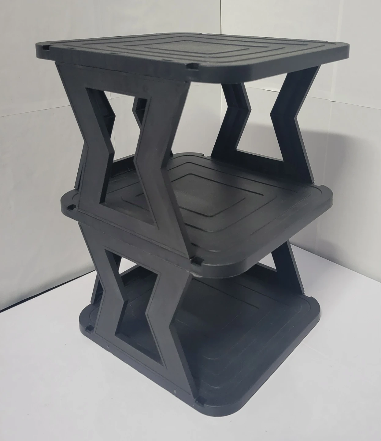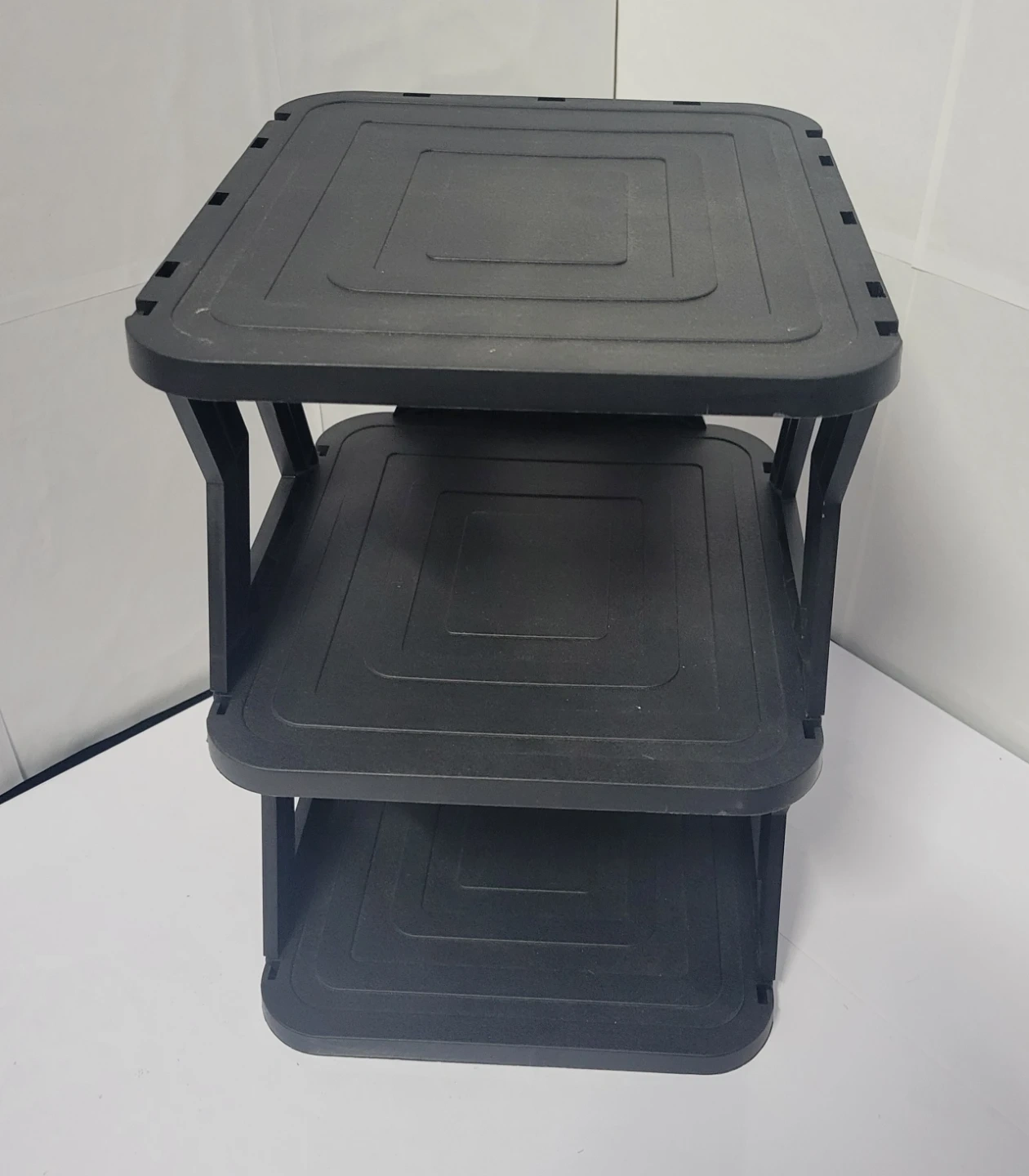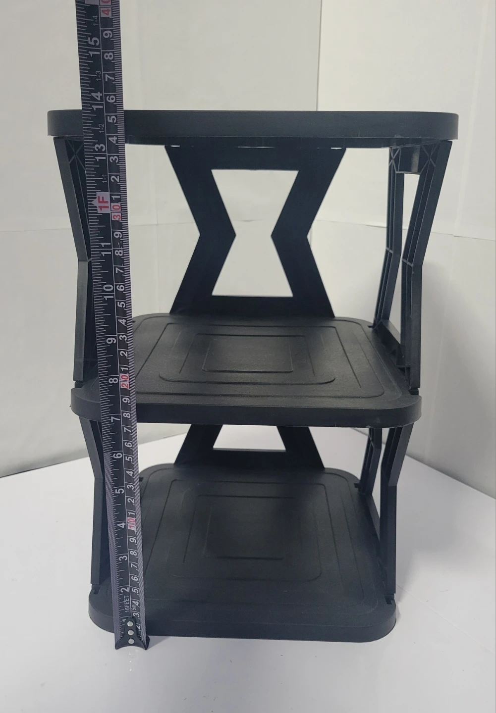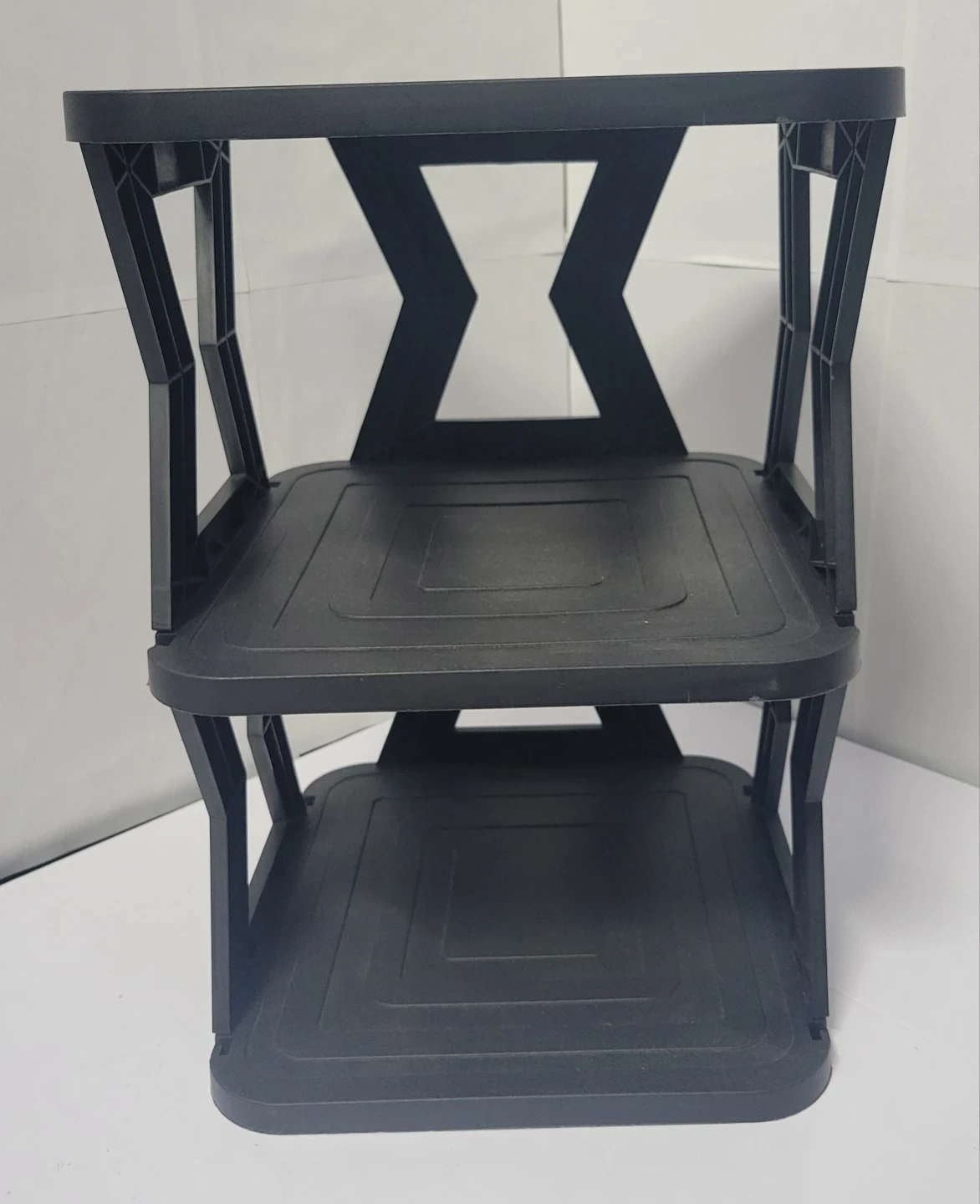 This is a black, 2-tier plastic shelf unit. It's made of durable plastic.
