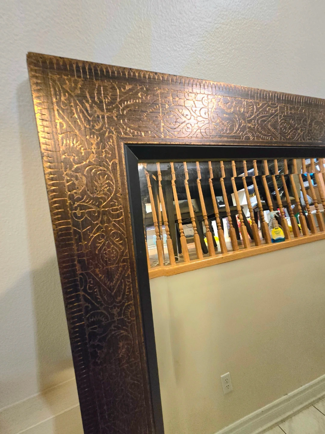 This is a decorative full-length mirror with an ornate, carved frame. It's a great size for a hallway or entryway at 29.5" × 63". The frame has a rustic, antique bronze finish. A few scuffs on the outside edges of the frame, but nothing major.