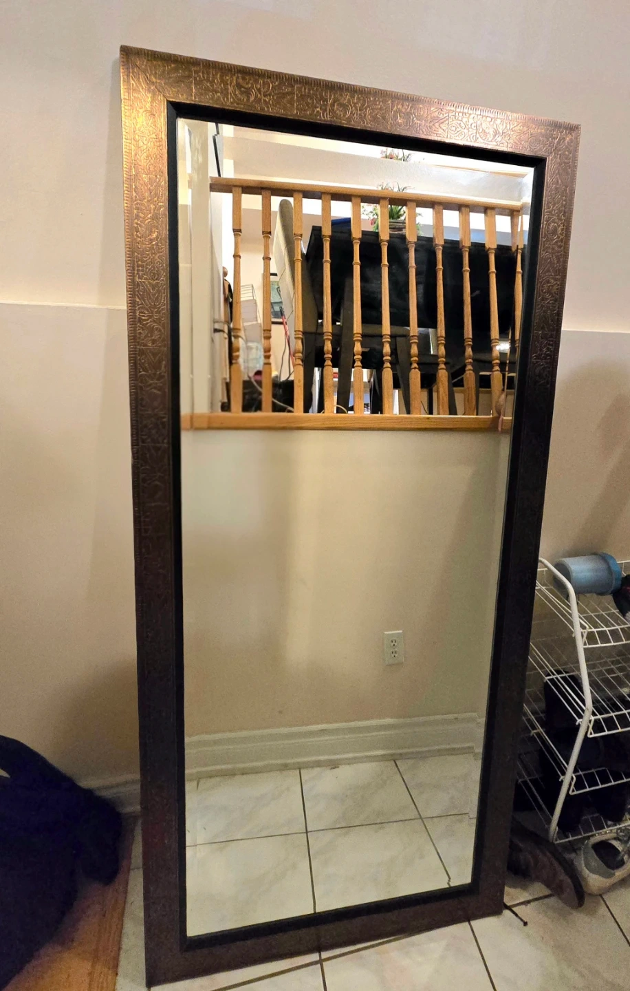 This is a decorative full-length mirror with an ornate, carved frame. It's a great size for a hallway or entryway at 29.5" × 63". The frame has a rustic, antique bronze finish. A few scuffs on the outside edges of the frame, but nothing major.