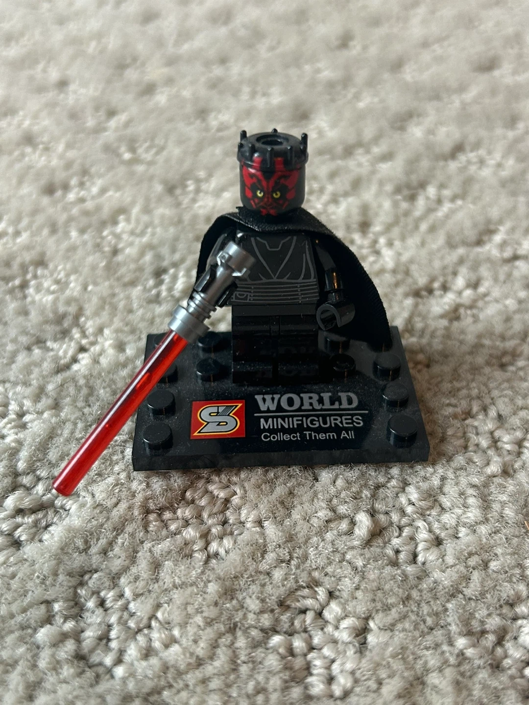This is a LEGO Star Wars Darth Maul minifigure. It comes with a black cape and a red lightsaber (half is missing). The minifigure is displayed on a black base with 'World Minifigures Collect Them All' printed on it.