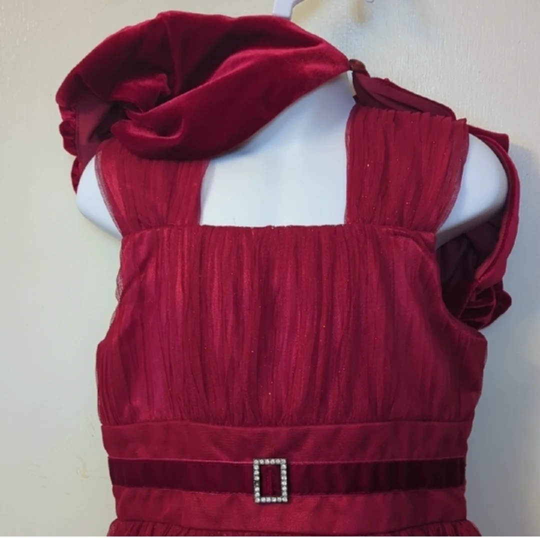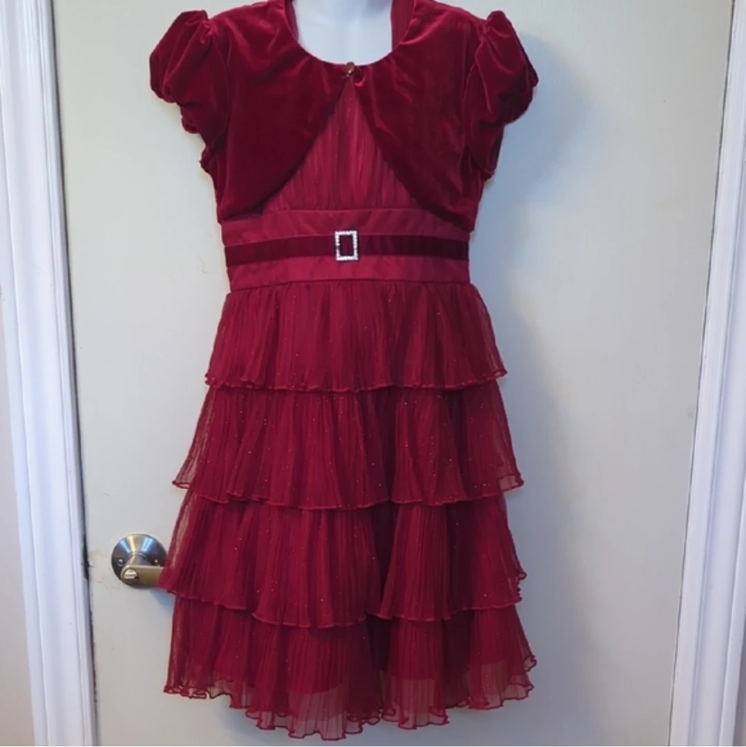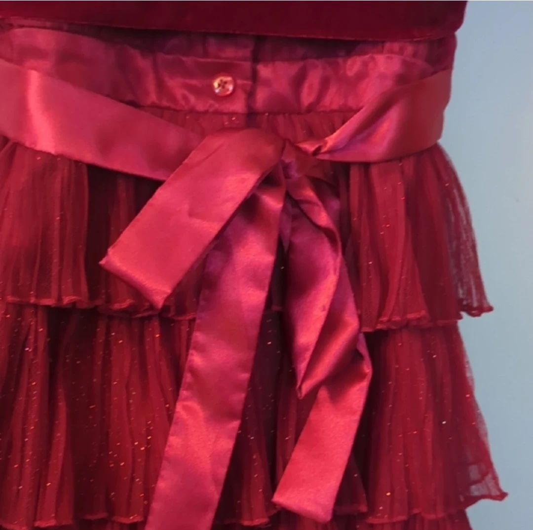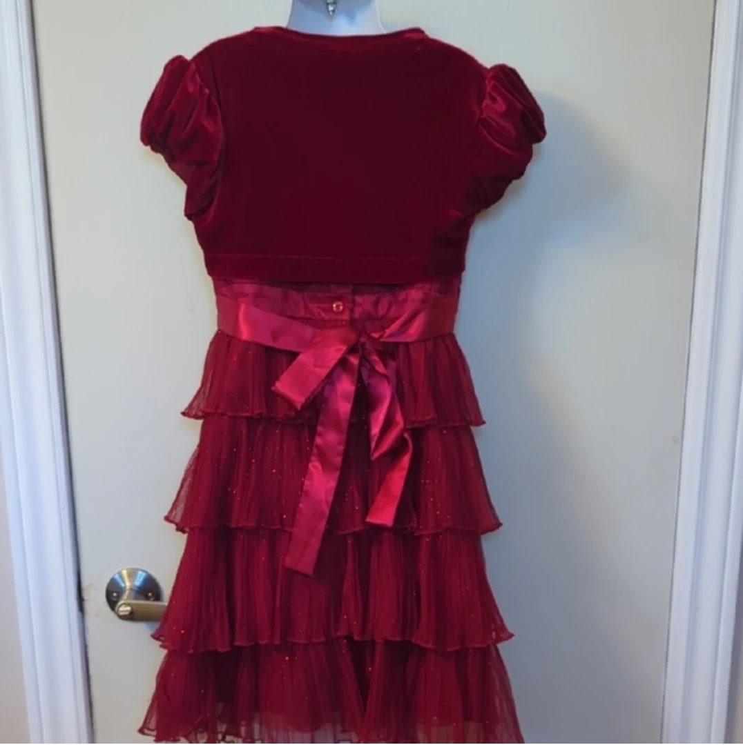Pretty red velvet and tulle dress by Jona Michelle. It features a velvet bolero style top with puffed sleeves and a tiered, glittery tulle skirt. The dress has a satin sash tied at the back. Perfect for special occasions!