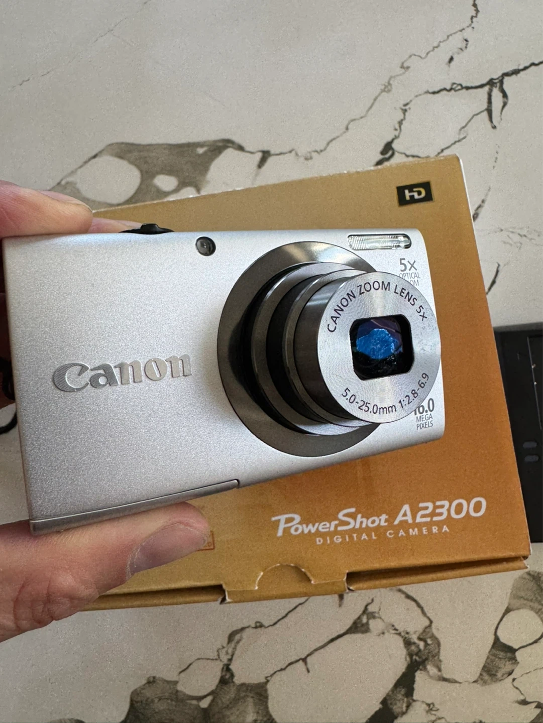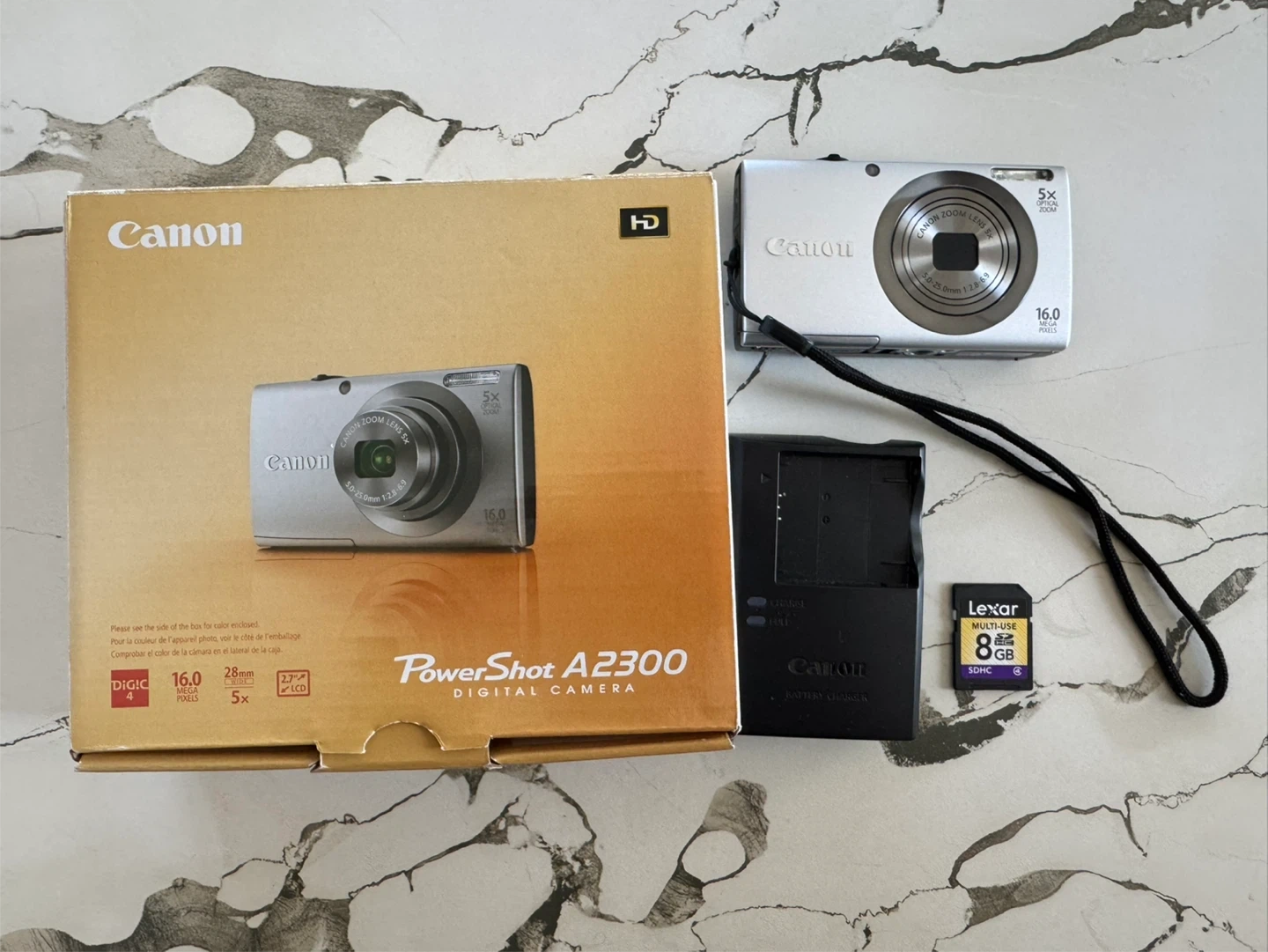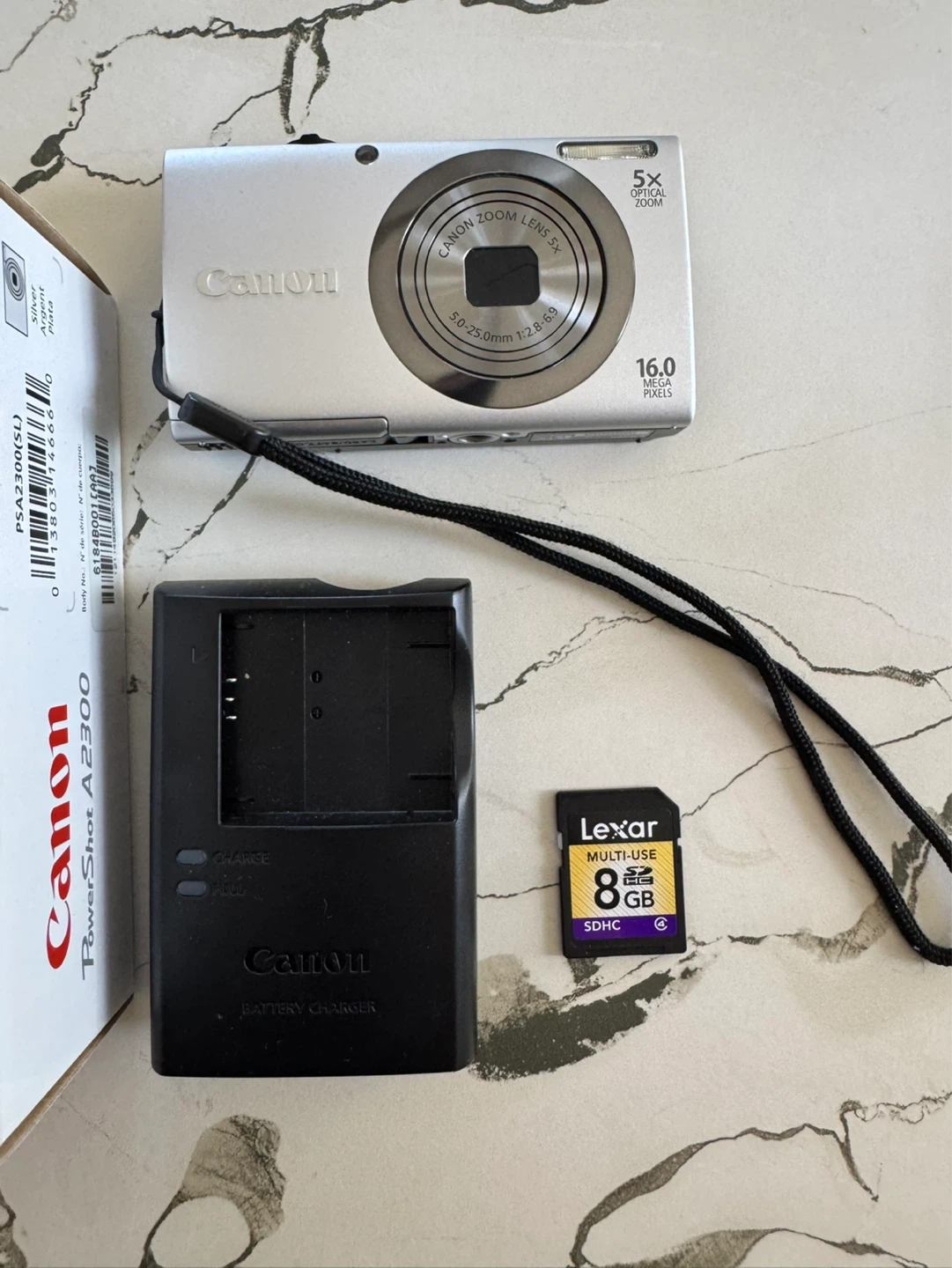 This is a silver Canon PowerShot A2300 digital camera. It's a 16.0-megapixel camera with 5x optical zoom. Includes battery charger and 8GB SD card.